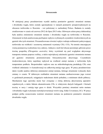 Streszczenie W niniejszej pracy przedstawiono wyniki analizy pomiarów gęstości strumieni metanu i dwutlenku węgla, które zostały zgromadzone w ramach pomiarów przeprowadzonych na obszarze torfowiska w Rzecinie - wsi położonej w zachodniej Polsce. Badania te zostały zrealizowane w czasie od czerwca 2012 do lipca 2013 roku. Głównym celem pracy doktorskiej była analiza zmienności strumieni metanu i dwutlenku węgla na torfowisku w Rzecinie. Zmienność ta była analizowana pod kątem wpływu wybranych czynników środowiskowych na gęstość obu tych strumieni. Przeanalizowano również wpływ rodzaju roślinności pokrywającej torfowisko na wielkość i sezonową zmienność wymiany CH4 i CO2. Na terenie otaczającym wieżę pomiarową wydzielono trzy sektory. Jednym z nich był obszar porośnięty głównie przez trzcinę pospolitą (Phragmites australis), który wyróżniał się pod względem aktywnego transportu metanu poprzez rośliny, a także największej zależności gęstości strumienia metanu od gęstości strumienia promieniowania fotosyntetycznie aktywnego. Czynnikiem środowiskowym, który najsilniej wpływał na wielkość emisji metanu z torfowiska była temperatura podłoża. Bezpośrednio wpływa ona na mikrobiologiczną produkcję CH4 oraz wielkość utleniania i w konsekwencji na całkowitą emisję tego gazu. W pracy przedstawiono także wyniki analizy dobowej zmienności emisji metanu, którego strumienie wykazały duże zmiany w czasie. W dobowym rozkładzie strumieni metanu zaobserwowano jego wzrost w godzinach porannych, osiągnięcie maksimum około południa, a minimum około północy. Mechanizm tego zjawiska może być związany z różną dobową aktywnością aparatów szparkowych, a także faktem akumulowania CH4 w relatywnie dużych łodygach i liściach trzciny w nocy i emisją tego gazu w dzień. Wszystkie pomiary strumieni netto metanu i dwutlenku węgla wykonano metodą kowariancji wirów (ang. Eddy Covariance, EC). W pracy podjęto próbę oszacowania wartości strumieni metanu na podstawie pomiarów strumieni dwutlenku węgla. Abstract This thesis presents results of analysis of the net flux densities of methane and carbon dioxide, which have been collected during measurements carried out on the peatland in Rzecin - a village in western Poland. These studies were completed in time from June 2012 to July 2013. The main objective of the dissertation was to analyze the variability of the measured methane fluxes with eddy covariance method on the peatland in Rzecin. This variability was also analyzed in terms of the impact of selected environmental factors on the flux density of methane and carbon dioxide exchanged between the peatland and the atmosphere. Also analyzed the impact of the type of vegetation covering the peat bog on the size and seasonal variation of CH 4 and CO2 exchange. In the area surrounding the measuring tower separated three sectors. The first was the area covered mainly by common reed (Phragmites australis), which stood out in terms of active transport of methane by plants, and the largest methane flux density depending on photosynthetically photon flux density. Environmental factor that most strongly affected the emission of methane from bogs was the temperature of the substrate. Directly affect the microbial production of CH4 and its oxidation, the volume and consequently the total emission of this gas. The thesis presents also the results of the analysis of diurnal variation of methane emission, which showed the growth in the mornings, achieving a peak around noon, with a minimum around midnight. The mechanism of this phenomenon may be related to different daily activity of stomata and the fact of the CH4 accumulation in relatively large stems and leaves at night and the emission of this gas during the day. Measurement of the methane and carbon dioxide fluxes were made using eddy covariance method (EC). The thesis attempts to estimate the value of methane fluxes based on carbon dioxide fluxes measurements.