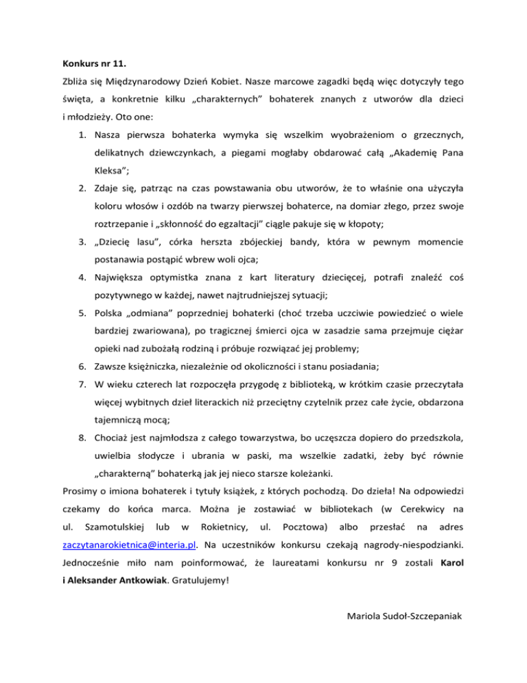 Konkurs nr 11. Zbliża się Międzynarodowy Dzień Kobiet. Nasze marcowe zagadki będą więc dotyczyły tego święta, a konkretnie kilku „charakternych” bohaterek znanych z utworów dla dzieci i młodzieży. Oto one: 1. Nasza pierwsza bohaterka wymyka się wszelkim wyobrażeniom o grzecznych, delikatnych dziewczynkach, a piegami mogłaby obdarować całą „Akademię Pana Kleksa”; 2. Zdaje się, patrząc na czas powstawania obu utworów, że to właśnie ona użyczyła koloru włosów i ozdób na twarzy pierwszej bohaterce, na domiar złego, przez swoje roztrzepanie i „skłonność do egzaltacji” ciągle pakuje się w kłopoty; 3. „Dziecię lasu”, córka herszta zbójeckiej bandy, która w pewnym momencie postanawia postąpić wbrew woli ojca; 4. Największa optymistka znana z kart literatury dziecięcej, potrafi znaleźć coś pozytywnego w każdej, nawet najtrudniejszej sytuacji; 5. Polska „odmiana” poprzedniej bohaterki (choć trzeba uczciwie powiedzieć o wiele bardziej zwariowana), po tragicznej śmierci ojca w zasadzie sama przejmuje ciężar opieki nad zubożałą rodziną i próbuje rozwiązać jej problemy; 6. Zawsze księżniczka, niezależnie od okoliczności i stanu posiadania; 7. W wieku czterech lat rozpoczęła przygodę z biblioteką, w krótkim czasie przeczytała więcej wybitnych dzieł literackich niż przeciętny czytelnik przez całe życie, obdarzona tajemniczą mocą; 8. Chociaż jest najmłodsza z całego towarzystwa, bo uczęszcza dopiero do przedszkola, uwielbia słodycze i ubrania w paski, ma wszelkie zadatki, żeby być równie „charakterną” bohaterką jak jej nieco starsze koleżanki. Prosimy o imiona bohaterek i tytuły książek, z których pochodzą. Do dzieła! Na odpowiedzi czekamy do końca marca. Można je zostawiać w bibliotekach (w Cerekwicy na ul. Szamotulskiej lub w Rokietnicy, ul. Pocztowa) albo przesłać na adres [email protected]. Na uczestników konkursu czekają nagrody-niespodzianki. Jednocześnie miło nam poinformować, że laureatami konkursu nr 9 zostali Karol i Aleksander Antkowiak. Gratulujemy! Mariola Sudoł-Szczepaniak