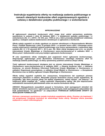 Instrukcja wypełniania oferty na realizację zadania publicznego w ramach otwartych konkursów ofert organizowanych zgodnie z ustawą o działalności pożytku publicznego i o wolontariacie WPROWADZENIE W ogłoszonych otwartych konkursach ofert mogą brać udział uprawnione podmioty, wymienione w ustawie z dnia 24 kwietnia 2003 r. o działalności pożytku publicznego i o wolontariacie (Dz. U. z 2010 r. Nr 234, poz. 1536 ze zm.), które prowadzą działalność statutową zgodną z rodzajem zadania każdorazowo określonym w ogłoszeniu o konkursie. Ofertę należy wypełnić na druku zgodnym ze wzorem określonym w Rozporządzeniu Ministra Pracy i Polityki Społecznej z dnia 15 grudnia 2010 r. w sprawie wzoru ofert i ramowego wzoru umowy dotyczących realizacji zadania publicznego oraz wzoru sprawozdania z wykonania tego zadania (Dz. U. z 10 stycznia 2011 r. Nr 6, poz. 25). Wzór oferty dostępny jest m.in. na stronie internetowej Urzędu Miejskiego w Ciechanowcu www.ciechanowiec.pl w zakładce NGO Wzory pism i dokumentów oraz przy każdym ogłoszeniu konkursowym. W celu wypełnienia oferty niezbędna jest znajomość treści ogłoszenia konkursowego, dotyczącego ogłaszanego przez Burmistrza Ciechanowca otwartego konkursu ofert na realizację zadania publicznego, na który uprawniony podmiot zamierza złożyć ofertę. Treść ogłoszeń konkursowych dostępna jest na stronie internetowej Urzędu Miejskiego w Ciechanowcu www.ciechanowiec.pl w zakładce NGO Otwarte konkursy ofert Aktualne konkursy, na stronie Biuletynu Informacji Publicznej Urzędu Miejskiego w Ciechanowcu w zakładce Organizacje pozarządowe, w zakładce Urząd Miejski w Ciechanowcu Zarządzenia Burmistrza oraz na tablicy ogłoszeń Urzędu Miejskiego w Ciechanowcu. Ofertę należy wypełnić czytelnie tzn. maszynowo, komputerowo lub czytelnym pismem odręcznym jednolicie w całości. Wszystkie pozycje formularza muszą zostać wypełnione. W przypadku, gdy dana pozycja oferty nie będzie wypełniona, należy wpisać „nie dotyczy”. W 1) miejscach gdzie znajduje się należy wykreślić niepotrzebne zapisy. Nie jest dopuszczalne samodzielne nanoszenie jakichkolwiek zmian we wzorze formularza oferty. UWAGA! Niewypełnienie wszystkich pozycji w formularzu, brak wymaganych skreśleń lub błędne skreślenie (sprzeczne z ogłoszeniem konkursowym), brak wymaganych załączników lub brak potwierdzenia "za zgodność" na załącznikach POWODUJE ODRZUCENIE OFERTY ZE WZGLĘDÓW FORMALNYCH. Kolorem czerwonym wyróżniona została instrukcja wypełniania oferty. Prosimy nie kopiować i nie przepisywać niniejszej instrukcji do właściwego druku oferty. Niniejsza oferta powstała wyłącznie w celach informacyjnych. ………………………………… Data i miejsce złożenia oferty (wypełnia organ administracji publicznej) OFERTA/OFERTA WSPÓLNA 1) Niepotrzebne skreślić - w zależności od tego, czy zamierzamy projekt realizować samodzielnie, czy w partnerstwie. UWAGA! Wszędzie tam gdzie występuje 1) należy odnieść się do polecenia – Niepotrzebne skreślić. ORGANIZACJI POZARZĄDOWEJ(-YCH)/PODMIOTU (-ÓW), O KTÓRYM (-YCH) MOWA W ART. 3 UST. 3 USTAWY Z DNIA 24 KWIETNIA 2003 r. O DZIAŁALNOSCI POŻYTKU PUBLICZNEGO 1) I O WOLONTARIACIE (Dz. U. z 2010 r. Nr 234, poz. 1536) , REALIZACJI ZADANIA PUBLICZNEGO Rodzaj zadania musi być zgodny z ogłoszeniem o otwartym konkursie ofert. Rodzaj zadania publicznego składa się z dwóch elementów: 1. Rodzaj zadania publicznego określonego w art. 4 ustawy o działalności pożytku publicznego i o wolontariacie. 2. Nazwa zadania publicznego, na które organizacja składa ofertę. Nazwa zadania znajduje się w ogłoszeniu konkursowym. PRZYKŁADY: SPOŁECZEŃSTWO: „z zakresu społeczeństwa obywatelskiego” – promowanie wolontariatu i działań wolontarystycznych KULTURA: „w sferze kultury, sztuki, ochrony dóbr kultury i dziedzictwa narodowego” – kultywowanie lokalnej historii i tradycji oraz ochrona dóbr kultury. SPORT: „w sferze upowszechniania kultury fizycznej i turystyki” – organizacja wypoczynku dzieci i młodzieży (w szczególności w okresie wakacyjnym i ferii zimowych). EKOLOGIA: „z zakresu ekologii i ochrony zwierząt oraz ochrony dziedzictwa przyrodniczego” – walka ze wzrostem populacji zwierząt, poprzez zabiegi polegające na trwałym pozbawieniu zdolności płodzenia i usypianiu ślepych miotów, dokonywane na zwierzętach należących do mieszkańców. PROFILAKTYKA: „z zakresu profilaktyki i rozwiązywania problemów uzależnień” – promowanie zdrowego stylu życia poprzez realizację programów z bogatą ofertą zagospodarowania czasu wolnego oraz rozwijania zainteresowań mieszkańców gminy, w szczególności dzieci i młodzieży. .............................................................. 2) (rodzaj zadania publicznego ) Należy podać tytuł zadania publicznego zgłaszanego do realizacji. Tytuł nie może być tożsamy z nazwą konkursu i powinien być możliwie krótki i zrozumiały – należy pamiętać, że w razie otrzymania dotacji tytuł ten będzie trzeba umieszczać na wszystkich materiałach informacyjnych i promocyjnych oraz na wszystkich dokumentach finansowych związanych z dotacją (dotyczących zarówno wydatków ponoszonych z dotacji jak i z tzw. wkładu własnego). .............................................................. (tytuł zadania publicznego) Należy zwrócić uwagę, aby podane daty były zgodne z regulaminem konkursu oraz spójne z harmonogramem znajdującym się w dalszej części formularza. Należy pamiętać, że ostatni dzień wykonania zadania publicznego, jest równocześnie ostatnim dniem na dokonanie płatności z tytułu rozliczeń finansowych, więc zaplanowany harmonogram powinien uwzględniać czas niezbędny do zapłaty za towary i usługi nabyte w celu realizacji zadania. Daty realizacji zadania należy podawać w układzie dzień/miesiąc/rok. w okresie od ..........