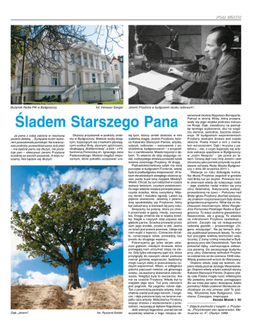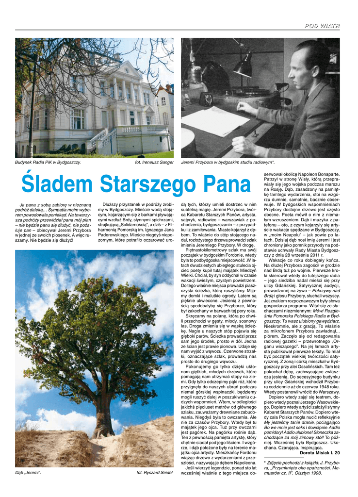 12 Budynek radia PiK w Bydgoszczy. fot. Ireneusz Sanger Jeremi Przybora w bydgoskim studiu radiowym*. Śladem starszego pana Ja pana z sobą zabiorę w nieznaną podróż daleką… Sympatia moim wyborem powodowała poniekąd. Na towarzysza podróży przewidział pana mój plan – nie będzie panu się dłużyć, nie pożałuje pan – obiecywał Jeremi Przybora w jednej ze swoich piosenek. A więc ruszamy. Nie będzie się dłużyć! Dąb „Jeremi”. Dłuższy przystanek w podróży zrobimy w Bydgoszczy. Mieście wodą stojącym, kojarzącym się z barkami pływającymi wzdłuż Brdy, słynnymi spichrzami, strajkującą „Solidarnością”, a dziś – z Filharmonią Pomorską im. Ignacego Jana Paderewskiego. Mieście niegdyś niepozornym, które potrafiło oczarować uro- fot. Ryszard Seidel dą tych, którzy umieli dostrzec w nim subtelną magię. Jeremi Przybora, twórca Kabaretu Starszych Panów, artysta, satyryk, radiowiec – warszawiak z pochodzenia, bydgoszczanin – z przypadku i z zamiłowania. Miasto kojarzył z dębem. To właśnie do stóp stojącego nadal, rozłożystego drzewa prowadzi szlak imienia Jeremiego Przybory. W drogę. Piętnastokilometrowy szlak ma swój początek w bydgoskim Fordonie, wtedy była to podbydgoska miejscowość .W latach dwudziestych ubiegłego stulecia ojciec poety kupił tutaj majątek Miedzyń Wielki. Chciał, by syn oddychał w czasie wakacji świeżym, czystym powietrzem. Do tego właśnie miejsca prowadzi piaszczysta ścieżka, którą ruszyliśmy. Mijamy domki i malutkie ogrody. Latem są pięknie ukwiecone. Jesienią z pewnością spodobałyby się Przyborze, który był zakochany w barwach tej pory roku. Skręcamy na polanę, która po chwili przechodzi w gęsty, młody, sosnowy las. Droga zmienia się w wąską ścieżkę. Nagle u naszych stóp pojawia się głęboki parów. Ścieżka prowadzi przez sam jego środek, prosto w dół. Jedna ze ścian jest prawie pionowa. Udaje się nam wyjść z wąwozu. Czerwone strzałki, oznaczające szlak, prowadzą nas prosto do drugiego wąwozu. Pokonujemy go tylko dzięki ukłonom giętkich, młodych drzewek, które pomagają nam utrzymać stopy na ziemi. Gdy tylko odczepimy pąki róż, które przylgnęły do naszych ubrań podczas niemal górskiej wspinaczki, będziemy mogli ruszyć dalej w poszukiwaniu cudzych wspomnień. Wtem, w odległości jakichś pięciuset metrów od głównego szlaku, zauważamy drewniane zabudowania. Niegdyś była to owczarnia. Ale nie za czasów Przybory. Wtedy był tu majątek jego ojca. Tuż przy owczarni jest pagórek. Na pagórku rośnie dąb. Ten z pewnością pamięta artystę, który chętnie siadał pod jego liściem. I wzgórze, i dąb położone były na terenie majątku ojca artysty. Mieszkańcy Fordonu wiążąc drzewo z wydarzeniami z przeszłości, nazywają je dębem Napoleona. Jeśli wierzyć legendzie, ponad sto lat wcześniej właśnie z tego miejsca ob- serwował okolicę Napoleon Bonaparte. Patrzył w stronę Wisły, którą przeprawiały się jego wojska podczas marszu na Rosję. Dąb, zasadzony na pamiątkę tamtego wydarzenia, stoi na wzgórzu dumnie, samotnie, bacznie obserwuje. W bydgoskich wspomnieniach Przybory dostojne drzewo jest często obecne. Poeta mówił o nim z niemałym wzruszeniem. Dąb i muzyka z patefonu – oto, z czym kojarzyły się artyście wakacje spędzane w Bydgoszczy, w „moim Neapolu” – jak powie po latach. Dzisiaj dąb nosi imię Jeremi i jest chroniony jako pomnik przyrody na podstawie uchwały Rady Miasta Bydgoszczy z dnia 28 września 2011 r. Wakacje co roku dobiegały końca. Na dłużej Przybora zagościł w grodzie nad Brdą tuż po wojnie. Pierwsze kroki skierował wtedy do tutejszego radia – jego siedziba nadal mieści się przy ulicy Gdańskiej. Satyrycznej audycji, prowadzonej na żywo – Pokrzywy nad Brdą i głosu Przybory, słuchali wszyscy. Jej znakiem rozpoznawczym były słowa gospodarza programu. Witał się ze słuchaczami niezmiennym: Mówi Rozgłośnia Pomorska Polskiego Radia w Bydgoszczy. Tu wasz ulubiony gawędziarz. Nieskromnie, ale z gracją. To właśnie za mikrofonem Przybora zawładnął... piórem. Zaczęło się od redagowania radiowej gazetki – przewrotnego „Organu wiszącego”. Na jej łamach artysta publikował pierwsze teksty. To miał być początek wielkiej twórczości satyrycznej. Z żoną i córką mieszkał w Bydgoszczy przy alei Ossolińskich. Tam też pokochał dęby, zachwycające zwłaszcza jesienią. Do secesyjnego budynku przy ulicy Gdańskiej wchodził Przybora codziennie aż do czerwca 1948 roku. Wtedy postanowił wrócić do Warszawy. Dopiero wtedy zajął się teatrem, dopiero wtedy poznał Jerzego Wasowskiego. Dopiero wtedy artyści założyli słynny Kabaret Starszych Panów. Dopiero wtedy cała Polska mogła nucić refleksyjnie My jesteśmy tanie dranie, pociągająco Bo we mnie jest seks i dowcipnie Addio pomidory! Addio ulubione! Słoneczka zachodzące za mój zimowy stół! To później. Wcześniej była Bydgoszcz. Ukochana. Czarująca. Inspirująca. Dorota Misiak l. 20 * zdjęcie pochodzi z książki: J. Przybora, „Przymknięte oko opatrzności. Memuarów cz. II”, Olsztyn 1998.