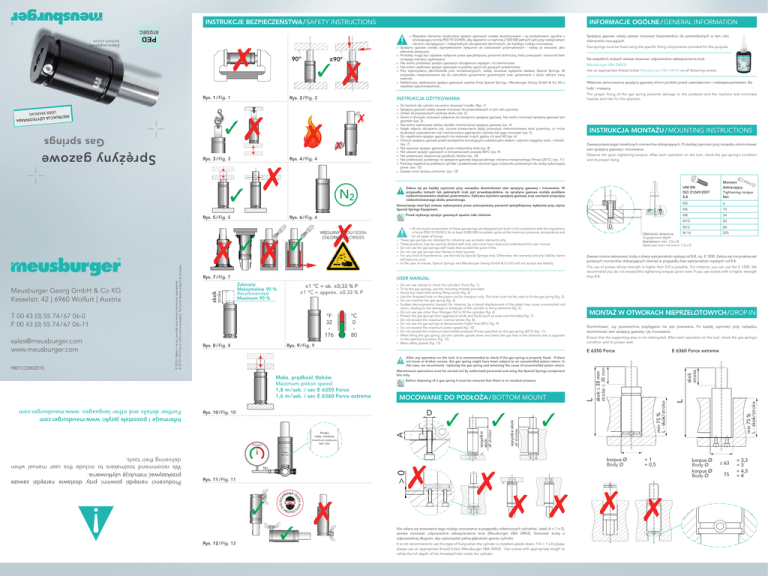 4 9 11 INSTRUKCJE BEZPIECZEŃSTWA / SAFETY INSTRUCTIONS INFORMACJE OGÓLNE / GENERAL INFORMATION 10 Zdjęcie poglądowe Symbolic picture 90º 8 ±90º M 7 Rys. 1 / Fig. 1 Rys. 2 / Fig. 2 użytkowania Instrukcja user manual 3 » » » » 1 » » » » Gas springs Sprężyny gazowe Rys. 3 / Fig. 3 Gas springs must be fixed using the specific fixing components provided for this purpose. Na wszystkich śrubach zawsze stosować odpowiednie zabezpieczenia śrub (Meusburger VBA 2M43). Use an appropriate thread locker (Meusburger VBA 2M43) on all fastening screws. Właściwe zamocowanie sprężyny gazowej chroni produkt przed uszkodzeniem i niebezpieczeństwem dla ludzi i maszyny. The proper fixing of the gas spring prevents damage to the products and the machine and minimises hazards and risks for the operator. INSTRUKCJA UŻYTKOWANIA 6 H 2 Sprężyny gazowe należy zawsze mocować bezpośrednio do przewidzianych w tym celu elementów mocujących. » W szystkie elementy strukturalne sprężyn gazowych zostały skonstruowane i są produkowane zgodnie z obowiązującą normą (PED 97/23/WE), aby zapewnić co najmniej 2 000 000 pełnych cykli przy maksymalnym ciśnieniu obciążającym i maksymalnych obciążeniach termicznych, do każdego rodzaju mocowania. » Sprężyny gazowe zostały zaprojektowane wyłącznie do zastosowań przemysłowych i należy je stosować jako elementy elastyczne. » Produkty mogą być używane wyłącznie przez specjalistyczny personel techniczny, który przeczytał i zrozumiał treść niniejszej instrukcji użytkowania. » Nie wolno poddawać sprężyn gazowych obciążeniom wyższym, niż znamionowe. » Nie wolno użytkować sprężyn gazowych w pobliżu ognia lub gorących przedmiotów. » Przy wykonywaniu jakichkolwiek prac konserwacyjnych, należy stosować wyłącznie zestawy Special Springs. W przypadku niezastosowania się do warunków uprawnienia gwarancyjne oraz uprawnienia z tytułu rękojmi tracą ważność. » Niefachowe użytkowanie sprężyn gazowych zwalnia firmę Special Springs i Meusburger Georg GmbH & Co KG z wszelkiej odpowiedzialności. » » » » » Rys. 4 / Fig. 4 » Do kontroli siły cylindra nie wolno stosować imadła. (Rys. 1) Sprężyny gazowe należy zawsze mocować do przewidzianych w tym celu gwintów. Unikać sił poprzecznych podczas skoku (rys. 2) Gwint w tłoczysku stosować wyłącznie do transportu sprężyny gazowej. Nie wolno mocować sprężyny gazowej tym gwintem (rys. 3) Nie wolno wykonywać żadnej obróbki mechanicznej sprężyny gazowej (rys. 4) Nagłe zdjęcie obciążenia (np. boczne przesunięcie płyty) powoduje niekontrolowany skok powrotny, co może skutkować uszkodzeniem lub mechanicznym pęknięciem cylindra lub jego mocowań (rys. 5) Do napełniania sprężyn gazowych nie stosować innych gazów niż azot N2 (rys. 6) Chronić sprężyny gazowe przed szczególnie korodującymi substancjami stałymi i płynami (węglany sodu i chlorki). (rys. 7) Nie wysuwać sprężyn gazowych poza maksymalny skok (rys. 8) Nie używać sprężyn gazowych w temperaturach powyżej 80°C (rys. 9) Nie przekraczać dozwolonej prędkości tłoków (rys. 10) Nie przekraczać podanego na sprężynie gazowej dopuszczalnego ciśnienia maksymalnego (Pmax) (20°C). (rys. 11) Podczas napełniania przekręcić cylinder i przekierować strumień gazu w kierunku przeciwnym do osoby wykonującej prace. (rys. 12) Zawsze nosić okulary ochronne. (rys. 12) INSTRUKCJA MONTAŻU / MOUNTING INSTRUCTIONS Zawsze przestrzegać określonych momentów dokręcających. Po każdej czynności przy narzędziu skontrolować Ø > 25 mm stan sprężyny gazowej i mocowania. Observe the given tightening torques. After each operation on the tool, check the gas spring‘s condition and its proper fixing. Ø > 25 mm Przed utylizacją sprężyn gazowych spuścić całe ciśnienie. MOCOWANIE DO PODŁOŻA / BOTTOM MOUNT F D Pmaks. bar / psi F >0 E alle Hübe all strokes min 75% di L IO N D +1 + 0,5 korpus Ø Body Ø korpus Ø Body Ø ≤ 63 C 75 B A A B C C It is not recommend to use this type of fixing when the cylinder is installed upside down. If A < 1 x D please always use an appropriate thread locker (Meusburger VBA 2M43). Use screws with appropriate length to utilize the full depth of the threaded hole inside the cylinder. D E L Body Ø + 0,5 + 1,0 B Nie zaleca się stosowania tego rodzaju mocowania w przypadku odwróconych cylindrów. Jeżeli A < 1 x D, zawsze stosować odpowiednie zabezpieczenia śrub (Meusburger VBA 2M43). Stosować śruby o odpowiedniej długości, aby wykorzystać pełną głębokość gwintu cylindra. min 75% di L Rys. 12 / Fig. 12 Body Ø + 0,5 + 1,0 OCH D B C korpus Ø Body Ø E Cu 38 T F B L OTEC B >0 EYE PR U CZ NA O RO A B F E 6360 Force extreme D min 75% di L Rys. 11 / Fig. 11 F C E wszystkie skoki all strokes A wszystkie skoki all strokes alle Hübe all strokes Pmaks. maks. ciśnienie maximum pressure bar / psi E L B >0 Before disposing of a gas spring it must be ensured that there is no residual pressure. D N2 >0 After any operation on the tool, it is recommended to check if the gas spring is properly fixed. If there are loose or broken screws, the gas spring might have been subject to an uncontrolled piston return. In this case, we recommend replacing the gas spring and removing the cause of uncontrolled piston return. Rys. 10 / Fig. 10 Informacje i pozostałe języki: www.meusburger.com Further details and other languages: www.meusburger.com Pmaks. D E 6350 Force skok stroke korpus Ø + 0,5 + 1,0 Ensure that the supporting area is not interrupted. After each operation on the tool, check the gas spring‘s condition and its proper seat. L E Skontrolować, czy powierzchnia przylegania nie jest przerwana. Po każdej czynności przy narzędziu skontrolować stan sprężyny gazowej i jej mocowanie. Maintenance operations must be carried out by authorized personnel and using the Special Springs component kits only. Maks. prędkość tłok