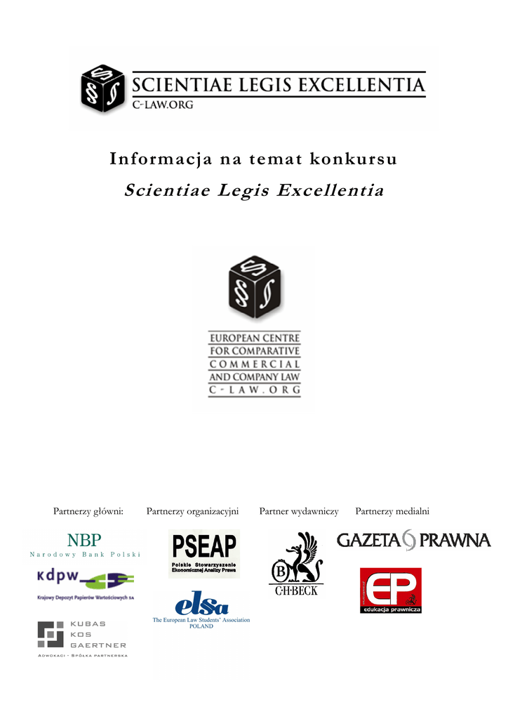 Informacja na temat konkursu Scientiae Legis Excellentia Partnerzy główni: Partnerzy organizacyjni Partner wydawniczy Partnerzy medialni REGULAMIN KONKURSU SCIENTIAE LEGIS EXCELLENTIA NA NAJLEPSZE ROZPRAWY DOKTORSKIE I PRACE MAGISTERSKIE Z ZAKRESU PRAWA RYNKU KAPITAŁOWEGO ORAZ PRAWA GOSPODARCZEGO I. ORGANIZATOR ......................................................................................................................... 3 II. CEL ORGANIZACJI KONKURSU........................................................................................... 3 III. PARTNERZY i SPONSORZY: ................................................................................................. 3 Partnerzy główni: .............................................................................................................................. 3 Partnerzy organizacyjni:..................................................................................................................... 4 Partner wydawniczy:.......................................................................................................................... 4 Partnerzy medialni:............................................................................................................................ 4 IV. CELE I ZAKRES TEMATYCZNY KONKURSU.................................................................... 4 V. UCZESTNICTWO W KONKURSIE ......................................................................................... 4 VI. ZASADY WYŁONIENIA LAUREATÓW ............................................................................... 6 VII. NAGRODY W KONKURSIE ................................................................................................. 6 IX. PRAWA AUTORSKIE .............................................................................................................. 7 2 I. ORGANIZATOR Realizując swoją misję akademicką i edukacyjną European Centre for Comparative Commercial and Company Law (Centrum C-Law.org)* wraz z Kolegium Redakcyjnym „Czasopisma kwartalnego całego prawa handlowego, upadłościowego oraz rynku kapitałowego” (HUK)** ogłaszają konkurs SCIENTIAE LEGIS EXCELLENTIA na najlepsze rozprawy doktorskie i prace magisterskie z zakresu prawa rynku kapitałowego oraz prawa gospodarczego. II. CEL ORGANIZACJI KONKURSU Konkurs ma za zadanie popularyzację wśród młodych teoretyków i praktyków prawa w Polsce zainteresowania zagadnieniami mieszczącymi się w zakresie realizowanych przez Centrum C-law.org zadań. Konkurs jest również związany z upowszechnieniem znaku jakości „Scientiae Legis Excellentia”, promującego kompetencję i doskonałość w piśmiennictwie prawniczym. Znakiem tym sygnowane są publikacje cechujące się nowatorstwem naukowym albo szczególną wartością użytkową (praktyczną), które ze względu na wymienione właściwości zasługują na szczególną uwagę. III. PARTNERZY i SPONSORZY: Partnerzy główni: Narodowy Bank Polski Krajowy Depozyt Papierów Wartościowych S.A. Kancelaria KKGA Kubas, Kos, Gaertner – Adwokaci spółka partnerska * Misją Centrum C-Law.org jest przyczynianie się do poprawy ustawodawstwa i stosowania prawa gospodarczego, zwłaszcza prawa spółek oraz promowania przedsiębiorczości oraz dobrych praktyk korporacyjnych w Europie, ze szczególnym uwzględnieniem nowych państw członkowskich Unii Europejskiej oraz krajów stowarzyszonych. Centrum C-Law.org zmierza do realizacji swoich celów miedzy innymi poprzez niezależną działalność badawczą, wymianę akademicką, interdyscyplinarny dialog oraz inne działania związane z celem organizacji. Więcej informacji o Organizatorze: www.c-law.org ** Na łamach „Czasopisma kwartalnego całego prawa handlowego, upadłościowego oraz rynku kapitałowego” (HUK) publikowane są studia oraz materiały dotyczące zagadnień prawa cywilnego, handlowego, spółek (w tym corporate governance), prawa upadłościowego oraz rynku kapitałowego, a w szczególności: opracowania stanowiące systemowe omówienie instytucji prawnych; prace nowatorskie, przedstawiające kierunki rozwoju prawa; analizy tematów kontrowersyjnych w doktrynie i orzecznictwie; prace napisane przy szerokim wykorzystaniu metody komparatystycznej; prace poświęcone ekonomicznej analizie prawa; prace bazujące na badaniach empirycznych nad prawem; prace interdyscyplinarne; prace dotykające zagadnień prawa międzynarodowego oraz prawa europejskiego. Więcej informacji o Kwartalniku HUK: www.huk.beck.pl. 3 Partnerzy organizacyjni: Polskie Stowarzyszenie Ekonomicznej Analizy Prawa Europejskie Stowarzyszenie Studentów Prawa ELSA Poland Partner wydawniczy: Wydawnictwo C.H.Beck Partnerzy medialni: Gazeta Prawna Edukacja Prawnicza IV. CELE I ZAKRES TEMATYCZNY KONKURSU Celem Konkursu jest wyłonienie najlepszej pracy w oraz przyznanie nagród i wyróżnień najlepszym pracom w następujących kategoriach: • rozprawy doktorskie (5.000 zł) • prace magisterskie (3.000 zł) Do konkursu mogą być zgłaszane prace w dwóch kategoriach tematycznych: • prace z zakresu prawa rynku kapitałowego, wyróżniające się analizą problematyki prawnej oraz perspektyw rozwoju infrastruktury rynku kapitałowego w Polsce i Europie, ze szczególnym uwzględnieniem Europy Środkowo - Wschodniej – o Nagrodę Krajowego Depozytu Papierów Wartościowych • prace z prawa gospodarczego (w szczególności prawa spółek, prawa bakowego, prawa upadłościowego i prawa umów gospodarczych) napisane z wykorzystaniem ekonomicznej analizy prawa i badań empirycznych – o Nagrodę Narodowego Banku Polskiego V. UCZESTNICTWO W KONKURSIE 1. Konkurs skierowany jest do autorów rozpraw doktorskich i prac magisterskich, obronionych na wydziałach prawa, wydziałach nauk ekonomicznych lub wydziałach zarządzania uczelni wyższych na terenie Rzeczypospolitej Polskiej. Prace obronione na innych wydziałach oraz w 4 języku innym, niż polski mogą być 