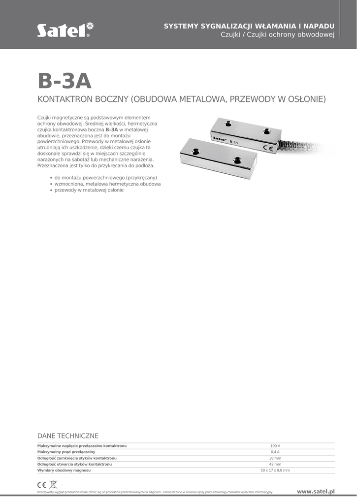 SYSTEMY SYGNALIZACJI WŁAMANIA I NAPADU Czujki / Czujki ochrony obwodowej B-3A KONTAKTRON BOCZNY (OBUDOWA METALOWA, PRZEWODY W OSŁONIE) Czujki magnetyczne są podstawowym elementem ochrony obwodowej. Średniej wielkości, hermetyczna czujka kontaktronowa boczna B–3A w metalowej obudowie, przeznaczona jest do montażu powierzchniowego. Przewody w metalowej osłonie utrudniają ich uszkodzenie, dzięki czemu czujka ta doskonale sprawdzi się w miejscach szczególnie narażonych na sabotaż lub mechaniczne narażenia. Przeznaczona jest tylko do przykręcania do podłoża. do montażu powierzchniowego (przykręcany) wzmocniona, metalowa hermetyczna obudowa przewody w metalowej osłonie DANE TECHNICZNE Maksymalne napięcie przełączalne kontaktronu Maksymalny prąd przełączalny Odległość zamknięcia styków kontaktronu Odległość otwarcia styków kontaktronu Wymiary obudowy magnesu 100 V 0,4 A 38 mm 42 mm 50 x 17 x 9,8 mm Rzeczywisty wygląd produktów może różnić się od produktów prezentowanych na zdjęciach. Zamieszczone w serwisie opisy produktówmają charakter wyłącznie informacyjny. www.satel.pl