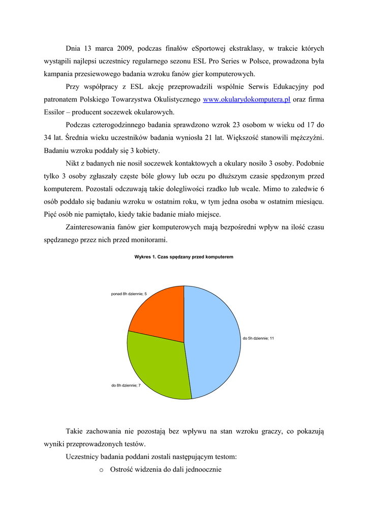 Dnia 13 marca 2009, podczas finałów eSportowej ekstraklasy, w trakcie których wystąpili najlepsi uczestnicy regularnego sezonu ESL Pro Series w Polsce, prowadzona była kampania przesiewowego badania wzroku fanów gier komputerowych. Przy współpracy z ESL akcję przeprowadzili wspólnie Serwis Edukacyjny pod patronatem Polskiego Towarzystwa Okulistycznego www.okularydokomputera.pl oraz firma Essilor – producent soczewek okularowych. Podczas czterogodzinnego badania sprawdzono wzrok 23 osobom w wieku od 17 do 34 lat. Średnia wieku uczestników badania wyniosła 21 lat. Większość stanowili mężczyźni. Badaniu wzroku poddały się 3 kobiety. Nikt z badanych nie nosił soczewek kontaktowych a okulary nosiło 3 osoby. Podobnie tylko 3 osoby zgłaszały częste bóle głowy lub oczu po dłuższym czasie spędzonym przed komputerem. Pozostali odczuwają takie dolegliwości rzadko lub wcale. Mimo to zaledwie 6 osób poddało się badaniu wzroku w ostatnim roku, w tym jedna osoba w ostatnim miesiącu. Pięć osób nie pamiętało, kiedy takie badanie miało miejsce. Zainteresowania fanów gier komputerowych mają bezpośredni wpływ na ilość czasu spędzanego przez nich przed monitorami. Wykres 1. Czas spędzany przed komputerem ponad 8h dziennie; 5 do 5h dziennie; 11 do 8h dziennie; 7 Takie zachowania nie pozostają bez wpływu na stan wzroku graczy, co pokazują wyniki przeprowadzonych testów. Uczestnicy badania poddani zostali następującym testom: o Ostrość widzenia do dali jednoocznie o Test nadwzroczności soczewką +1,0 D o Test czerwono-zielony o Astygmatyzm (figura promienista) o Ostrość widzenia z bliży dwuocznie o Ostrość widzenia na odległości pośrednie dwuocznie (odl. 66 cm) o Foria w odległościach pośrednich o Test fuzji o Sprawność widzenia kinetycznego o Rozpoznawanie barw Wyniki badania ostrości widzenia do dali zawiera tabela 1. Normę stanowiła wartość wisus ≥ 0,8 i prawidłowy wynik testu nadwzroczności. Ostrość widzenia do dali w normie poniżej normy jednoocznie poniżej normy dwuocznie nadwzroczność n=23 16 2 2 3 Tabela 1. Ostrość widzenia do dali U czterech osób zdiagnozowano prawdopodobieństwo krótkowzroczności a u trzech – nadwzroczności. Testy ostrości widzenia w bliży i odległościach pośrednich przeszli pomyślnie wszyscy badani. Każdy z uczestników osiągną w tych testach wisus ≥ 0,8. Wyniki bardziej czułych testów: figury promienista oraz testu czerwono-zielonego, wskazują na powszechne w badanej grupie występowanie astygmatyzmu i nadwzroczności. Tylko 4 badanych zaliczyło pozytywnie test figury promienistej. Z wysokim prawdopodobieństwem można stwierdzić, że astygmatyzm występuje u 19 badanych (u 10 dwuoczny, u 9 jednooczny). 17 spośród 23 badanych wskazało, że widzi czarne znaki wyraźniej na zielonym tle. Te osoby (poza trzema wskazanymi w tabeli 1.) można podejrzewać o skurcz akomodacji. Zaburzenia akomodacji i konwergencji zdiagnozowano na podstawie testów forii. Foria prawidlowo egzoforia ezoforia n=23 10 11 2 Tabela 2. Foria Dwóch spośród 23 badanych nie miało prawidłowej fuzji. Jedna osoba popełniła więcej niż jeden błąd w teście widzenia kinetycznego. U czterech osób rozpoznano zaburzenie rozpoznawania barw (popełniły one co najmniej dwa błędy w teście pseudoIshihara). Wnioski Przesiewowe badania wzroku przeprowadzono na nielicznej, ale jednolitej grupie fanów gier komputerowych. Trudno o wyciąganie wniosków statystycznych na podstawie badania 23 osób. Otrzymane wyniki pozwalają jednak zaobserwować zmiany w funkcjonowaniu wzroku badanych. Wyniki badania ostrości do dali (16 z 23 w normie, 70%) są zbieżne z danymi uzyskiwanymi w innych badaniach wzroku. Wg badań zespołu dr Zająca 34% dzieci 7-letnich ma wadę refrakcji. W badanej grupie graczy komputerowych zaskakują doskonałe wyniki badania ostrości widzenia w bliży (33 cm) i w odległościach pośrednich (66 cm). Tam, gdzie badani najczęściej skupiają swój wzrok. Wszyscy uczestnicy osiągnęli w tych dwóch testach wynik przynajmniej 8/10. Badani gracze, czasem mimo nienajlepszej ostrości do dali, w bliskich odległościach znakomicie rozpoznają szczegóły. Także szczegóły w ruchu, o czym świadczą znakomite wyniki testu widzenia kinetycznego (22 na 23 w normie). Dokładniejsze testy pokazały jak słabym kryterium oceny widzenia jest ograniczenie testów do badania ostrości. Zaledwie u czterech uczestników badania nie zdiagnozowano możliwości wystąpienia astygmatyzmu. Wada ta pogarsza jakość widzenia przez zmianę kształtów obserwowanych przedmiotów. Odczytywane w teście ostrości widzenia litery mogły być rozpoznane prawidłowo, chociaż z powodu astygmatyzmu są zniekształcone. Decydujące znaczenie ma w takiej sytuacji pamięć wzrokowa. Znamy wygląd litery i rozpoznajemy ją po kilku szczegółach nawet jeśli ma ona nieco inny kształt. Podobnie niski rezultat dał test czerwono-zielony. Siedemnastu spośród 23 badanych wskazało, że widzi czarne znaki wyraźniej na zielonym tle. U tych osób narząd wzroku w trakcie patrzenia w dal nie powraca do stanu spoczynku lecz trwa w napięciu. Stan ten, określany jako skurcz akomodacji, prowadzi do nasilającego się bólu głowy lub oczu – podstawowego objawu Syndromu Widzenia Komputerowego CVS. Prawdziwy problem został zdiagnozowany testem forii. Wśród 23 badanych osób aż 13 uzyskało w tym teście wynik nieprawidłowy. A równocześnie wszystkie te osoby osiągnęły pozytywne wyniki badania ostrości widzenia w bliży i odległościach pośrednich. U ponad połowy uczestników badania można z dużym prawdopodobieństwem rozpoznać zaburzenia odruchów akomodacji i konwergencji potocznie opisywane jako zez ukryty. Osoby takie mogą mieć problemy z widzeniem przestrzennym, czyli np. prawidłową ocena odległości w przestrzeni trójwymiarowej. U dwóch badanych osób stwierdzono problem z fuzją obrazów, 