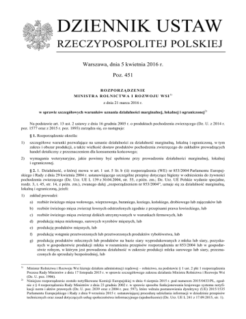 DZIENNIK USTAW RZECZYPOSPOLITEJ POLSKIEJ Warszawa, dnia 5 kwietnia 2016 r. Poz. 451 RO ZPO R ZĄ D ZE N I E M INI S TR A R O L N IC T WA I RO ZW O J U W S I 1) z dnia 21 marca 2016 r. w sprawie szczegółowych warunków uznania działalności marginalnej, lokalnej i ograniczonej2) Na podstawie art. 13 ust. 2 ustawy z dnia 16 grudnia 2005 r. o produktach pochodzenia zwierzęcego (Dz. U. z 2014 r. poz. 1577 oraz z 2015 r. poz. 1893) zarządza się, co następuje: § 1. Rozporządzenie określa: 1) szczegółowe warunki pozwalające na uznanie działalności za działalność marginalną, lokalną i ograniczoną, w tym zakres i obszar produkcji, a także wielkość dostaw produktów pochodzenia zwierzęcego do zakładów prowadzących handel detaliczny z przeznaczeniem dla konsumenta końcowego; 2) wymagania weterynaryjne, jakie powinny być spełnione przy prowadzeniu działalności marginalnej, lokalnej i ograniczonej. § 2. 1. Działalność, o której mowa w art. 1 ust. 5 lit. b (ii) rozporządzenia (WE) nr 853/2004 Parlamentu Europejskiego i Rady z dnia 29 kwietnia 2004 r. ustanawiającego szczególne przepisy dotyczące higieny w odniesieniu do żywności pochodzenia zwierzęcego (Dz. Urz. UE L 139 z 30.04.2004, str. 55, z późn. zm.; Dz. Urz. UE Polskie wydanie specjalne, rozdz. 3, t. 45, str. 14, z późn. zm.), zwanego dalej „rozporządzeniem nr 853/2004”, uznaje się za działalność marginalną, lokalną i ograniczoną, jeżeli: 1) zakład prowadzi: a) rozbiór świeżego mięsa wołowego, wieprzowego, baraniego, koziego, końskiego, drobiowego lub zajęczaków lub b) rozbiór świeżego mięsa zwierząt łownych odstrzelonych zgodnie z przepisami prawa łowieckiego, lub c) rozbiór świeżego mięsa zwierząt dzikich utrzymywanych w warunkach fermowych, lub d) produkcję mięsa mielonego, surowych wyrobów mięsnych, lub e) produkcję produktów mięsnych, lub f) produkcję wstępnie przetworzonych lub przetworzonych produktów rybołówstwa, lub g) produkcję produktów mlecznych lub produktów na bazie siary wyprodukowanych z mleka lub siary, pozyskanych w gospodarstwie produkcji mleka w rozumieniu przepisów rozporządzenia nr 853/2004 lub w gospodarstwie rolnym, w którym jest prowadzona działalność w zakresie produkcji mleka surowego lub siary, przeznaczonych do sprzedaży bezpośredniej, lub 1) 2) Minister Rolnictwa i Rozwoju Wsi kieruje działem administracji rządowej – rolnictwo, na podstawie § 1 ust. 2 pkt 1 rozporządzenia Prezesa Rady Ministrów z dnia 17 listopada 2015 r. w sprawie szczegółowego zakresu działania Ministra Rolnictwa i Rozwoju Wsi (Dz. U. poz. 1906). Niniejsze rozporządzenie zostało notyfikowane Komisji Europejskiej w dniu 4 sierpnia 2015 r. pod numerem 2015/0433/PL, zgodnie z § 4 rozporządzenia Rady Ministrów z dnia 23 grudnia 2002 r. w sprawie sposobu funkcjonowania krajowego systemu notyfikacji norm i aktów prawnych (Dz. U. poz. 2039 oraz z 2004 r. poz. 597), które wdraża postanowienia dyrektywy (UE) 2015/1535 Parlamentu Europejskiego i Rady z dnia 9 września 2015 r. ustanawiającej procedurę udzielania informacji w dziedzinie przepisów technicznych oraz zasad dotyczących usług społeczeństwa informacyjnego (ujednolicenie) (Dz. Urz. UE L 241 z 17.09.2015, str. 1). Dziennik Ustaw –2– Poz. 451 h) produkcję produktów jajecznych pozyskanych w wyniku obróbki lub przetwarzania jaj, które uprzednio ugotowano w skorupach, lub i) produkcję gotowych posiłków (potraw) z produktów pochodzenia zwierzęcego, o których mowa w lit. a–h, lub z udziałem tych produktów, pod warunkiem że co najmniej jeden produkt pochodzenia zwierzęcego należący do głównych składników posiłku został wyprodukowany w tym zakładzie; 2) zakład prowadzi sprzedaż produktów pochodzenia zwierzęcego określonych w pkt 1 konsumentowi końcowemu oraz dostawy tych produktów do innych zakładów prowadzących handel detaliczny z przeznaczeniem dla konsumenta końcowego; 3) dostawy, o których mowa w pkt 2, nie przekraczają wagowo: a) tony tygodniowo – w przypadku świeżego mięsa wołowego, wieprzowego, baraniego, koziego, końskiego lub produkowanych z tego mięsa surowych wyrobów mięsnych lub mięsa mielonego, b) 0,5 tony tygodniowo – w przypadku świeżego mięsa drobiowego lub zajęczaków lub produkowanych z tego mięsa surowych wyrobów mięsnych lub mięsa mielonego, c) 1,5 tony tygodniowo – w przypadku produktów mięsnych, d) 0,5 tony tygodniowo – w przypadku świeżego mięsa zwierząt dzikich utrzymywanych w warunkach fermowych lub produkowanych z tego mięsa surowych wyrobów mięsnych lub mięsa mielonego, e) 0,5 tony tygodniowo – w przypadku świeżego mięsa zwierząt łownych odstrzelonych zgodnie z przepisami prawa łowieckiego lub produkowanych z tego mięsa surowych wyrobów mięsnych lub mięsa mielonego, f) 0,5 tony tygodniowo – w przypadku produktów rybołówstwa, g) 0,5 tony tygodniowo – w przypadku produktów mlecznych lub produktów na bazie siary łącznie, h) 0,15 tony tygodniowo – w przypadku produktów jajecznych, i) 4) 1,5 tony tygodniowo – w przypadku gotowych posiłków (potraw) wyprodukowanych z produktów pochodzenia zwierzęcego, o których mowa w pkt 1 lit. a–h, lub z udziałem tych produktów; miejsca produkcji lub miejsca sprzedaży produktów pochodzenia zwierzęcego, o których mowa w pkt 1, oraz zakłady prowadzące handel detaliczny z przeznaczeniem dla konsumenta końcowego, do których następuje dostawa, znajdują się na obszarze jednego województwa lub na obszarach powiatów sąsiadujących z tym województwem, położonych na obszarach innych województw. 2. Powiatowy lekarz weterynarii właściwy ze względu na miejsce prowadzenia przez podmiot działalności marginalnej, lokalnej i ograniczonej na wniosek tego podmiotu może wyrazić zgodę na przekroczenie w danym tygodniu wielkości dostaw produktów, o których mowa w ust. 1 pkt 3 lit. d–f, pod warunkiem za