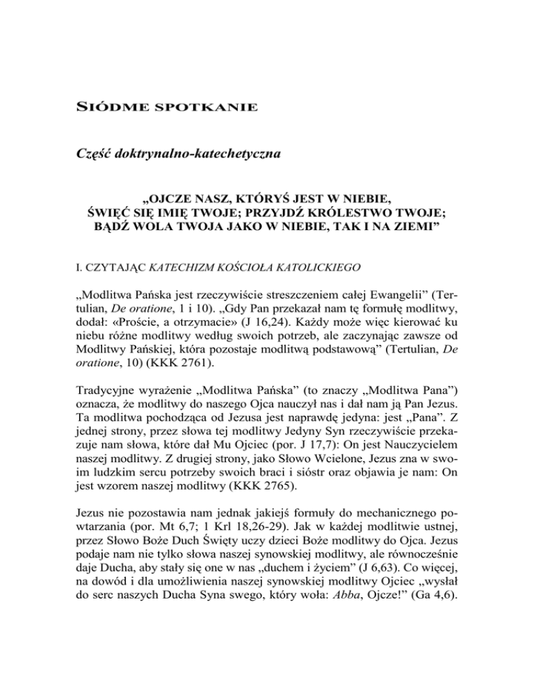 SIÓDME SPOTKANIE Część doktrynalno-katechetyczna „OJCZE NASZ, KTÓRYŚ JEST W NIEBIE, ŚWIĘĆ SIĘ IMIĘ TWOJE; PRZYJDŹ KRÓLESTWO TWOJE; BĄDŹ WOLA TWOJA JAKO W NIEBIE, TAK I NA ZIEMI” I. CZYTAJĄC KATECHIZM KOŚCIOŁA KATOLICKIEGO „Modlitwa Pańska jest rzeczywiście streszczeniem całej Ewangelii” (Tertulian, De oratione, 1 i 10). „Gdy Pan przekazał nam tę formułę modlitwy, dodał: «Proście, a otrzymacie» (J 16,24). Każdy może więc kierować ku niebu różne modlitwy według swoich potrzeb, ale zaczynając zawsze od Modlitwy Pańskiej, która pozostaje modlitwą podstawową” (Tertulian, De oratione, 10) (KKK 2761). Tradycyjne wyrażenie „Modlitwa Pańska” (to znaczy „Modlitwa Pana”) oznacza, że modlitwy do naszego Ojca nauczył nas i dał nam ją Pan Jezus. Ta modlitwa pochodząca od Jezusa jest naprawdę jedyna: jest „Pana”. Z jednej strony, przez słowa tej modlitwy Jedyny Syn rzeczywiście przekazuje nam słowa, które dał Mu Ojciec (por. J 17,7): On jest Nauczycielem naszej modlitwy. Z drugiej strony, jako Słowo Wcielone, Jezus zna w swoim ludzkim sercu potrzeby swoich braci i sióstr oraz objawia je nam: On jest wzorem naszej modlitwy (KKK 2765). Jezus nie pozostawia nam jednak jakiejś formuły do mechanicznego powtarzania (por. Mt 6,7; 1 Krl 18,26-29). Jak w każdej modlitwie ustnej, przez Słowo Boże Duch Święty uczy dzieci Boże modlitwy do Ojca. Jezus podaje nam nie tylko słowa naszej synowskiej modlitwy, ale równocześnie daje Ducha, aby stały się one w nas „duchem i życiem” (J 6,63). Co więcej, na dowód i dla umożliwienia naszej synowskiej modlitwy Ojciec „wysłał do serc naszych Ducha Syna swego, który woła: Abba, Ojcze!” (Ga 4,6). 48 I SYNOD DIECEZJI LEGNICKIEJ 2007-2012 Nasza modlitwa wyraża przed Bogiem nasze pragnienia. Ojciec, „Ten, który przenika serca (...) zna zamiar Ducha (...) że przyczynia się za świętymi zgodnie z wolą Bożą” (Rz 8,27). Modlitwa do naszego Ojca łączy się z misterium posłania Syna i Ducha (KKK 2766). Modlitwa Pańska jest właściwą modlitwą Kościoła. Stanowi integralną część Godzin większych modlitwy brewiarzowej i sakramentów wtajemniczenia chrześcijańskiego: chrztu, bierzmowania i Eucharystii. Włączona w Eucharystię, ukazuje „eschatologiczny” charakter zawartych w niej próśb, w oczekiwaniu Pana, „aż przyjdzie” (1 Kor 11,26) (KKK 2776). W liturgii rzymskiej zgromadzenie eucharystyczne jest wezwane do odmawiania z synowską śmiałością modlitwy „Ojcze nasz”; liturgie wschodnie wykorzystują i rozwijają podobne wyrażenia: „Ośmielić się z całą pewnością”, „Uczyń nas godnymi”. Przed płonącym krzewem Mojżesz usłyszał: „Nie zbliżaj się tu! Zdejm sandały z nóg” (Wj 3,5). Tylko Jezus mógł przekroczyć ten próg Boskiej Świętości, On, który „dokonawszy oczyszczenia z grzechów” (Hbr 1,3), wprowadza nas przed oblicze Ojca: „Oto Ja i dzieci moje, które Mi dał Bóg” (Hbr 2,13) (KKK 2777) Pokora każe nam uznać, że „Ojca nikt nie zna, tylko Syn” i ci, którym „Syn zechce objawić” (Mt 11,27), to znaczy „prostaczkowie” (Mt 11,25). Oczyszczenie serca dotyczy powstałych w naszej historii osobistej i kulturowej wyobrażeń ojca lub matki, które wpływają na naszą relację do Boga. Bóg, nasz Ojciec, przekracza kategorie świata stworzonego. Odnosić nasze idee w tej dziedzinie do Niego lub przeciw Niemu, byłoby tworzeniem bożków po to, by je czcić lub burzyć. Modlić się do Ojca znaczy wejść w Jego misterium, według tego, jaki jest On sam i jakim objawił Go nam Jego Syn: „Wyrażenie «Bóg Ojciec» nigdy nikomu nie było objawione. Gdy sam Mojżesz zapytał Boga, kim On jest, usłyszał inne imię. Nam to imię zostało objawione w Synu, bo imię to zawiera nowe imię Ojca” (Tertulian, De oratione, 3) (KKK 2779). Możemy wzywać Boga jako „Ojca”, ponieważ został On nam objawiony przez Jego Syna, który stał się człowiekiem, a Jego Duch daje nam Go poznać (KKK 2780). Przypatrzmy się powołaniu naszemu 49 Gdy modlimy się do Ojca, jesteśmy w komunii z Nim i z Jego Synem, Jezusem Chrystusem (por. 1 J 1,3). Wtedy właśnie poznajemy Go i uznajemy z ciągle nowym zachwytem. Pierwszym słowem Modlitwy Pańskiej jest adorujące błogosławieństwo; potem następuje błaganie. Bo chwałą Boga jest to, że uznajemy Go za „Ojca”, Boga prawdziwego. Składamy Mu dziękczynienie, że objawił nam swoje imię, że pozwolił nam w nie wierzyć i że zamieszkuje w nas Jego Obecność (KKK 2781). Ojcze „nasz” odnosi się do Boga. Gdy wypowiadamy ten zaimek, nie wyrażamy posiadania, lecz całkowicie nową relację do Boga (KKK 2786). Gdy mówimy Ojcze „nasz”, uznajemy najpierw, że wszystkie Jego obietnice miłości, zapowiedziane przez proroków, zostały wypełnione przez Chrystusa w nowym i wiecznym Przymierzu: Staliśmy się „Jego” ludem, a On jest odtąd „naszym” Bogiem. Ten nowy związek jest darem wzajemnej przynależności: przez miłość i wierność (por. Oz 2,21-22; 6,1-6) mamy odpowiedzieć na „łaskę i prawdę”, które zostały nam dane w Jezusie Chrystusie (J 1,17) (KKK 2787). To biblijne wyrażenie nie oznacza miejsca („przestrzeni”), lecz sposób istnienia; nie oddalenie Boga, ale Jego majestat. Nasz Ojciec nie znajduje się „gdzie indziej”, On jest „ponad wszystkim tym”, co możemy pomyśleć o Jego świętości. Ponieważ jest trzykroć święty, dlatego jest bardzo blisko serca pokornego i skruszonego: „Zupełnie słusznie słowa «Ojcze nasz, któryś jest w niebie», rozlegają się z serc sprawiedliwych, w których Bóg mieszka jak w swoim przybytku. Przez to również modlący się będzie pragnął, by mieszkał w nim Ten, którego wzywa” (św. Augustyn, De sermone Domini In Monte, 2, 5, 18: PL 34, 1277) (KKK 2794). Po postawieniu nas w obecności Boga, naszego Ojca, aby Go adorować, kochać i błogosławi