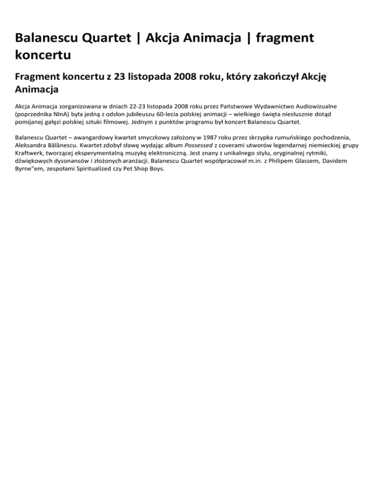 Balanescu Quartet | Akcja Animacja | fragment koncertu Fragment koncertu z 23 listopada 2008 roku, który zakończył Akcję Animacja Akcja Animacja zorganizowana w dniach 22-23 listopada 2008 roku przez Państwowe Wydawnictwo Audiowizualne (poprzednika NInA) była jedną z odsłon jubileuszu 60-lecia polskiej animacji – wielkiego święta niesłusznie dotąd pomijanej gałęzi polskiej sztuki filmowej. Jednym z punktów programu był koncert Balanescu Quartet. Balanescu Quartet – awangardowy kwartet smyczkowy założony w 1987 roku przez skrzypka rumuńskiego pochodzenia, Aleksandra Bălănescu. Kwartet zdobył sławę wydając album Possessed z coverami utworów legendarnej niemieckiej grupy Kraftwerk, tworzącej eksperymentalną muzykę elektroniczną. Jest znany z unikalnego stylu, oryginalnej rytmiki, dźwiękowych dysonansów i złożonych aranżacji. Balanescu Quartet współpracował m.in. z Philipem Glassem, Davidem Byrne"em, zespołami Spiritualized czy Pet Shop Boys.