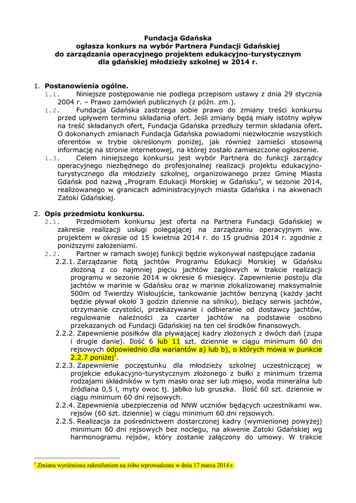 Fundacja Gdańska ogłasza konkurs na wybór Partnera Fundacji Gdańskiej do zarządzania operacyjnego projektem edukacyjno-turystycznym dla gdańskiej młodzieży szkolnej w 2014 r. 1. Postanowienia ogólne. 1.1. Niniejsze postępowanie nie podlega przepisom ustawy z dnia 29 stycznia 2004 r. – Prawo zamówień publicznych (z późn. zm.). 1.2. Fundacja Gdańska zastrzega sobie prawo do zmiany treści konkursu przed upływem terminu składania ofert. Jeśli zmiany będą miały istotny wpływ na treść składanych ofert, Fundacja Gdańska przedłuży termin składania ofert. O dokonanych zmianach Fundacja Gdańska powiadomi niezwłocznie wszystkich oferentów w trybie określonym poniżej, jak również zamieści stosowną informację na stronie internetowej, na której zostało zamieszczone ogłoszenie. 1.3. Celem niniejszego konkursu jest wybór Partnera do funkcji zarządcy operacyjnego niezbędnego do profesjonalnej realizacji projektu edukacyjnoturystycznego dla młodzieży szkolnej, organizowanego przez Gminę Miasta Gdańsk pod nazwą „Program Edukacji Morskiej w Gdańsku”, w sezonie 2014, realizowanego w granicach administracyjnych miasta Gdańska i na akwenach Zatoki Gdańskiej. 2. Opis przedmiotu konkursu. 2.1. Przedmiotem konkursu jest oferta na Partnera Fundacji Gdańskiej w zakresie realizacji usługi polegającej na zarządzaniu operacyjnym ww. projektem w okresie od 15 kwietnia 2014 r. do 15 grudnia 2014 r. zgodnie z poniższymi założeniami. 2.2. Partner w ramach swojej funkcji będzie wykonywał następujące zadania 2.2.1. Zarządzanie flotą jachtów Programu Edukacji Morskiej w Gdańsku złożoną z co najmniej pięciu jachtów żaglowych w trakcie realizacji programu w sezonie 2014 w okresie 6 miesięcy. Zapewnienie postoju dla jachtów w marinie w Gdańsku oraz w marinie zlokalizowanej maksymalnie 500m od Twierdzy Wisłoujście, tankowanie jachtów benzyną (każdy jacht będzie pływał około 3 godzin dziennie na silniku), bieżący serwis jachtów, utrzymanie czystości, przekazywanie i odbieranie od dostawcy jachtów, regulowanie należności za czarter jachtów na podstawie osobno przekazanych od Fundacji Gdańskiej na ten cel środków finansowych. 2.2.2. Zapewnienie posiłków dla pływającej kadry złożonych z dwóch dań (zupa i drugie danie). Ilość 6 lub 11 szt. dziennie w ciągu minimum 60 dni rejsowych odpowiednio dla wariantów a) lub b), o których mowa w punkcie 2.2.7 poniżej1. 2.2.3. Zapewnienie poczęstunku dla młodzieży szkolnej uczestniczącej w projekcie edukacyjno-turystycznym złożonego z bułki z minimum trzema rodzajami składników w tym masło oraz ser lub mięso, woda mineralna lub źródlana 0,5 l, myty owoc tj. jabłko lub gruszka. Ilość 60 szt. dziennie w ciągu minimum 60 dni rejsowych. 2.2.4. Zapewnienia ubezpieczenia od NNW uczniów będących uczestnikami ww. rejsów (60 szt. dziennie) w ciągu minimum 60 dni rejsowych. 2.2.5. Realizacja za pośrednictwem dostarczonej kadry (wymienionej powyżej) minimum 60 dni rejsowych bez noclegu, na akwenie Zatoki Gdańskiej wg harmonogramu rejsów, który zostanie załączony do umowy. W trakcie 1 Zmiana wyróżniona zakreśleniem na żółto wprowadzona w dniu 17 marca 2014 r. realizacji zamówienia ilość dni rejsowych może się zwiększyć maksymalnie o 15%. 2.2.6. Współpraca z Fundacją Gdańską jako głównym realizatorem i zarządcą strategicznym Programu Edukacji Morskiej w Gdańsku (PEM) oraz Partnerami Fundacji Gdańskiej realizującymi program, w szczególności z Wydziałem Edukacji Urzędu Miejskiego w Gdańsku, Centralnym Muzeum Morskim, Muzeum Historycznym Miasta Gdańska oraz innymi dostawcami usług na rzecz programu. 2.2.7. Dostawa kadry do programu w wariancie a) złożonej minimum z 5 sterników (w tym 1 kierownika rejsów) oraz 1 koordynatora lądowego lub w wariancie b) złożonej minimum z 10 sterników (w tym 1 kierownika rejsów) oraz 1 koordynatora lądowego spełniającej wszystkie poniższe kryteria łącznie. 2.2.7.1. Kadra ma ukończone 18 lat. 2.2.7.2. Patent min. Sternika Jachtowego PZŻ, ukończony Zintegrowany kurs bezpieczeństwa STCW, Kurs radiooperatora SRC oraz uprawnienia Wychowawcy Kolonijnego lub Kierownika Placówek Kolonijnych 2.2.7.3. Ubezpieczenie OC sterników dla całej kadry w okresie wykonywania prac na rzecz Fundacji Gdańskiej (za wyjątkiem kierownika projektu). 2.2.7.4. Koordynator lądowy powinien posiadać dodatkowo prawo jazdy kategorii B oraz dysponować samochodem osobowym do realizacji zadań w PEM w terenie. 2.3. Do obowiązków partnera będzie należało sporządzanie dla Fundacji Gdańskiej pisemnych raportów okresowych z realizacji działań w ramach Programu Edukacji Morskiej: merytorycznych oraz finansowych zawierających rozliczenie poniesionych kosztów w terminach wskazanych przez Fundację Gdańską, a także raportów końcowych: merytorycznego i finansowego zawierającego rozliczenie poniesionych kosztów w terminie nie później niż do 18 grudnia 2014 r. 3. Opis Partnera. 3.1. Partner dostarczający usługę musi dysponować kadrą złożoną z osób spełniających warunki wymienione w pkt. 2.2.7 na zasadach pozwalających na zawarcie umowy opartej na warunkach określonych w niniejszym ogłoszeniu. 3.2. Partner musi posiadać udokumentowane doświadczenie w realizacji projektów edukacyjno-turystycznych dla młodzieży szkolnej o charakterze żeglarskim z minimalną ilością osób na poziomie 3000 uczestników. 3.3. Partner powinien prowadzić działalność gospodarczą związaną ze sportami, najlepiej wodnymi od co najmniej 2 lat, licząc od daty ogłoszenia niniejszego konkursu. 4. Warunki dostawy usługi: 4.1. Okresy wymienione w załączonym do Umowy harmonogramie rejsów są równoznaczne z okresami dostawy kadry. Są to okresy, w którym Partner dostarcza pracę swojej kadry do określonych we wzajemnej umowie prac. W tych okresach zespół kadry będzie miał zapewniony minimum 60 dni r