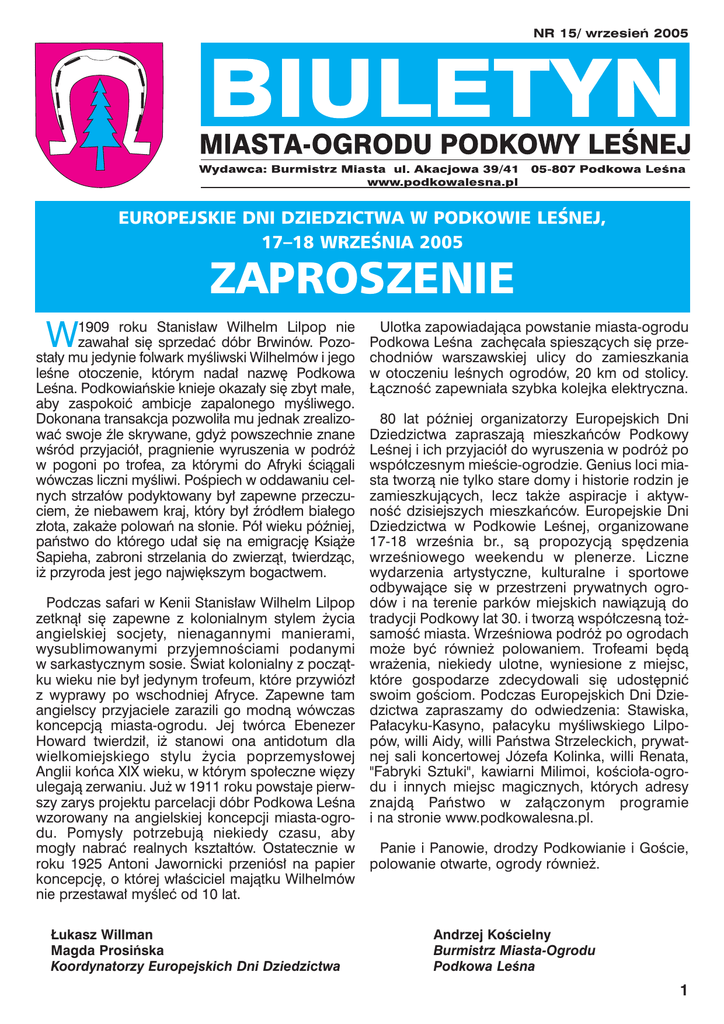 NR 15/ wrzesień 2005 EUROPEJSKIE DNI DZIEDZICTWA W PODKOWIE LEŚNEJ, 17–18 WRZEŚNIA 2005 ZAPROSZENIE 1909 roku Stanisław Wilhelm Lilpop nie W zawahał się sprzedać dóbr Brwinów. Pozostały mu jedynie folwark myśliwski Wilhelmów i jego leśne otoczenie, którym nadał nazwę Podkowa Leśna. Podkowiańskie knieje okazały się zbyt małe, aby zaspokoić ambicje zapalonego myśliwego. Dokonana transakcja pozwoliła mu jednak zrealizować swoje źle skrywane, gdyż powszechnie znane wśród przyjaciół, pragnienie wyruszenia w podróż w pogoni po trofea, za którymi do Afryki ściągali wówczas liczni myśliwi. Pośpiech w oddawaniu celnych strzałów podyktowany był zapewne przeczuciem, że niebawem kraj, który był źródłem białego złota, zakaże polowań na słonie. Pół wieku później, państwo do którego udał się na emigrację Książe Sapieha, zabroni strzelania do zwierząt, twierdząc, iż przyroda jest jego największym bogactwem. Podczas safari w Kenii Stanisław Wilhelm Lilpop zetknął się zapewne z kolonialnym stylem życia angielskiej socjety, nienagannymi manierami, wysublimowanymi przyjemnościami podanymi w sarkastycznym sosie. Świat kolonialny z początku wieku nie był jedynym trofeum, które przywiózł z wyprawy po wschodniej Afryce. Zapewne tam angielscy przyjaciele zarazili go modną wówczas koncepcją miasta-ogrodu. Jej twórca Ebenezer Howard twierdził, iż stanowi ona antidotum dla wielkomiejskiego stylu życia poprzemysłowej Anglii końca XIX wieku, w którym społeczne więzy ulegają zerwaniu. Już w 1911 roku powstaje pierwszy zarys projektu parcelacji dóbr Podkowa Leśna wzorowany na angielskiej koncepcji miasta-ogrodu. Pomysły potrzebują niekiedy czasu, aby mogły nabrać realnych kształtów. Ostatecznie w roku 1925 Antoni Jawornicki przeniósł na papier koncepcję, o której właściciel majątku Wilhelmów nie przestawał myśleć od 10 lat. Łukasz Willman Magda Prosińska Koordynatorzy Europejskich Dni Dziedzictwa Ulotka zapowiadająca powstanie miasta-ogrodu Podkowa Leśna zachęcała spieszących się przechodniów warszawskiej ulicy do zamieszkania w otoczeniu leśnych ogrodów, 20 km od stolicy. Łączność zapewniała szybka kolejka elektryczna. 80 lat później organizatorzy Europejskich Dni Dziedzictwa zapraszają mieszkańców Podkowy Leśnej i ich przyjaciół do wyruszenia w podróż po współczesnym mieście-ogrodzie. Genius loci miasta tworzą nie tylko stare domy i historie rodzin je zamieszkujących, lecz także aspiracje i aktywność dzisiejszych mieszkańców. Europejskie Dni Dziedzictwa w Podkowie Leśnej, organizowane 17-18 września br., są propozycją spędzenia wrześniowego weekendu w plenerze. Liczne wydarzenia artystyczne, kulturalne i sportowe odbywające się w przestrzeni prywatnych ogrodów i na terenie parków miejskich nawiązują do tradycji Podkowy lat 30. i tworzą współczesną tożsamość miasta. Wrześniowa podróż po ogrodach może być również polowaniem. Trofeami będą wrażenia, niekiedy ulotne, wyniesione z miejsc, które gospodarze zdecydowali się udostępnić swoim gościom. Podczas Europejskich Dni Dziedzictwa zapraszamy do odwiedzenia: Stawiska, Pałacyku-Kasyno, pałacyku myśliwskiego Lilpopów, willi Aidy, willi Państwa Strzeleckich, prywatnej sali koncertowej Józefa Kolinka, willi Renata, "Fabryki Sztuki", kawiarni Milimoi, kościoła-ogrodu i innych miejsc magicznych, których adresy znajdą Państwo w załączonym programie i na stronie www.podkowalesna.pl. Panie i Panowie, drodzy Podkowianie i Goście, polowanie otwarte, ogrody również. Andrzej Kościelny Burmistrz Miasta-Ogrodu Podkowa Leśna 1