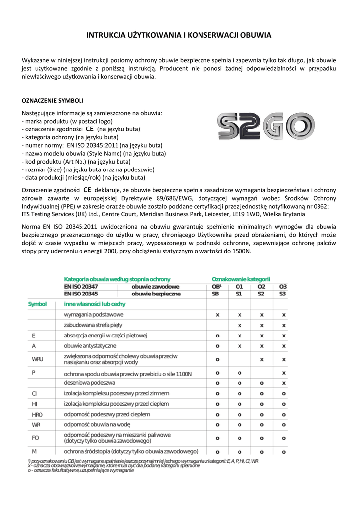INTRUKCJA UŻYTKOWANIA I KONSERWACJI OBUWIA Wykazane w niniejszej instrukcji poziomy ochrony obuwie bezpieczne spełnia i zapewnia tylko tak długo, jak obuwie jest użytkowane zgodnie z poniższą instrukcją. Producent nie ponosi żadnej odpowiedzialności w przypadku niewłaściwego użytkowania i konserwacji obuwia. OZNACZENIE SYMBOLI Następujące informacje są zamieszczone na obuwiu: - marka produktu (w postaci logo) - oznaczenie zgodności CE (na języku buta) - kategoria ochrony (na języku buta) - numer normy: EN ISO 20345:2011 (na języku buta) - nazwa modelu obuwia (Style Name) (na języku buta) - kod produktu (Art No.) (na języku buta) - rozmiar (Size) (na jęzku buta oraz na podeszwie) - data produkcji (miesiąc/rok) (na języku buta) Oznaczenie zgodności CE deklaruje, że obuwie bezpieczne spełnia zasadnicze wymagania bezpieczeństwa i ochrony zdrowia zawarte w europejskiej Dyrektywie 89/686/EWG, dotyczącej wymagań wobec Środków Ochrony Indywidualnej (PPE) w zakresie oraz że obuwie zostało poddane certyfikacji przez jednostkę notyfikowaną nr 0362: ITS Testing Services (UK) Ltd., Centre Court, Meridian Business Park, Leicester, LE19 1WD, Wielka Brytania Norma EN ISO 20345:2011 uwidoczniona na obuwiu gwarantuje spełnienie minimalnych wymogów dla obuwia bezpiecznego przeznaczonego do użytku w pracy, chroniącego Użytkownika przed obrażeniami, do których może dojść w czasie wypadku w miejscach pracy, wyposażonego w podnoski ochronne, zapewniające ochronę palców stopy przy uderzeniu o energii 200J, przy obciążeniu statycznym o wartości do 1500N. UTRZYMANIE I KONSERWACJA Przed założeniem obuwia zaleca się sprawdzenie zamknięcia i integralność wszystkich elementów. Obuwie powinno być czyszczone wodą za pomocą miękkiej szczoteczki. Nigdy nie wolno do czyszczenia używać produktów chemicznych. Mogą one uszkodzić materiał powodując naruszenie jego składu, co może być niezauważalne dla użytkownika, ale które może spowodować poważne obniżenie wartości bezpieczeństwa obuwia. Obuwie należy przechowywać w suchym i czystym pomieszczeniu w temperaturze pokojowej. Przemoczonego obuwia nie należy nigdy pozostawiać w bezpośrednim kontakcie z ogrzaną powierzchnią (np. kaloryferów, grzejników, itp.). Osuszaj obuwie w pomieszczeniu z temperaturą pokojową. Jeżeli obuwie jest zaopatrzone w podnosek ochronny i/lub wkładkę antyprzebiciową, sprawdź ich obecność przed użyciem. INSTRUKCJA UŻYCIA Obuwie należy skontrolować przed każdym użyciem. Jeżeli nie spełnia wszystkich swoich funkcji, nie należy go użytkować aż do momentu ich przywrócenia. Szczególną uwagę należy zwrócić na: - prawidłowe funkcjonowanie zamknięć i (jeśli występują) systemu szybkiego wypinania - głębokość urzeźbienia podeszwy - obecność ochrony śródstopia (wkładka antyprzebiciowa) PRZECHOWYWANIE OBUWIA Ze względu na różne czynniki (temperatura, wilgoć, itp.) nie jest możliwe zdefiniowanie dokładnego terminu ważności użytkowania obuwia. Zazwyczaj dla obuwia poliuretanowego lub z poliuretanową podeszwą można przyjąć maksymalny czas użytkowania – 7 lat. Obuwie powinno być magazynowe w miejscu suchym, z dala od promieni słonecznych. Obuwie powinno znajdować się pojedynczym opakowaniu, najlepiej od producenta. INFORMACJE DOTYCZĄCE OBUWIA ANTYSTATYCZNEGO Obuwia antystatycznego używa się tam, gdzie niezbędne jest zmniejszenie elektrostatycznego ładunku i jego odprowadzenie tak, aby eliminować niebezpieczeństwo zapalenia iskrą, np. materiałów łatwopalnych, oparów oraz tam, gdzie nie jest zupełnie eliminowane niebezpieczeństwo porażenia prądem przy korzystaniu z jakiegokolwiek urządzenia lub jego części przewodzącej prąd elektryczny. Trzeba jednak pamiętać, że obuwie antystatyczne nie zapewnia ochrony przed porażeniem prądem elektrycznym, bo izoluje tylko stopy od podłoża. Doświadczenia pokazują, iż dla celów antystatycznych osiąganych drogą odprowadzenia ładunku poprzez produkt, wystarcza zazwyczaj opór elektryczny mniejszy niż 1000 MΩ przez cały okres używalności. Wartość 100kΩ jest definiowana jako najniższa granica oporu nowego wyrobu, która gwarantuje ograniczoną ochronę przed niebezpieczeństwem porażenia prądem elektrycznym lub pożarem powstałym z powodu uszkodzenia przy urządzeniu elektrycznym pracującym przy napięciu do 250V. Pracownicy powinni jednak być świadomi, że w niektórych warunkach obuwie nie stanowi wystarczającej ochrony, dlatego powinni używać innych, dostępnych ochron w tej materii. Opór elektryczny obuwia może się zmieniać w wyniku zginania, ścierania podeszwy lub pod wpływem wilgoci (w tym również potu). Obuwie nie spełnia wymaganej funkcji w mokrym środowisku. W miejscach, gdzie obuwie antystatyczne jest stosowane, opór podłoża powinien być taki, aby nie przewyższał ochrony dostarczanej przez obuwie. Do obuwia pomiędzy podeszwę obuwia a stopę, nie wolno wkładać żadnych wkładów izolacyjnych za wyjątkiem zwykłych skarpet. W wypadku wymiany oryginalnej wyściółki, należy sprawdzić elektryczne właściwości kombinacji obuwie-wyściółka. Jeżeli w obuwiu są stosowane wymienne wyściółki, zaleca się używanie wyściółek dostarczanych przez producenta tego obuwia. OZNACZENIE PRODUCENTA: P4S Sp. z o.o. ul. Turyńska 80, lok. C1 43-100 Tychy Polska