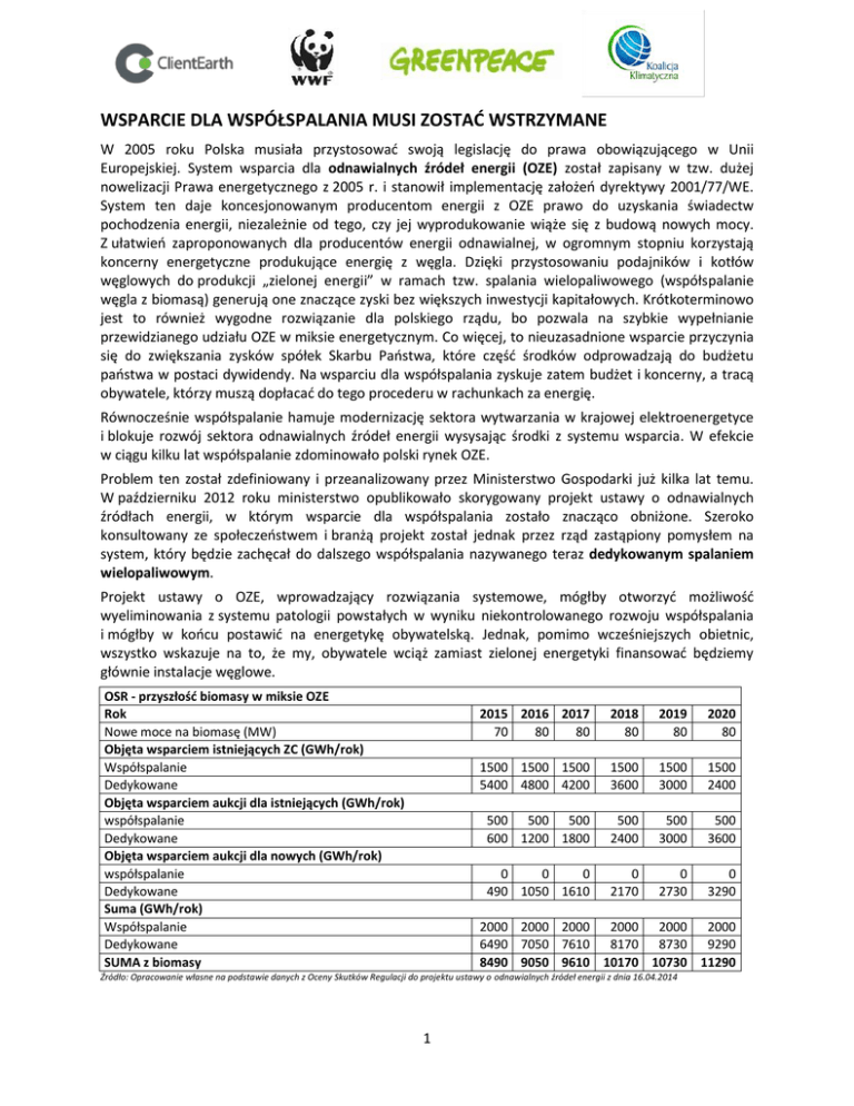 WSPARCIE DLA WSPÓŁSPALANIA MUSI ZOSTAĆ WSTRZYMANE W 2005 roku Polska musiała przystosować swoją legislację do prawa obowiązującego w Unii Europejskiej. System wsparcia dla odnawialnych źródeł energii (OZE) został zapisany w tzw. dużej nowelizacji Prawa energetycznego z 2005 r. i stanowił implementację założeń dyrektywy 2001/77/WE. System ten daje koncesjonowanym producentom energii z OZE prawo do uzyskania świadectw pochodzenia energii, niezależnie od tego, czy jej wyprodukowanie wiąże się z budową nowych mocy. Z ułatwień zaproponowanych dla producentów energii odnawialnej, w ogromnym stopniu korzystają koncerny energetyczne produkujące energię z węgla. Dzięki przystosowaniu podajników i kotłów węglowych do produkcji „zielonej energii” w ramach tzw. spalania wielopaliwowego (współspalanie węgla z biomasą) generują one znaczące zyski bez większych inwestycji kapitałowych. Krótkoterminowo jest to również wygodne rozwiązanie dla polskiego rządu, bo pozwala na szybkie wypełnianie przewidzianego udziału OZE w miksie energetycznym. Co więcej, to nieuzasadnione wsparcie przyczynia się do zwiększania zysków spółek Skarbu Państwa, które część środków odprowadzają do budżetu państwa w postaci dywidendy. Na wsparciu dla współspalania zyskuje zatem budżet i koncerny, a tracą obywatele, którzy muszą dopłacać do tego procederu w rachunkach za energię. Równocześnie współspalanie hamuje modernizację sektora wytwarzania w krajowej elektroenergetyce i blokuje rozwój sektora odnawialnych źródeł energii wysysając środki z systemu wsparcia. W efekcie w ciągu kilku lat współspalanie zdominowało polski rynek OZE. Problem ten został zdefiniowany i przeanalizowany przez Ministerstwo Gospodarki już kilka lat temu. W październiku 2012 roku ministerstwo opublikowało skorygowany projekt ustawy o odnawialnych źródłach energii, w którym wsparcie dla współspalania zostało znacząco obniżone. Szeroko konsultowany ze społeczeństwem i branżą projekt został jednak przez rząd zastąpiony pomysłem na system, który będzie zachęcał do dalszego współspalania nazywanego teraz dedykowanym spalaniem wielopaliwowym. Projekt ustawy o OZE, wprowadzający rozwiązania systemowe, mógłby otworzyć możliwość wyeliminowania z systemu patologii powstałych w wyniku niekontrolowanego rozwoju współspalania i mógłby w końcu postawić na energetykę obywatelską. Jednak, pomimo wcześniejszych obietnic, wszystko wskazuje na to, że my, obywatele wciąż zamiast zielonej energetyki finansować będziemy głównie instalacje węglowe. OSR - przyszłość biomasy w miksie OZE Rok Nowe moce na biomasę (MW) Objęta wsparciem istniejących ZC (GWh/rok) Współspalanie Dedykowane Objęta wsparciem aukcji dla istniejących (GWh/rok) współspalanie Dedykowane Objęta wsparciem aukcji dla nowych (GWh/rok) współspalanie Dedykowane Suma (GWh/rok) Współspalanie Dedykowane SUMA z biomasy 2015 2016 2017 70 80 80 2018 80 2019 80 2020 80 1500 1500 1500 5400 4800 4200 1500 3600 1500 3000 1500 2400 500 500 500 600 1200 1800 500 2400 500 3000 500 3600 0 0 0 490 1050 1610 0 2170 0 2730 0 3290 2000 2000 2000 2000 2000 2000 6490 7050 7610 8170 8730 9290 8490 9050 9610 10170 10730 11290 Źródło: Opracowanie własne na podstawie danych z Oceny Skutków Regulacji do projektu ustawy o odnawialnych źródeł energii z dnia 16.04.2014 1 5 POWODÓW, DLA KTÓRYCH WSPARCIE DLA WSPÓŁSPALANIA MUSI ZOSTAĆ WSTRZYMANE 1. ZAKŁÓCENIE KONKURENCJI Przydzielanie zielonych certyfikatów instalacjom współspalania biomasy z węglem stanowi pomoc publiczną w rozumieniu art. 107 ust. 1 Traktatu o Funkcjonowaniu Unii Europejskiej. W drodze ustawy Prawo energetyczne państwo wykreowało zielone certyfikaty jako uprawnienia o wartości ekonomicznej. Zgodnie z art.9e ustawy Prawo Energetyczne, prawa majątkowe wynikające z certyfikatów są zbywalne i mogą stanowić przedmiot obrotu na Towarowej Giełdzie Energii. Certyfikaty przydzielane są przedsiębiorstwom bezpłatnie, bez żadnego ekonomicznego świadczenia wzajemnego. Przez wykreowanie zielonych certyfikatów jako uprawnień o wartości majątkowej i bezpłatne przydzielenie ich spółkom energetycznym państwo polskie zrzekło się zasobów publicznych, które w przypadku ich sprzedaży, mogłyby zasilić budżet. System ten w istotnym stopniu różni się od niemieckiego systemu taryf gwarantowanych (feedin tariffs), który został uznany przez Trybunał Sprawiedliwości UE za niestanowiący pomocy publicznej (wyrok w sprawie C-379/98 PreussenElektra). W tamtym przypadku zaangażowane we wsparcie były jednak wyłącznie przedsiębiorstwa prywatne, a więc nie doszło do użycia zasobów publicznych. Polski rynek energetyczny jest zaś zdominowany przez kontrolowane przez Skarb Państwa przedsiębiorstwa publiczne. Pomoc publiczna w postaci zielonych certyfikatów powinna być notyfikowana Komisji Europejskiej (Dyrekcja Generalna ds. Konkurencji) i nie powinna być wprowadzona w życie przed finalną decyzją Komisji. Tymczasem, system ten nie był notyfikowany Komisji przed wejściem w życie. Jak orzekł Trybunał Sprawiedliwości Unii Europejskiej, nienotyfikowana pomoc publiczna jest niezgodna z prawem (wyrok TSUE w sprawie C-301/87 Francja p. Komisji). Polski system zielonych certyfikatów, w zakresie dotyczącym współspalania biomasy z węglem w blokach węglowych, stanowi de facto pośrednią pomoc dla produkcji energii z węgla. Co więcej, według prawa Unii Europejskiej – Wytyczne Wspólnotowe w sprawie pomocy państwa na ochronę środowiska (2008/C 82/01, pkt 110) oraz Wytyczne w sprawie pomocy państwa na ochronę środowiska i cele związane z energią w latach 2014-2020 (2014/C 200/01, pkt 136) – pomoc publiczna w postaci zielonych certyfikatów może być zatwierdzona przez Komisję tylko w sytuacji, gdy nie prowadzi to do nadmiernego wsparcia. W przypadku pomocy udz