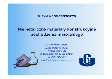 CHEMIA A SPOŁECZEŃSTWO Niemetaliczne materiały konstrukcyjne pochodzenia mineralnego Marek Kwiatkowski Zakład Dydaktyki Chemii Wydział Chemii UG ul. Sobieskiego 18, 80-952 Gdańsk tel. (058) 3450 462 e-mail: [email protected] Rozpowszechnienie pierwiastków w skorupie ziemskiej Na K Mg H Ti Cl P Mn 2.6% 2.4% 1.9% 0.9% 0.6% 0.2% 0.1% 0.1% C S Ba N F Sr Inne Cu 0.0068% 0.08% 0.06% 0.04% 0.03% 0.03% 0.02% 0.47% Pospolite minerały • • • • Kwarc SiO2 Skaleń K(Na)2O·Al2O3·6SiO2 Mika KAl2(AlSi3O10)(F,OH)2 Kalcyt CaCO3 Kamienie szlachetne Różnorodne formy krystaliczne dwutlenku krzemu SiO2 ametyst agat opal Skały magmowe Bazalt • • powstaje wskutek szybkiego stygnięcia magmy na powierzchni Ziemi, drobnokrystaliczna struktura główne składniki: plagioklaz, piroksen i oliwin plagioklaz: NaAlSi3O8 - CaAl2Si2O8 piroksen: XY(Si,Al)2O6 X: Ca, Mg, Fe(II), Na Y: Fe(III), Cr(III), Al oliwin: (Mg,Fe)2SiO4 Skały magmowe Granit • • powstaje wskutek powolnego stygnięcia magmy w głębi Ziemi, gruboziarnista struktura krystaliczna główne składniki: kwarc, skaleń, mika kwarc: SiO2 mika: X2Y4-6Z8O20(OH,F)4 X: K, Na, Ca Y: Al, Mg, Fe Z: Al, Si, Ti skaleń: (Na,K)AlSi3O8 - CaAl2Si2O8 Skały osadowe Piasek • • produkt wietrzenia skał magmowych silnie rozdrobniony kwarc, domieszki związków żelaza Skały osadowe Glina • • Produkt wietrzenia glinokrzemianów, np. skaleni różnorodny skład chemiczny, np. (MgFe,Al)3(Si,Al)4O10(OH)2(H2O)4 Skały osadowe Piaskowiec silnie rozdrobniony materiał skalny, głównie kwarc (również skaleń), scementowany kalcytem, gliną lub krzemionką • wyraźnie ziarnista struktura Skały osadowe Wapień • • • skała pochodzenia organicznego, scementowane szczątki szkieletów, muszli, pancerzyków, itp. częsta obecność skamielin główny składnik CaCO3 Skały metamorficzne Marmur • przekrystalizowane skały wapienne Kwarcyt • przetworzone piaskowce Skały metamorficzne Łupek • przetworzone gliny i iły Gnejs • • powstały w wyniku przetworzenia różnych skał, z udziałem magmowych warstwowa struktura Gips • Minerał powstały wskutek chemicznego wytrącania/krystalizacji siarczanu wapnia z roztworu wodnego CaSO4 · 2H2O • Drobnokrystaliczna odmiana: alabaster • Róża pustyni: zlepek płaskich kryształów gipsu zanieczyszczonych ziarenkami piasku, powstaje podczas odparowywania płytkich zbiorników Gips, cd. • • Ogrzewanie gipsu prowadzi do powstania białego proszku półhydratu CaSO4 · 1/2H2O Półhydrat zmieszany z wodą twardnieje w sztywną masę dwuhydratu, reakcja jest egzotermiczna. Szkło: struktura kwarc wiązania w stałym SiO2 czysty SiO2 tt = 1710oC dodatek Na2O, CaO: tt = 700oC szkło Szkło: produkcja • • • Mieszanina piasku (SiO2), sody (Na2CO3) i wapienia (CaCO3) Stopienie w piecu szklarskim w 1500oC, wydzielenie CO2 Formowanie – wydmuchiwanie – wyciąganie w płyty – walcowanie – odlewanie – wyciąganie włókien Kolorowe szkło Au: czerwone SnO2: mleczne MnO2: fioletowe UO3: zielonkawa fluorescencja Cu2O: błękitne FeO: ciemnozielone Fe2O3: brunatne Cr2O3: zielone CoO: ciemnoniebieskie Szkło specjalne • PbO: kryształy • B2O3: szkło laboratoryjne (Pyrex) • PbO : SiO2 4:1: szkło pochłaniające promieniowanie X • CdO: szkło pochłaniające neutrony • As2O3: szkło przeźroczyste dla IR Duralex, Luminarc, Arcopal, Arcoroc, Pyroceram Drobnokrystaliczna struktura osiągnięta przez wygrzewanie w wysokiej temperaturze Recykling szkła Dodawanie stłuczki szklanej do wsadu surowcowego • • tani koszt recyklingu uzyskiwanie pełnowartościowego produktu • ograniczona możliwość barwienia szkła Tworzywa ceramiczne • • • • • • • • cegła dachówka kafle kafelki ceramika gliniana fajans porcelana ceramika techniczna Produkcja ceramiki • Wymieszać surowce: – – – – glinę, np. Al2O3·2SiO2·2H2O skaleń, np. K2O·Al2O3·6SiO2 krzemionkę SiO2 wodę H2O • Uformować przedmiot • Wypalić w piecu Proces wypalania • Glina składa się z miniaturowych płytek. • Powierzchnia płytek jest pokryta grupami hydroksylowymi OH. • W mokrej glinie, grupy OH tworzą wiązania wodorowe z cząsteczkami wody, dzięki czemu płytki mogą się ślizgać po sobie, glina jest plastyczna. • Po wysuszeniu (utracie wody) grupy OH zostają zaangażowane w tworzenie wiązań pomiędzy płytkami. Ruch płytek po sobie zostaje zahamowany, wysuszona glina twardnieje. • Podczas wypalania skaleń zmienia się w szkliwo łączące ze sobą trwale wszystkie składniki • Krzemionka zapobiega kurczeniu się masy ceramicznej podczas suszenia i wypalania. Cement: produkcja • Surowce: – – – – • • • wapień lub kreda (CaCO3) piasek (SiO2) glina, kaolin (glinokrzemiany) tlenek żelaza (Fe2O3) Prażenie sproszkowanej mieszaniny w piecu obrotowym w temperaturze 870oC: utrata H2O i CO2, produkt 'klinkier' Mielenie klinkieru na drobny proszek z dodatkiem niewielkiej ilości gipsu CaSO4 Produkt cement o składzie: 60-67% CaO, 17-25% SiO2, 3-8% Al2O3, do 6% Fe2O3, niewielkie ilości MgO, MgSO4, Na2O, K2O. Beton Skład betonu: cement, piasek (żwir, kruszywo), woda Twardnienie betonu: • • • • hydroliza krzemianów wapnia zawartych w cemencie prowadzi do powstania gęstego żelu silne przywieranie żelu do ziaren wypełnienia powoduje wstępne tężenie betonu (duża powierzchnia oddziaływania) powolna krystalizacja prowadzi do powstania masy poprzerastanych kryształów (wzrost odporności mechanicznej) woda jest niezbędna do prawidłowego twardnienia betonu Beton wykazuje wysoką odporność na ściskanie, ale słabą na rozciąganie, stąd konieczność zbrojenia betonu stalą, Ultra-czysty krzem Do produkcji 'chipów' elektronicznych używa się bardzo czystego krzemu domieszkowanego w ściśle kontrolowanych warunkach innymi pierwiastkami Otrzymywanie: stapianie krzemionki z węglem w łuku elektrycznym (1900oC), czystość 99% 