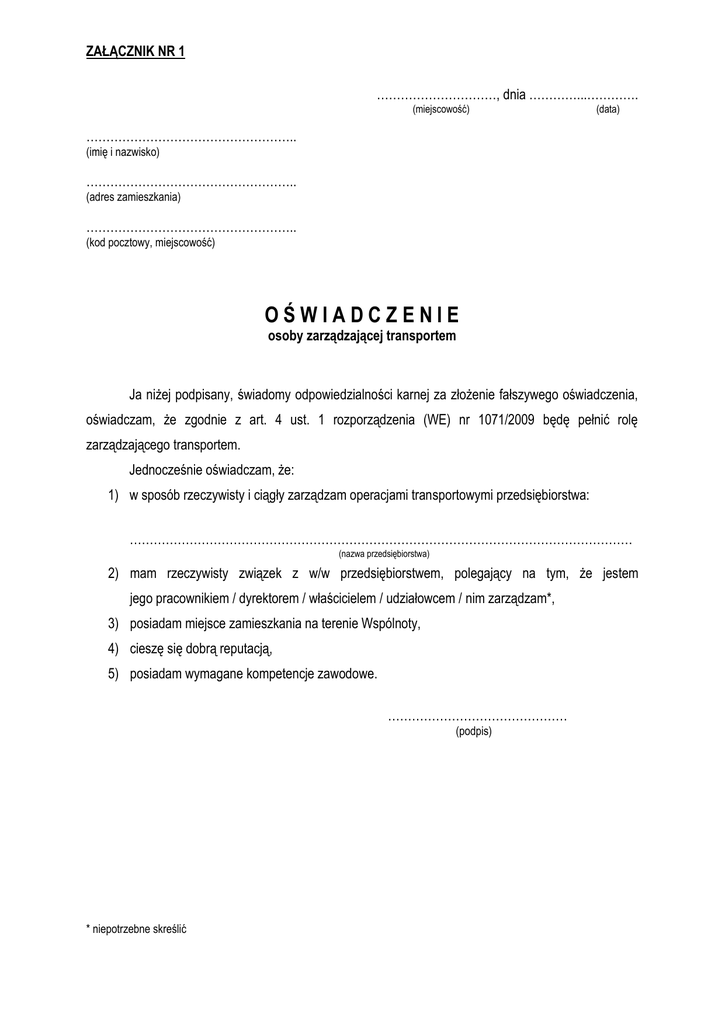 ZAŁĄCZNIK NR 1 …………………………, dnia …………...…………. (miejscowość) (data) …………………………………………….. (imię i nazwisko) …………………………………………….. (adres zamieszkania) …………………………………………….. (kod pocztowy, miejscowość) OŚWIADCZENIE osoby zarządzającej transportem Ja niżej podpisany, świadomy odpowiedzialności karnej za złożenie fałszywego oświadczenia, oświadczam, że zgodnie z art. 4 ust. 1 rozporządzenia (WE) nr 1071/2009 będę pełnić rolę zarządzającego transportem. Jednocześnie oświadczam, że: 1) w sposób rzeczywisty i ciągły zarządzam operacjami transportowymi przedsiębiorstwa: ……………………………………………………………………………………………………………… (nazwa przedsiębiorstwa) 2) mam rzeczywisty związek z w/w przedsiębiorstwem, polegający na tym, że jestem jego pracownikiem / dyrektorem / właścicielem / udziałowcem / nim zarządzam*, 3) posiadam miejsce zamieszkania na terenie Wspólnoty, 4) cieszę się dobrą reputacją, 5) posiadam wymagane kompetencje zawodowe. ……………………………………… (podpis) * niepotrzebne skreślić ZAŁĄCZNIK NR 2 …………………………, dnia …………...…………. (miejscowość) (data) …………………………………………….. (imię i nazwisko) …………………………………………….. (adres zamieszkania) …………………………………………….. (kod pocztowy, miejscowość) OŚWIADCZENIE osoby zarządzającej transportem na mocy umowy Ja niżej podpisany, świadomy odpowiedzialności karnej za złożenie fałszywego oświadczenia, oświadczam, że jako osoba uprawniona na mocy umowy do wykonywania zadań zarządzającego transportem w imieniu przedsiębiorcy: ……………………………………………………………………………………………………………………… (nazwa przedsiębiorstwa) będę kierował operacjami transportowymi nie więcej niż czterech różnych przedsiębiorstw, realizowanymi za pomocą połączonej floty, liczącej ogółem nie więcej niż 50 pojazdów. Jednocześnie oświadczam, że mój zakres obowiązków związanych z funkcją zarządzającego transportem obejmuje w szczególności: 1) utrzymanie i konserwację pojazdów, 2) sprawdzanie umów i dokumentów przewozowych, 3) podstawową księgowość, 4) przydzielanie ładunków lub usług kierowcom i pojazdom, 5) sprawdzanie procedur związanych z bezpieczeństwem. ……………………………………… (podpis) ZAŁĄCZNIK NR 3 …………………………, dnia …………...…………. (miejscowość) (data) …………………………………………….. (imię i nazwisko) …………………………………………….. (adres zamieszkania) …………………………………………….. (kod pocztowy, miejscowość) OŚWIADCZENIE o posiadaniu bazy eksploatacyjnej Ja niżej podpisany, świadomy odpowiedzialności karnej za złożenie fałszywego oświadczenia, oświadczam, że będę prowadził działalność związaną z pojazdami zarejestrowanymi lub w inny sposób wprowadzonymi do ruchu zgodnie z przepisami krajowymi, w sposób rzeczywisty i ciągły oraz przy użyciu niezbędnego sprzętu administracyjnego, a także odpowiedniego sprzętu technicznego i urządzeń technicznych, w bazie eksploatacyjnej, która znajduje się na terenie Rzeczypospolitej Polskiej w: ……………………………………………………………………………………………………………………… (adres bazy eksploatacyjnej) ……………………………………… (podpis) ZAŁĄCZNIK NR 4 …………………………, dnia …………...…………. (miejscowość) (data) …………………………………………….. (imię i nazwisko) …………………………………………….. (adres zamieszkania) …………………………………………….. (kod pocztowy, miejscowość) OŚWIADCZENIE o zamiarze zatrudniania przez przedsiębiorcę kierowców Ja niżej podpisany, świadomy odpowiedzialności karnej za złożenie fałszywego oświadczenia, oświadczam, że w stosunku do zatrudnionych przeze mnie kierowców, a także innych osób niezatrudnionych przeze mnie, lecz wykonujących osobiście przewozy na moją rzecz, nie orzeczono zakazu wykonywania zawodu kierowcy. ……………………………………… (podpis) ZAŁĄCZNIK NR 5 …………………………, dnia …………...…………. (miejscowość) (data) …………………………………………….. (imię i nazwisko) …………………………………………….. (adres zamieszkania) …………………………………………….. (kod pocztowy, miejscowość) OŚWIADCZENIE o niekaralności za przestępstwa umyślne w dziedzinach określonych w art. 6 rozporządzenia (WE) nr 1071/2009 Ja niżej podpisany legitymujący/a się dowodem osobistym serii ............... nr................................, PESEL ............................., świadomy odpowiedzialności karnej za złożenie fałszywego oświadczenia, będąc właścicielem / * współwłaścicielem / * osobą wchodzącą w skład organu zarządzającego / * ................................................................................................................................................................ (nazwa przedsiębiorstwa) oświadczam, że nie jestem osobą skazaną prawomocnym wyrokiem sądu oraz nie nałożono na mnie sankcji za popełnienie poważnego naruszenia obowiązujących przepisów krajowych w następujących dziedzinach: prawo handlowe, prawo upadłościowe, płace i warunki zatrudnienia w zawodzie, prawo o ruchu drogowym, odpowiedzialność zawodowa, handel ludźmi lub narkotykami oraz nie zostałem w jednym lub kilku pańs