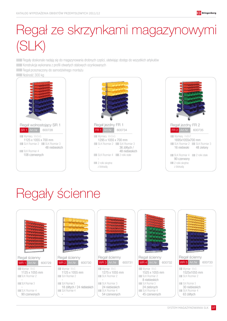 Katalog wyposażenia obiektów Przemysłowych 2011/12 Regał ze skrzynkami magazynowymi (SLK) Regały doskonale nadają się do magazynowania drobnych części, ułatwiając dostęp do wszystkich artykułów Konstrukcja wykonana z profili otwartych stalowych ocynkowanych Regał przeznaczony do samodzielnego montażu Nośność 300 kg Regał jezdny FR 1 Regał wolnostojący SR 1 SR 1 Art.Nr FR 1 Art.Nr 600728 Wymiary WxSxG SLK Rozmiar 4 108 czerwonych 1695x1055x700 mm SLK Rozmiar 2 SLK Rozmiar 3 SLK Rozmiar 2 SLK Rozmiar 3 SLK Rozmiar 4 2 rolki stałe SLK Rozmiar 4 2 rolki stałe - 48 niebieskich 600735 Wymiary HxBxT 1295 x 1055 x 700 mm SLK Rozmiar 3 - FR 2 Art.Nr 600734 Wymiary WxSxG 1125 x 1055 x 700 mm SLK Rozmiar 2 Regał jezdny FR 2 36 żółtych / 48 niebieskich 16 niebieski - 90 czerwony 2 rolki skrętne z blokadą 2 rolki skrętne z blokadą 48 zielony Regały ścienne WR 1 Art.Nr Regał ścienny Regał ścienny Regał ścienny 600729 WR 2 Art.Nr 600730 WR 3 Art.Nr WR 4 Art.Nr Wymiar WxS Wymiar WxS Wymiar WxS Wymiar WxS SLK Rozmiar 2 SLK Rozmiar 2 SLK Rozmiar 2 SLK Rozmiar 2 SLK Rozmiar 3 SLK Rozmiar 3 SLK Rozmiar 3 SLK Rozmiar 3 SLK Rozmiar 4 SLK Rozmiar 4 1125 x 1055 mm - SLK Rozmiar 4 90 czerwonych 1125 x 1055 mm - 18 żółtych / 24 niebieskich SLK Rozmiar 4 - 1275 x 1055 mm - 24 niebieskich 54 czerwonych Regał ścienny Regał ścienny 600731 600732 1525 x 1055 mm 8 niebieskich WR 5 Art.Nr 600733 Wymiar WxS 1525x1055 mm SLK Rozmiar 2 - SLK Rozmiar 3 24 zielonych 30 niebieskich 45 czerwonych 63 żółtych SLK Rozmiar 4 system magazynowania SLK 37