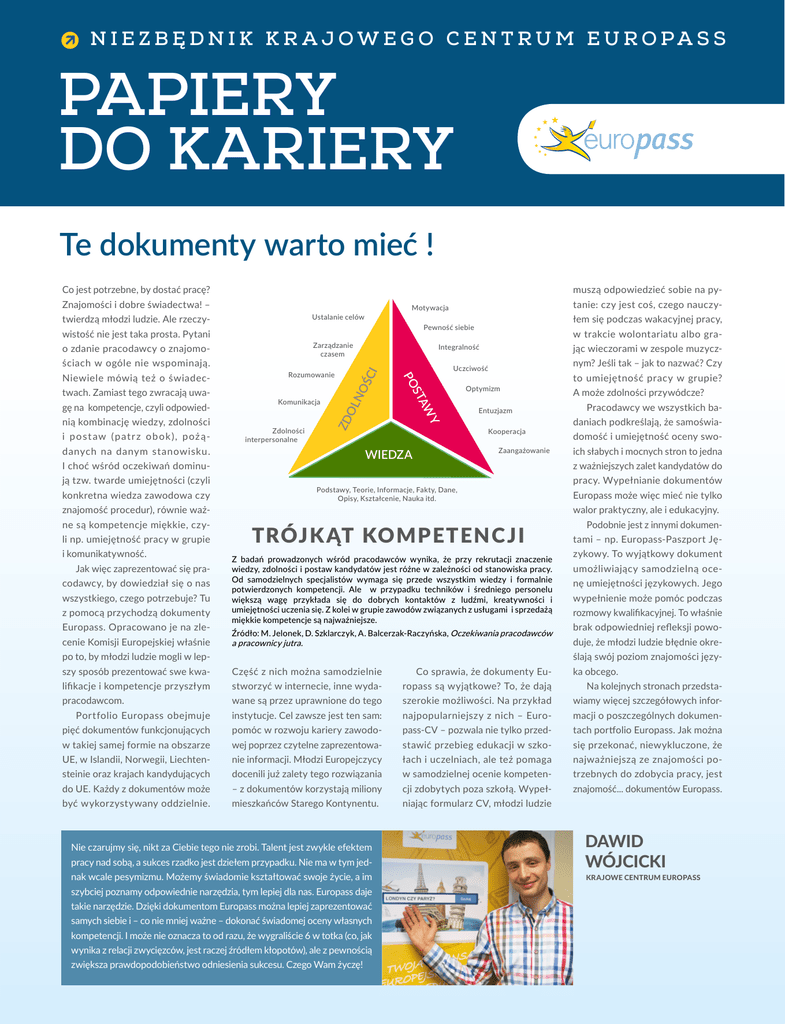 N I E Z B Ę D N I K K R A J OW E G O C E N T R U M E U R O PA S S PAPIERY DO KARIERY Te dokumenty warto mieć ! muszą odpowiedzieć sobie na py- Co jest potrzebne, by dostać pracę? Znajomości i dobre świadectwa! – twierdzą młodzi ludzie. Ale rzeczy- Zarządzanie czasem ściach w ogóle nie wspominają. Zdolności interpersonalne ZD O i p os t aw (p at r z o b o k ), p oż ądanych na danym stanowisku. ją tzw. twarde umiejętności (czyli konkretna wiedza zawodowa czy znajomość procedur), równie ważne są kompetencje miękkie, czyli np. umiejętność pracy w grupie i komunikatywność. Jak więc zaprezentować się pracodawcy, by dowiedział się o nas wszystkiego, czego potrzebuje? Tu z pomocą przychodzą dokumenty Europass. Opracowano je na zlecenie Komisji Europejskiej właśnie Optymizm Entuzjazm Kooperacja Zaangażowanie WIEDZA I choć wśród oczekiwań dominu- nym? Jeśli tak – jak to nazwać? Czy Y nią kombinację wiedzy, zdolności Komunikacja jąc wieczorami w zespole muzycz- Uczciwość AW ST PO gę na kompetencje, czyli odpowied- Rozumowanie w trakcie wolontariatu albo gra- Integralność LN OŚ CI o zdanie pracodawcy o znajomo- twach. Zamiast tego zwracają uwa- łem się podczas wakacyjnej pracy, Pewność siebie wistość nie jest taka prosta. Pytani Niewiele mówią też o świadec- tanie: czy jest coś, czego nauczy- Motywacja Ustalanie celów to umiejętność pracy w grupie? A może zdolności przywódcze? Pracodawcy we wszystkich badaniach podkreślają, że samoświadomość i umiejętność oceny swoich słabych i mocnych stron to jedna z ważniejszych zalet kandydatów do Podstawy, Teorie, Informacje, Fakty, Dane, Opisy, Kształcenie, Nauka itd. TRÓJK ĄT KOMPETENC JI Z badań prowadzonych wśród pracodawców wynika, że przy rekrutacji znaczenie wiedzy, zdolności i postaw kandydatów jest różne w zależności od stanowiska pracy. Od samodzielnych specjalistów wymaga się przede wszystkim wiedzy i formalnie potwierdzonych kompetencji. Ale w przypadku techników i średniego personelu większą wagę przykłada się do dobrych kontaktów z ludźmi, kreatywności i umiejętności uczenia się. Z kolei w grupie zawodów związanych z usługami i sprzedażą miękkie kompetencje są najważniejsze. Źródło: M. Jelonek, D. Szklarczyk, A. Balcerzak-Raczyńska, Oczekiwania pracodawców a pracownicy jutra. po to, by młodzi ludzie mogli w lep- pracy. Wypełnianie dokumentów Europass może więc mieć nie tylko walor praktyczny, ale i edukacyjny. Podobnie jest z innymi dokumentami – np. Europass-Paszport Językowy. To wyjątkowy dokument umożliwiający samodzielną ocenę umiejętności językowych. Jego wypełnienie może pomóc podczas rozmowy kwalifikacyjnej. To właśnie brak odpowiedniej refleksji powoduje, że młodzi ludzie błędnie określają swój poziom znajomości języ- szy sposób prezentować swe kwa- Część z nich można samodzielnie Co sprawia, że dokumenty Eu- lifikacje i kompetencje przyszłym stworzyć w internecie, inne wyda- ropass są wyjątkowe? To, że dają ka obcego. Na kolejnych stronach przedsta- pracodawcom. wane są przez uprawnione do tego szerokie możliwości. Na przykład wiamy więcej szczegółowych infor- Portfolio Europass obejmuje instytucje. Cel zawsze jest ten sam: najpopularniejszy z nich – Euro- macji o poszczególnych dokumen- pięć dokumentów funkcjonujących pomóc w rozwoju kariery zawodo- pass-CV – pozwala nie tylko przed- tach portfolio Europass. Jak można w takiej samej formie na obszarze wej poprzez czytelne zaprezentowa- stawić przebieg edukacji w szko- się przekonać, niewykluczone, że UE, w Islandii, Norwegii, Liechten- nie informacji. Młodzi Europejczycy łach i uczelniach, ale też pomaga najważniejszą ze znajomości po- steinie oraz krajach kandydujących docenili już zalety tego rozwiązania w samodzielnej ocenie kompeten- trzebnych do zdobycia pracy, jest do UE. Każdy z dokumentów może – z dokumentów korzystają miliony cji zdobytych poza szkołą. Wypeł- znajomość... dokumentów Europass. być wykorzystywany oddzielnie. mieszkańców Starego Kontynentu. niając formularz CV, młodzi ludzie Nie czarujmy się, nikt za Ciebie tego nie zrobi. Talent jest zwykle efektem pracy nad sobą, a sukces rzadko jest dziełem przypadku. Nie ma w tym jednak wcale pesymizmu. Możemy świadomie kształtować swoje życie, a im szybciej poznamy odpowiednie narzędzia, tym lepiej dla nas. Europass daje takie narzędzie. Dzięki dokumentom Europass można lepiej zaprezentować samych siebie i – co nie mniej ważne – dokonać świadomej oceny własnych kompetencji. I może nie oznacza to od razu, że wygraliście 6 w totka (co, jak wynika z relacji zwycięzców, jest raczej źródłem kłopotów), ale z pewnością zwiększa prawdopodobieństwo odniesienia sukcesu. Czego Wam życzę! DAWID WÓJCICKI KRAJOWE CENTRUM EUROPASS 639 238 Liczba dokumentów Europass-CV wypełnionych online przez osoby, które zadeklarowały język polski jako ojczysty. www.europass.org.pl Źródło: CEDEFOP 149 025 10 858 2006 77 442 2009 2012 2015 EUROPASS-CV DAMIAN CIACHOROWSKI FUNDACJA MŁODY MALBORK Gdy szukałem skutecznego i darmowego wzoru CV, w sieci znalazłem ich całe mnóstwo. Ale tylko Europass był estetyczny, przejrzysty i – co najważniejsze – łatwo edytowalny. W ciągu ostatnich sześciu lat zatrudnienie zmieniałem już trzykrotnie, więc dokument bardzo się przydał. Teraz sam go wymagam od kandydatów do pracy. Co to jest? Skąd to wziąć? Do czego to służy? To najpopularniejszy dokument z portfolio Europass – przejrzysty i czytelny wzór curriculum vitae. W dokumencie podajesz dane osobowe, wskazujesz preferowane miejsce zatrudnienia, a następnie opisujesz: doświadczenie zawodowe, wykształcenie i odbyte szkolenia oraz posiadane umiejętności i kompetencje. Dołączasz też załączniki. Dokument możesz wypełnić online, a następnie zapisać na twardym dysku sw