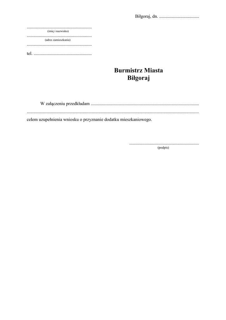 Biłgoraj, dn. ................................... ......................................................... (imię i nazwisko) ......................................................... (adres zamieszkania) ......................................................... tel. ................................................... Burmistrz Miasta Biłgoraj W załączeniu przedkładam ............................................................................................... ....................................................................................................................................................... celem uzupełnienia wniosku o przyznanie dodatku mieszkaniowego. ............................................................. (podpis)