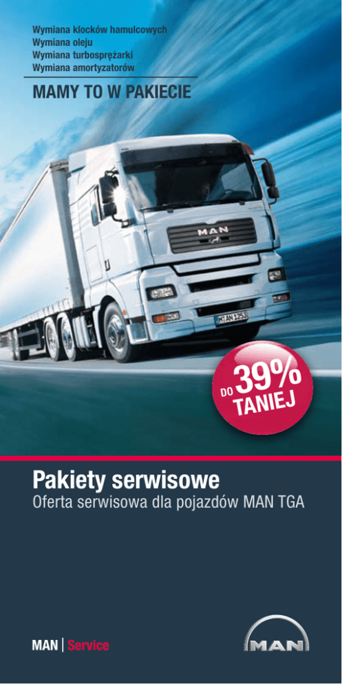 Wymiana klocków hamulcowych Wymiana oleju Wymiana turbosprężarki Wymiana amortyzatorów MAMY TO W PAKIECIE do Pakiety serwisowe 39nie%j ta Oferta serwisowa dla pojazdów MAN TGA PAKIETY SERWISOWE TGA (sugerowana cena netto) Nazwa pakietu Cena standard Cena pakiet Upust Wymiana klocków hamulcowych (oś przednia/wleczona) 828 zł 649 zł -20% Wymiana klocków hamulcowych + tarcz (oś przednia) 2.985 zł 2.399 zł -20% Wymiana klocków hamulcowych (oś napędowa) 876 zł 679 zł -21% Wymiana klocków hamulcowych + tarcz (oś napędowa) 4.597 zł 3.599 zł -20% Wymiana oleju + filtr oleju + filtr paliwa + kontrola 43 punktów pojazdu 1.210 zł 959 zł -20% 706 zł 489 zł Wymiana turbosprężarki 5.183 zł 4.199 zł -31% -19% Wymiana amortyzatorów (oś przednia) 1.841 zł 1.449 zł -20% Wymiana amortyzatorów (oś napędowa) 2.741 zł 2.149 zł -20% Wymiana amortyzatorów (oś wleczona) 3.374 zł 1.999 zł -39% Wymiana oleju w skrzyni biegów Oferta specjalna jest ważna z pieczęcią i obowiązuje tylko u poniższego partnera handlowego: Oferta ważna w Truck Center MTBP oraz u wybranych Partnerów Serwisowych do odwołania. Tekst i ilustracje nie są wiążące. Zastrzegamy sobie prawo do wprowadzania zmian spowodowanych postępem technicznym. Sugerowana cena detaliczna netto może ulec zmianie w przypadku znaczącej zmiany kursu EUR / PLN.