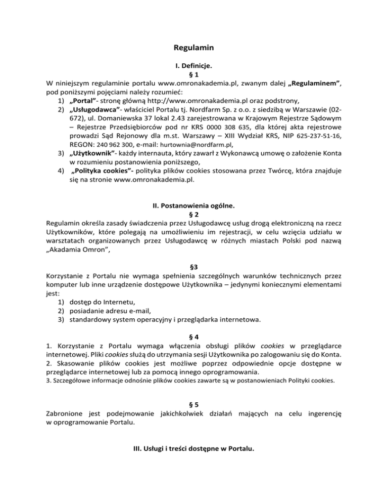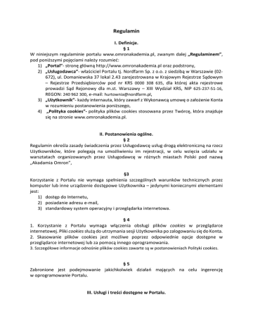 Regulamin I. Definicje. §1 W niniejszym regulaminie portalu www.omronakademia.pl, zwanym dalej „Regulaminem”, pod poniższymi pojęciami należy rozumieć: 1) „Portal”- stronę główną http://www.omronakademia.pl oraz podstrony, 2) „Usługodawca”- właściciel Portalu tj. Nordfarm Sp. z o.o. z siedzibą w Warszawie (02672), ul. Domaniewska 37 lokal 2.43 zarejestrowana w Krajowym Rejestrze Sądowym – Rejestrze Przedsiębiorców pod nr KRS 0000 308 635, dla której akta rejestrowe prowadzi Sąd Rejonowy dla m.st. Warszawy – XIII Wydział KRS, NIP 625-237-51-16, REGON: 240 962 300, e-mail: [email protected], 3) „Użytkownik”- każdy internauta, który zawarł z Wykonawcą umowę o założenie Konta w rozumieniu postanowienia poniższego, 4) „Polityka cookies”- polityka plików cookies stosowana przez Twórcę, która znajduje się na stronie www.omronakademia.pl. II. Postanowienia ogólne. §2 Regulamin określa zasady świadczenia przez Usługodawcę usług drogą elektroniczną na rzecz Użytkowników, które polegają na umożliwieniu im rejestracji, w celu wzięcia udziału w warsztatach organizowanych przez Usługodawcę w różnych miastach Polski pod nazwą „Akadamia Omron”, §3 Korzystanie z Portalu nie wymaga spełnienia szczególnych warunków technicznych przez komputer lub inne urządzenie dostępowe Użytkownika – jedynymi koniecznymi elementami jest: 1) dostęp do Internetu, 2) posiadanie adresu e-mail, 3) standardowy system operacyjny i przeglądarka internetowa. §4 1. Korzystanie z Portalu wymaga włączenia obsługi plików cookies w przeglądarce internetowej. Pliki cookies służą do utrzymania sesji Użytkownika po zalogowaniu się do Konta. 2. Skasowanie plików cookies jest możliwe poprzez odpowiednie opcje dostępne w przeglądarce internetowej lub za pomocą innego oprogramowania. 3. Szczegółowe informacje odnośnie plików cookies zawarte są w postanowieniach Polityki cookies. §5 Zabronione jest podejmowanie jakichkolwiek działań mających na celu ingerencję w oprogramowanie Portalu. III. Usługi i treści dostępne w Portalu. §6 1. Po oświadczeniu, że Użytkownik posiada tytuł magistra bądź technika farmacji, Użytkownik może korzystać z Portalu. 2. Użytkownik ma możliwość zarejestrowania się na warsztaty „Akademia Omron”. W celu rejestracji Użytkownik powinien: 1) wypełnić formularz kontaktowy, podając następujące dane: a. miejsce b. imię c. nazwisko d. adres e-mail e. dane apteki: a. nazwę apteki b. ulice c. numer budynku d. numer lokalu e. miejscowość f. kod pocztowy 2) wyrazić zgodę na przetwarzanie danych osobowych w zakresie wskazanym w Portalu, 3) kliknąć przycisk „Zarejestruj”. 3. Po kliknięciu przycisku „Zarejestruj” na podany adres e-mail zostanie wysłany mail potwierdzający zarejestrowanie uczestnika na wybrane szkolenie lub informujący o wyczerpaniu miejsc na szkoleniu. IV. Dane osobowe §7 1. Podanie danych osobowych w formularzu rejestracyjnym jest dobrowolne, jednak konieczne do skorzystania z usług oferowanych w Portalu. 2. Wszelkie dane osobowe, które Użytkownik wprowadzi do formularza rejestracyjnego, lub poda w korespondencji z Usługodawcą, są przetwarzane w sposób zgodny z wymogami określonymi w prawie polskim, a przede wszystkim ustawie z dnia 29 sierpnia 1997r. o ochronie danych osobowych (tekst jednolity: Dz. U. 2014 r. poz. 1182) oraz ustawie z dnia 18 lipca 2002 roku o świadczeniu usług drogą elektroniczną (tekst jednolity: Dz. U. 2013 r. poz. 1422). 3. Na podstawie dodatkowej i opcjonalnej zgody Administrator Danych Osobowychmoże przetwarzać dane osobowe Użytkowników w celach marketingowych oraz do wysyłania do niego na podane adresy e-mail lub numery telefonu informacji handlowych. §8 1. Administratorem danych osobowych jest Usługodawca oraz QAH Spółka z ograniczoną odpowiedzialnością Spółka komandytowa z siedzibą w Łodzi przy ul. Zawiszy Czarnego 10, 91 - 829 Łódź, zarejestrowana w rejestrze przedsiębiorców Krajowego Rejestru Sądowego przez Sąd Rejonowy dla Łodzi - Śródmieścia w Łodzi XX Wydział Gospodarczy Krajowego Rejestru Sądowego, pod nr KRS: 0000531 931, REGON: 360 155 815, NIP 726 – 265 -53 -61 2. Usługodawca może powierzyć przetwarzanie zebranych danych osobowych Użytkowników innemu podmiotowi na podstawie zawartej z nim, na zasadzie art. 31 ustawy z dnia 29 sierpnia 1997r. o ochronie danych osobowych, umowy. §9 1. Usługodawca przetwarza dane osobowe Użytkowników i wykorzystuje je w zakresie i w celu nie zbędnym do realizacji usług oferowanych za pośrednictwem Portalu. 2. Na podstawie dodatkowej i opcjonalnej zgody, którą Użytkownik może wyrazić w osobnym oświadczeniu, Usługodawca może przetwarzać dane osobowe Użytkowników w celach marketingowych oraz do wysyłania do niego na podane adresy e-mail lub numery telefonu informacji handlowych. Użytkownik może odwołać zgodę w tym zakresie w każdej chwili. § 10 Dane osobowe zebrane przez Usługodawcę mogą zostać przekazane upoważnionym, na podstawie obowiązujących przepisów prawa, organom państwowym. § 11 Usługodawca stosuje wymagane aktualnymi przepisami o ochronie danych osobowych środki techniczne zapobiegające pozyskiwaniu i modyfikowaniu przez osoby nieuprawnione danych osobowych przesyłanych drogą elektroniczną. § 12 Użytkownik nie ma możliwości korzystania z usług realizowanych za pośrednictwem Portalu anonimowo lub pod pseudonimem. V. Reklamacje. § 13 1. Wszelkie reklamacje należy składać do Usługodawcy za pośrednictwem formularza kontaktowego umieszczonego na stronie: www.omronakademia.pl, pocztą elektroniczną na adres mailowy [email protected], pocztą bezpośrednio na adres Usługodawcy podany w Regulaminie. 2. W reklamacji należy podać dane Użytkownika niezbędne do przesłania informacji o wyniku rozpatrzenia reklamacji oraz opis na czym polegały nieprawidłowości w usłudze świadc