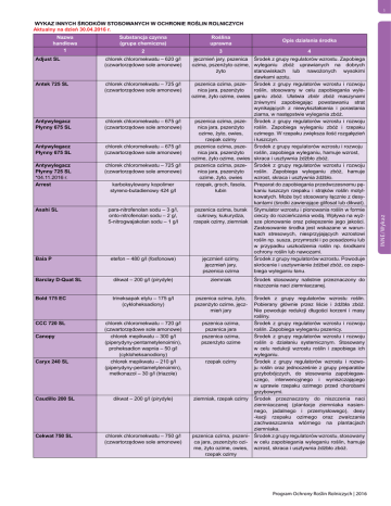 1 Nazwa handlowa 1 Substancja czynna (grupa chemiczna) Roślina uprawna Opis działania środka 2 3 4 Adjust SL chlorek chloromekwatu – 620 g/l (czwartorzędowe sole amonowe) Antek 725 SL chlorek chloromekwatu – 725 g/l (czwartorzędowe sole amonowe) Antywylegacz Płynny 675 SL chlorek chloromekwatu – 675 g/l (czwartorzędowe sole amonowe) Antywylegacz Płynny 675 SL chlorek chloromekwatu – 675 g/l (czwartorzędowe sole amonowe) Antywylegacz Płynny 725 SL *04.11.2016 r. Arrest chlorek chloromekwatu – 725 g/l (czwartorzędowe sole amonowe) Asahi SL Baia P karboksylowany kopolimer styreno-butadienowy 424 g/l para-nitrofenolan sodu – 3 g/l, onto-nitrofenolan sodu – 2 g/, 5-nitrogwajakolan sodu – 1 g/l etefon – 480 g/l (fosfonowe) jęczmień jary, pszenica Środek z grupy regulatorów wzrostu. Zapobiega ozima, pszenżyto ozime, wyleganiu zbóż uprawianych na dobrych żyto stanowiskach lub nawożonych wysokimi dawkami azotu. pszenica ozima, psze- Środek z grupy regulatorów wzrostu i rozwoju nica jara, pszenżyto roślin, stosowany w celu zapobiegania wyleozime, żyto ozime, owies ganiu zbóż. Ułatwia zbiór zbóż maszynami żniwnymi zapobiegając powstawaniu strat wynikających z niewykształcenia i porastania ziarna, w następstwie wylegania zbóż. pszenica ozima, psze- Środek z grupy regulatorów wzrostu i rozwoju nica jara, pszenżyto roślin. Zapobiega wyleganiu zbóż i rzepaku ozime, żyto, owies, ozimego. W rzepaku zwiększa ilość rozgałęzień rzepak ozimy i łuszczyn. pszenica ozima, psze- Środek z grupy regulatorów wzrostu i rozwoju nica jara, pszenżyto roślin, zapobiega wyleganiu, hamuje wzrost, ozime, żyto ozime, owies skraca i usztywnia źdźbło zbóż. pszenica ozima, psze- Środek z grupy regulatorów wzrostu i rozwoju nica jara, pszenżyto roślin. Zapobiega wyleganiu zbóż, hamuje ozime, żyto, owies wzrost, skraca i usztywnia źdźbło. rzepak, groch, fasola, Preparat do zapobiegania przedwczesnemu pęłubin kaniu łuszczyn rzepaku i strąków roślin motylkowatych. Może być stosowany łącznie z desykantami (środki zawierające glifosat lub dikwat). pszenica ozima, burak Stymulator wzrostu i plonowania roślin w formie cukrowy, kukurydza, cieczy do rozcieńczania wodą. Wpływa na wyżrzepak ozimy, ziemniak sze plonowanie oraz polepszenie jego jakości. Zastosowanie środka jest wskazane w warunkach stresowych, niesprzyjających wzrostowi roślin np. susza, przymrozki i po posadzeniu lub w przypadku uszkodzenia roślin np. środkami ochrony roślin lub nawozami. jęczmień ozimy, Środek z grupy regulatorów wzrostu. Powoduje jęczmień jary, skrócenie i usztywnienie źdźbeł zbóż, co zapopszenica ozima biega wyleganiu łanu. Barclay D-Quat SL dikwat – 200 g/l (pirydyle) ziemniak Bold 175 EC trineksapak etylu – 175 g/l (cykloheksadiony) pszenica ozima, żyto, pszenżyto ozime, jęczmień jary CCC 720 SL chlorek chloromekwatu – 720 g/l (czwartorzędowe sole amonowe) chlorek mepikwatu – 300 g/l (piperydyny-pentametylenoimin), proheksadion wapnia – 50 g/l (cykloheksanodiony) chlorek mepikwatu – 210 g/l (piperydyny-pentametylenoimin), metkonazol – 30 g/l (triazole) Canopy Caryx 240 SL Caudillo 200 SL dikwat – 200 g/l (pirydyle) Cekwat 750 SL chlorek chloromekwatu – 750 g/l (czwartorzędowe sole amonowe) Środek stosowany nalistnie przeznaczony do niszczenia naci ziemniaczanej. Środek z grupy regulatorów wzrostu roślin. Pobierany głównie przez liście i źdźbła zbóż. Nie powoduje redukcji długości korzeni i masy rośliny. pszenica ozima, Środek z grupy regulatorów wzrostu i rozwoju pszenica jara roślin. Zapobiega wyleganiu pszenicy. pszenica ozima, Środek z grupy regulatorów wzrostu i rozwoju pszenżyto ozime roślin o działaniu systemicznym. Stosowany w celu redukcji wzrostu roślin i zapobiega ich wyleganiu. rzepak ozimy Środek z grupy regulatorów wzrostu i rozwoju roślin oraz jednocześnie z grupy preparatów grzybobójczych, do stosowania zapobiegawczego, interwencyjnego i wyniszczającego w uprawie rzepaku ozimego przed chorobami grzybowymi. ziemniak, rzepak ozimy Środek przeznaczony do niszczenia naci ziemniaczanej (plantacje ziemniaka nasiennego, jadalnego i przemysłowego), desy -kacji rzepaku ozimego oraz zwalczania zachwaszczenia wtórnego na plantacjach ziemniaka. pszenica ozima, pszeni- Środek z grupy regulatorów wzrostu, stosowany ca jara, pszenżyto ozi- w celu zapobiegania wyleganiu roślin, hamuje me, żyto ozime, owies, wzrost, skraca i usztywnia źdźbło zbóż. rzepak ozimy Program Ochrony Roślin Rolniczych | 2016 INNE/Wykaz WYKAZ INNYCH ŚRODKÓW STOSOWANYCH W OCHRONIE ROŚLIN ROLNICZYCH Aktualny na dzień 30.04.2016 r. 2 2 3 Cerone 480 SL 1 etefon – 480 g/l (fosfonowe) jęczmień, żyto, pszenżyto, pszenica Certes 480 SL etefon – 480 g/l (fosfonowe) Chiffchaff 250 EC trineksapak etylu – 250 g/l (cykloheksadiony) Consul 250 EC trineksapak etylu – 250 g/l (cykloheksadiony) INNE/Wykaz Corleone 480 SL etefon – 480 g/l (związek z grupy fosfonowych) Cuadro 250 EC trineksapak etylu – 250 g/l (cykloheksadiony) Cycocel 750 SL chlorek chloromekwatu – 750 g/l (czwartorzędowe sole amoniowe) Dessicash 20 SL dikwat – 200 g/l (pirydyle) D-Foliate SL Diqua 200 SL dikwat – 200 g/l (pirydyle) dikwat – 200 g/l (pirydyle) Diquanet 200 SL dikwat – 200 g/l (pirydyle) D-Quatflash SL dikwat – 200 g/l (pirydyle) Dynamic Cresco 4 Środek z grupy regulatorów wzrostu. Zapobiega wyleganiu zbóż uprawianych na dobrych stanowiskach lub nawożonych wysokimi dawkami azotu. jęczmień, żyto, Środek z grupy regulatorów wzrostu. Zapobiega pszenżyto, pszenica wyleganiu zbóż uprawianych na dobrych stanowiskach lub nawożonych wysokimi dawkami azotu. pszenica ozima, jęcz- Środek z grupy regulatorów wzrostu roślin. mień ozimy, żyto, pszen- Zapobiega wyleganiu zbóż uprawianych żyto ozime, pszenica w technologiach intensywnych, z wysokim jara, jęczmień jary, owies pozi
