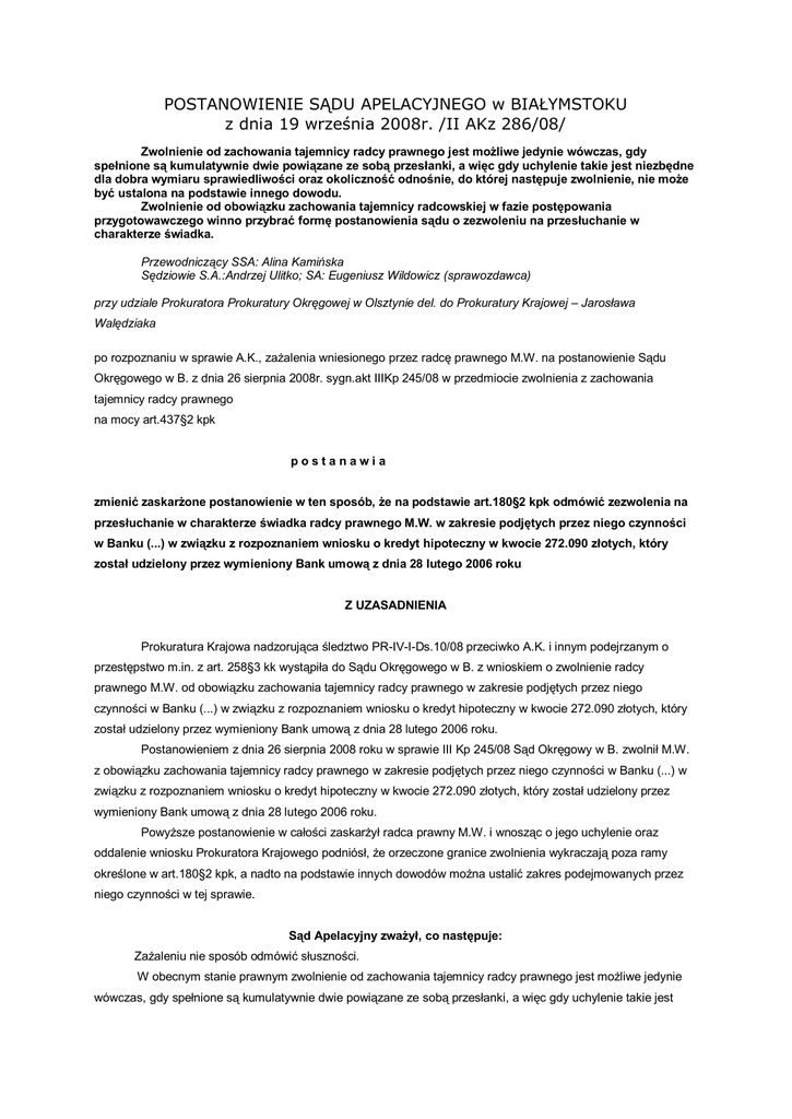 POSTANOWIENIE SĄDU APELACYJNEGO w BIAŁYMSTOKU z dnia 19 września 2008r. /II AKz 286/08/ Zwolnienie od zachowania tajemnicy radcy prawnego jest możliwe jedynie wówczas, gdy spełnione są kumulatywnie dwie powiązane ze sobą przesłanki, a więc gdy uchylenie takie jest niezbędne dla dobra wymiaru sprawiedliwości oraz okoliczność odnośnie, do której następuje zwolnienie, nie może być ustalona na podstawie innego dowodu. Zwolnienie od obowiązku zachowania tajemnicy radcowskiej w fazie postępowania przygotowawczego winno przybrać formę postanowienia sądu o zezwoleniu na przesłuchanie w charakterze świadka. Przewodniczący SSA: Alina Kamińska Sędziowie S.A.:Andrzej Ulitko; SA: Eugeniusz Wildowicz (sprawozdawca) przy udziale Prokuratora Prokuratury Okręgowej w Olsztynie del. do Prokuratury Krajowej – Jarosława Walędziaka po rozpoznaniu w sprawie A.K., zażalenia wniesionego przez radcę prawnego M.W. na postanowienie Sądu Okręgowego w B. z dnia 26 sierpnia 2008r. sygn.akt IIIKp 245/08 w przedmiocie zwolnienia z zachowania tajemnicy radcy prawnego na mocy art.437§2 kpk postanawia zmienić zaskarżone postanowienie w ten sposób, że na podstawie art.180§2 kpk odmówić zezwolenia na przesłuchanie w charakterze świadka radcy prawnego M.W. w zakresie podjętych przez niego czynności w Banku (...) w związku z rozpoznaniem wniosku o kredyt hipoteczny w kwocie 272.090 złotych, który został udzielony przez wymieniony Bank umową z dnia 28 lutego 2006 roku Z UZASADNIENIA Prokuratura Krajowa nadzorująca śledztwo PR-IV-I-Ds.10/08 przeciwko A.K. i innym podejrzanym o przestępstwo m.in. z art. 258§3 kk wystąpiła do Sądu Okręgowego w B. z wnioskiem o zwolnienie radcy prawnego M.W. od obowiązku zachowania tajemnicy radcy prawnego w zakresie podjętych przez niego czynności w Banku (...) w związku z rozpoznaniem wniosku o kredyt hipoteczny w kwocie 272.090 złotych, który został udzielony przez wymieniony Bank umową z dnia 28 lutego 2006 roku. Postanowieniem z dnia 26 sierpnia 2008 roku w sprawie III Kp 245/08 Sąd Okręgowy w B. zwolnił M.W. z obowiązku zachowania tajemnicy radcy prawnego w zakresie podjętych przez niego czynności w Banku (...) w związku z rozpoznaniem wniosku o kredyt hipoteczny w kwocie 272.090 złotych, który został udzielony przez wymieniony Bank umową z dnia 28 lutego 2006 roku. Powyższe postanowienie w całości zaskarżył radca prawny M.W. i wnosząc o jego uchylenie oraz oddalenie wniosku Prokuratora Krajowego podniósł, że orzeczone granice zwolnienia wykraczają poza ramy określone w art.180§2 kpk, a nadto na podstawie innych dowodów można ustalić zakres podejmowanych przez niego czynności w tej sprawie. Sąd Apelacyjny zważył, co następuje: Zażaleniu nie sposób odmówić słuszności. W obecnym stanie prawnym zwolnienie od zachowania tajemnicy radcy prawnego jest możliwe jedynie wówczas, gdy spełnione są kumulatywnie dwie powiązane ze sobą przesłanki, a więc gdy uchylenie takie jest niezbędne dla dobra wymiaru sprawiedliwości oraz okoliczność odnośnie, do której następuje zwolnienie, nie może być ustalona na podstawie innego dowodu. W niniejszej zaś sprawie o spełnieniu tych wymogów nie może być mowy. Przede wszystkim wskazać należy, że w toku przeprowadzonego śledztwa zabezpieczono całość dokumentacji związanej z umową z dnia 28 lutego 2006 r. i udzielonym kredytem hipotecznym. W aktach sprawy znajduje się ksero umowy kredytowej, aktu notarialnego sprzedaży nieruchomości, umowy przedwstępnej oraz szereg innych dokumentów stanowiących podstawę do udzielenia przedmiotowego kredytu. Nadto organ prokuratorski dysponuje zarządzeniem w sprawie kredytów, pożyczek, gwarancji i poręczenia, regulaminami mieszkaniowymi kredytów hipotecznych dla osób fizycznych, instrukcją służbową a także regulaminem organizacyjnym I, II Oddziału w B. oraz I Oddziału w B.P. Banku (...). Co więcej, na okoliczności zawartej umowy kredytowej w charakterze świadków przesłuchano pracowników Banku (...) władnych do sprzedaży kredytów hipotecznych. Nie ulega więc wątpliwości, że analiza powyższych, rzeczowych jak i osobowych źródeł dowodowych, daje możliwość poczynienia ustaleń w zakresie okoliczności, których dotyczył wniosek Prokuratora Krajowego o zwolnienie z obowiązku zachowania tajemnicy radcy prawnego. Istotą toczącego się postępowania przygotowawczego jest ustalenie zakresu odpowiedzialności karnej podejrzanych w niniejszej sprawie i wyłącznie w tym celu możliwe jest zwolnienie od zachowania tajemnicy radcy prawnego. Wszelkie inne okoliczności jako nie mające de facto znaczenia i wpływu na granice odpowiedzialności karnej osób, przeciwko którym toczy się śledztwo nie mogą uzasadniać zwolnienia od obowiązku zachowania tajemnicy zawodowej. W tej sytuacji, w świetle brzmienia art.180§2 kpk, brak jest podstaw do przesłuchania w charakterze świadka radcy prawnego M.W.. Nie zostały bowiem wykazane materialne podstawy do zwolnienia. W świetle wskazanej powyżej argumentacji, należało uznać orzeczenie Sądu I intencji za wadliwe i zmienić zaskarżone postanowienie, orzekając odmiennie co do istoty sprawy. Sąd Apelacyjny zwraca jednocześnie uwagę na nieprawidłowo sformułowaną sentencję orzeczenia Sądu Okręgowego. Zwolnienie od obowiązku zachowania tajemnicy radcowskiej w fazie postępowania przygotowawczego winno przybrać formę postanowienia sądu o zezwoleniu na przesłuchanie w charakterze świadka. Obowiązujące przepisy precyzują wprost treść tego postanowienia. Zatem skarżone orzeczenie podlegało zmianie w ten sposób, że na podstawie art.180§2 kpk odmówiono zezwolenia na przesłuchanie w charakterze świadka radcy prawnego M.W. w zakresie podjętych przez niego czynności w Banku (...) w związku z rozpoznaniem wniosku o kredyt hipoteczny w kwocie 272.090 złotych, który został udzielony przez wymieniony 