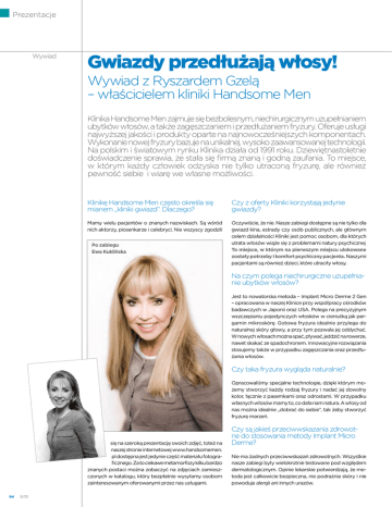 Prezentacje Wywiad Gwiazdy przedłużają włosy! Wywiad z Ryszardem Gzelą – właścicielem kliniki Handsome Men Klinika Handsome Men zajmuje się bezbolesnym, niechirurgicznym uzupełnianiem ubytków włosów, a także zagęszczaniem i przedłużaniem fryzury. Oferuje usługi najwyższej jakości i produkty oparte na najnowocześniejszych komponentach. Wykonanie nowej fryzury bazuje na unikalnej, wysoko zaawansowanej technologii. Na polskim i światowym rynku Klinika działa od 1991 roku. Dziewiętnastoletnie doświadczenie sprawia, że stała się firmą znaną i godną zaufania. To miejsce, w którym każdy człowiek odzyska nie tylko utraconą fryzurę, ale również pewność siebie i wiarę we własne możliwości. Klinikę Handsome Men często określa się mianem „kliniki gwiazd”. Dlaczego? Czy z oferty Kliniki korzystają jedynie gwiazdy? Mamy wielu pacjentów o znanych nazwiskach. Są wśród nich aktorzy, piosenkarze i celebryci. Nie wszyscy zgodzili Oczywiście, że nie. Nasze zabiegi dostępne są nie tylko dla gwiazd kina, estrady czy osób publicznych, ale głównym celem działalności Kliniki jest pomoc osobom, dla których utrata włosów wiąże się z problemami natury psychicznej. To miejsce, w którym na pierwszym miejscu ulokowane zostały potrzeby i komfort psychiczny pacjenta. Naszymi pacjentami są również dzieci, które utraciły włosy. Po zabiegu Ewa Kuklińska Na czym polega niechirurgiczne uzupełnianie ubytków włosów? Jest to nowatorska metoda – Implant Micro Derme 2 Gen – opracowana w naszej Klinice przy współpracy ośrodków badawczych w Japonii oraz USA. Polega na precyzyjnym wszczepianiu pojedynczych włosków w cieniutką jak pergamin mikroskórę. Gotowa fryzura idealnie przylega do naturalnej skóry głowy, a przy tym pozwala jej oddychać. W nowych włosach można spać, pływać, jeździć na rowerze, nawet skakać ze spadochronem. Innowacyjne rozwiązania stosujemy także w przypadku zagęszczania oraz przedłużania włosów. Czy taka fryzura wygląda naturalnie? Opracowaliśmy specjalne technologie, dzięki którym możemy stworzyć każdy rodzaj fryzury i nadać jej dowolny kolor, łącznie z pasemkami oraz odrostami. W przypadku własnych włosów mamy to, co dała nam natura. A włosy od nas można idealnie „dobrać do siebie”, tak żeby stworzyć fryzurę marzeń. się na szeroką prezentację swoich zdjęć, toteż na naszej stronie internetowej www.handsomemen. pl dostępna jest jedynie część materiału fotograficznego. Za to ciekawe metamorfozy kilku bardzo znanych postaci można zobaczyć na zdjęciach zamieszczonych w katalogu, który bezpłatnie wysyłamy osobom zainteresowanym oferowanymi przez nas usługami. 94 5/10 Czy są jakieś przeciwwskazania zdrowotne do stosowania metody Implant Micro Derme? Nie ma żadnych przeciwwskazań zdrowotnych. Wszystkie nasze zabiegi były wielokrotnie testowane pod względem dermatologicznym. Opinie lekarskie potwierdzają, że metoda jest całkowicie bezpieczna, nie podrażnia skóry i nie powoduje alergii ani innych urazów.