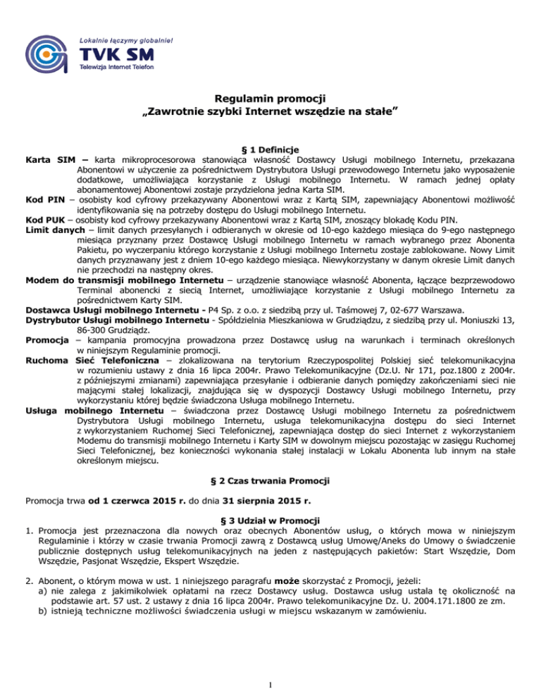 Regulamin promocji „Zawrotnie szybki Internet wszędzie na stałe” § 1 Definicje Karta SIM – karta mikroprocesorowa stanowiąca własność Dostawcy Usługi mobilnego Internetu, przekazana Abonentowi w użyczenie za pośrednictwem Dystrybutora Usługi przewodowego Internetu jako wyposażenie dodatkowe, umożliwiająca korzystanie z Usługi mobilnego Internetu. W ramach jednej opłaty abonamentowej Abonentowi zostaje przydzielona jedna Karta SIM. Kod PIN – osobisty kod cyfrowy przekazywany Abonentowi wraz z Kartą SIM, zapewniający Abonentowi możliwość identyfikowania się na potrzeby dostępu do Usługi mobilnego Internetu. Kod PUK – osobisty kod cyfrowy przekazywany Abonentowi wraz z Kartą SIM, znoszący blokadę Kodu PIN. Limit danych – limit danych przesyłanych i odbieranych w okresie od 10-ego każdego miesiąca do 9-ego następnego miesiąca przyznany przez Dostawcę Usługi mobilnego Internetu w ramach wybranego przez Abonenta Pakietu, po wyczerpaniu którego korzystanie z Usługi mobilnego Internetu zostaje zablokowane. Nowy Limit danych przyznawany jest z dniem 10-ego każdego miesiąca. Niewykorzystany w danym okresie Limit danych nie przechodzi na następny okres. Modem do transmisji mobilnego Internetu – urządzenie stanowiące własność Abonenta, łączące bezprzewodowo Terminal abonencki z siecią Internet, umożliwiające korzystanie z Usługi mobilnego Internetu za pośrednictwem Karty SIM. Dostawca Usługi mobilnego Internetu - P4 Sp. z o.o. z siedzibą przy ul. Taśmowej 7, 02-677 Warszawa. Dystrybutor Usługi mobilnego Internetu - Spółdzielnia Mieszkaniowa w Grudziądzu, z siedzibą przy ul. Moniuszki 13, 86-300 Grudziądz. Promocja – kampania promocyjna prowadzona przez Dostawcę usług na warunkach i terminach określonych w niniejszym Regulaminie promocji. Ruchoma Sieć Telefoniczna – zlokalizowana na terytorium Rzeczypospolitej Polskiej sieć telekomunikacyjna w rozumieniu ustawy z dnia 16 lipca 2004r. Prawo Telekomunikacyjne (Dz.U. Nr 171, poz.1800 z 2004r. z późniejszymi zmianami) zapewniająca przesyłanie i odbieranie danych pomiędzy zakończeniami sieci nie mającymi stałej lokalizacji, znajdująca się w dyspozycji Dostawcy Usługi mobilnego Internetu, przy wykorzystaniu której będzie świadczona Usługa mobilnego Internetu. Usługa mobilnego Internetu – świadczona przez Dostawcę Usługi mobilnego Internetu za pośrednictwem Dystrybutora Usługi mobilnego Internetu, usługa telekomunikacyjna dostępu do sieci Internet z wykorzystaniem Ruchomej Sieci Telefonicznej, zapewniająca dostęp do sieci Internet z wykorzystaniem Modemu do transmisji mobilnego Internetu i Karty SIM w dowolnym miejscu pozostając w zasięgu Ruchomej Sieci Telefonicznej, bez konieczności wykonania stałej instalacji w Lokalu Abonenta lub innym na stałe określonym miejscu. § 2 Czas trwania Promocji Promocja trwa od 1 czerwca 2015 r. do dnia 31 sierpnia 2015 r. § 3 Udział w Promocji 1. Promocja jest przeznaczona dla nowych oraz obecnych Abonentów usług, o których mowa w niniejszym Regulaminie i którzy w czasie trwania Promocji zawrą z Dostawcą usług Umowę/Aneks do Umowy o świadczenie publicznie dostępnych usług telekomunikacyjnych na jeden z następujących pakietów: Start Wszędzie, Dom Wszędzie, Pasjonat Wszędzie, Ekspert Wszędzie. 2. Abonent, o którym mowa w ust. 1 niniejszego paragrafu może skorzystać z Promocji, jeżeli: a) nie zalega z jakimikolwiek opłatami na rzecz Dostawcy usług. Dostawca usług ustala tę okoliczność na podstawie art. 57 ust. 2 ustawy z dnia 16 lipca 2004r. Prawo telekomunikacyjne Dz. U. 2004.171.1800 ze zm. b) istnieją techniczne możliwości świadczenia usługi w miejscu wskazanym w zamówieniu. 1 § 4 Korzyści dla Abonenta Korzyści w Promocji dla wszystkich jej Uczestników spełniających warunki określone w § 3 niniejszego Regulaminu: 1. Wysokość miesięcznej opłaty abonamentowej za korzystanie z usługi transmisji danych z dostępem do Internetu wynosić będzie odpowiednio: Nazwa pakietu Dostęp do Internetu Prędkość transmisji pobierania danych Prędkość transmisji wysyłania danych Pakiet danych w ramach opłaty abonamentowej START WSZĘDZIE przewodowy do 50 Mb/s do 1 Mb/s bez limitu mobilny do 1 Mb/s do 256 kb/s 3 GB DOM WSZĘDZIE przewodowy do 100 Mb/s do 1 Mb/s bez limitu mobilny do 1 Mb/s do 256 kb/s 3 GB PASJONAT WSZĘDZIE przewodowy do 150 Mb/s do 3 Mb/s bez limitu mobilny do 1 Mb/s do 256 kb/s 3 GB przewodowy do 200 Mb/s do 6 Mb/s bez limitu mobilny do 1 Mb/s do 256 kb/s 3 GB EKSPERT WSZĘDZIE Miesięczna opłata abonamentowa 59 zł 69 zł 79 zł 99 zł 2. Opłaty abonamentowe, o których mowa w ust. 1 niniejszego paragrafu obowiązują dla Abonentów posiadających własny Modem do transmisji mobilnego Internetu. W przypadku, jeżeli Abonent nie posiada własnego Modemu do transmisji mobilnego Internetu istnieje możliwość zakupu Modemu od Dostawcy usług poprzez uiszczenie w momencie podpisywania Umowy jednorazowej opłaty w wysokości 129 zł. Z chwilą wniesienia powyższej opłaty Modem przechodzi na własność Abonenta. W dniu podpisania Umowy Abonent otrzymuje Kartę SIM. Ponadto otrzymuje Modem do transmisji mobilnego Internetu w przypadku, gdy Modem został zakupiony od Dostawcy usług. W odniesieniu do nowych Abonentów, opłata abonamentowa za korzystanie z usługi transmisji danych z dostępem do Internetu w miesiącu zawarcia Umowy, o której mowa w §3 ust.1 niniejszego Regulaminu wynosi 1 zł niezależnie od długości jego trwania. 3. Rabat, po zastosowaniu, którego jednorazowa opłata za przyznanie Abonamentu i aktywację Modemu wynosić będzie 49,90 zł. Od Uczestnika korzystającego z usługi transmisji danych z dostępem do Internetu w momencie podpisywania Umowy, o której mowa w § 3 ust.1 niniejszego Regulaminu, nie będzie pobierana jednorazowa opłata za przyznanie Abonamentu i aktywację Modemu. 4. Obniżenie w momencie podpisywania Umow