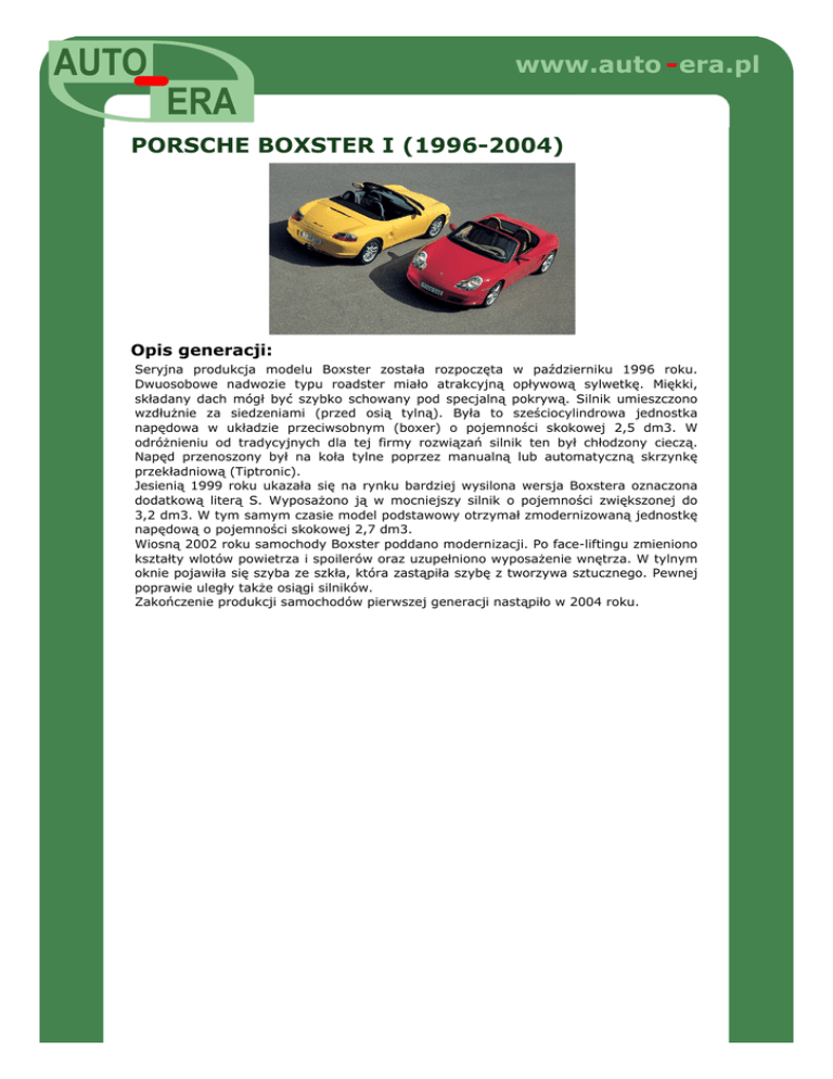 www.auto - era.pl PORSCHE BOXSTER I (1996-2004) Opis generacji: Seryjna produkcja modelu Boxster została rozpoczęta w październiku 1996 roku. Dwuosobowe nadwozie typu roadster miało atrakcyjną opływową sylwetkę. Miękki, składany dach mógł być szybko schowany pod specjalną pokrywą. Silnik umieszczono wzdłużnie za siedzeniami (przed osią tylną). Była to sześciocylindrowa jednostka napędowa w układzie przeciwsobnym (boxer) o pojemności skokowej 2,5 dm3. W odróżnieniu od tradycyjnych dla tej firmy rozwiązań silnik ten był chłodzony cieczą. Napęd przenoszony był na koła tylne poprzez manualną lub automatyczną skrzynkę przekładniową (Tiptronic). Jesienią 1999 roku ukazała się na rynku bardziej wysilona wersja Boxstera oznaczona dodatkową literą S. Wyposażono ją w mocniejszy silnik o pojemności zwiększonej do 3,2 dm3. W tym samym czasie model podstawowy otrzymał zmodernizowaną jednostkę napędową o pojemności skokowej 2,7 dm3. Wiosną 2002 roku samochody Boxster poddano modernizacji. Po face-liftingu zmieniono kształty wlotów powietrza i spoilerów oraz uzupełniono wyposażenie wnętrza. W tylnym oknie pojawiła się szyba ze szkła, która zastąpiła szybę z tworzywa sztucznego. Pewnej poprawie uległy także osiągi silników. Zakończenie produkcji samochodów pierwszej generacji nastąpiło w 2004 roku.