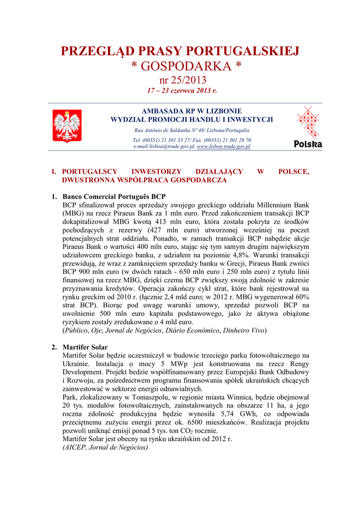 PRZEGLĄD PRASY PORTUGALSKIEJ * GOSPODARKA * nr 25/2013 17 – 23 czerwca 2013 r. AMBASADA RP W LIZBONIE WYDZIAŁ PROMOCJI HANDLU I INWESTYCJI Rua António de Saldanha Nº 48/ Lizbona/Portugalia Tel. (00351) 21 301 33 27/ Fax. (00351) 21 301 28 70 e-mail:[email protected], www.lisbon.trade.gov.pl I. PORTUGALSCY INWESTORZY DZIAŁAJĄCY DWUSTRONNA WSPÓŁPRACA GOSPODARCZA W POLSCE, 1. Banco Comercial Português BCP BCP sfinalizował proces sprzedaży swojego greckiego oddziału Millennium Bank (MBG) na rzecz Piraeus Bank za 1 mln euro. Przed zakończeniem transakcji BCP dokapitalizował MBG kwotą 413 mln euro, która została pokryta ze środków pochodzących z rezerwy (427 mln euro) utworzonej wcześniej na poczet potencjalnych strat oddziału. Ponadto, w ramach transakcji BCP nabędzie akcje Piraeus Bank o wartości 400 mln euro, stając się tym samym drugim największym udziałowcem greckiego banku, z udziałem na poziomie 4,8%. Warunki transakcji przewidują, że wraz z zamknięciem sprzedaży banku w Grecji, Piraeus Bank zwróci BCP 900 mln euro (w dwóch ratach - 650 mln euro i 250 mln euro) z tytułu linii finansowej na rzecz MBG, dzięki czemu BCP zwiększy swoją zdolność w zakresie przyznawania kredytów. Operacja zakończy cykl strat, które bank rejestrował na rynku greckim od 2010 r. (łącznie 2,4 mld euro; w 2012 r. MBG wygenerował 60% strat BCP). Biorąc pod uwagę warunki umowy, sprzedaż pozwoli BCP na uwolnienie 500 mln euro kapitału podstawowego, jako że aktywa obiążone ryzykiem zostały zredukowane o 4 mld euro. (Público, Oje, Jornal de Negócios, Diário Económico, Dinheiro Vivo) 2. Martifer Solar Martifer Solar będzie uczestniczył w budowie trzeciego parku fotowoltaicznego na Ukrainie. Instalacja o mocy 5 MWp jest konstruowana na rzecz Rengy Development. Projekt bedzie współfinansowany przez Europejski Bank Odbudowy i Rozwoju, za pośrednictwem programu finansowania spółek ukraińskich chcących zainwestować w sektorze energii odnawialnych. Park, zlokalizowany w Tomaszpolu, w regionie miasta Winnica, będzie obejmował 20 tys. modułów fotowoltaicznych, zainstalowanych na obszarze 11 ha, a jego roczna zdolność produkcyjna będzie wynosiła 5,74 GWh, co odpowiada przeciętnemu zużyciu energii przez ok. 6500 mieszkańców. Realizacja projektu pozwoli uniknąć emisji ponad 5 tys. ton CO2 rocznie. Martifer Solar jest obecny na rynku ukraińskim od 2012 r. (AICEP, Jornal de Negócios) PRZEGLĄD PRASY PORTUGALSKIEJ “GOSPODARKA” - nr 25/2013 3. Mota-Engil Mota-Engil potwierdził zawarcie pierwszych umów na wykonawstwo robót w Brazylii i Kolumbii. Najważniejsza z nich, o wartości 60 mln euro, dotyczy budowy infrastruktury lekkiego metra (VLT) w Cuiabá, stolicy brazylijskiego stanu Mato Grosso, która będzie jednym z miast-gospodarzy Mistrzostw Świata w Piłce Nożnej 2014. W Kolumbii potwierdzono umowę na realizację pierwszej fazę budowy wojskowego centrum rehabilitacyjnego o wartości 13 mln euro. Mota-Engil ubiega się tam również o 2 projekty w sektorze portowym, każdy o wartości 50-100 mln dolarów (37,5 – 75 mln euro). Mota-Engil wzmocniła również swoją obecność w Meksyku, gdzie zagwarantowała właśnie pierwszy kontrakt w sektorze gospodarki odpadami. Grupa, za pośrednictwem swojej spółki zależnej SUMA, i w konsorcjum z Moza Banco, będzie również zarządzać odpadami stałymi w Maputo. W kompetencji Mota-Engil znajdzie się obszar, który produkuje najwięcej odpadów stałych w stolicy Mozambiku. Portugalska spółka analizuje obecnie możliwości wejścia na rynki Azerbejdżanu, Kazachstanu, Chile, Urugwaju oraz Ugandy i Kenii. (Diário Económico, Oje, Vida Económica) 4. Colep Colep, firma zajmująca się produkcją opakowań do farb i produktów przemysłowych, napełnianiem produktów kosmetycznych oraz produkcją wyrobów higieny osobistej oraz kosmetyków na rzecz koncernów międzynarodowych (tzw. contract manufacturing), rozważa wejście na rynek Ameryki Centralnej, zakładając inwestycje sięgające nawet 20 mln euro. Firma, należąca do grupy RAR, jest obecna w sześciu krajach i posiada 11 fabryk. Inwestycja w Ameryce Centr. miałaby być uzupełnieniem działalności, jaką grupa prowadzi od 3 lat w Brazylii. Jeśli chodzi o działalność Colep w Europie, priorytetem firmy jest konsolidacja działalności w obliczu trudnej sytuacji gospodarczej. O ile jednostki produkcyjne w Polsce rozwijają się w pełni, w Hiszpanii odnotowano spadek aktywności spowodowany załamaniem w sektorze budowlanym i nieruchomości. W 2012 r. przychody Colep wyniosły 543 mln euro (wzrost o 6%), co reprezentuje ponad połowę przychodów grupy RAR. Zyski wzrosły o 31% do poziomu 6 mln euro, a zadłużenie osiągnęło wartość 103 mln euro. Szacuje się, że przychody ze sprzedaży w br. przekroczą 560 mln euro. Do klientów Colep należą m.in. Gilette, Beiersdorf, Johnson i Colgate-Palmolive. (Diário Económico) 5. Banco Espírito Santo BES Według doniesień włoskiej prasy, Banco Espírito Santo (BES) złożył ofertę kupna szwajcarskiej instytucji finansowej BSI (Banca della Svizzera Italiana), specjalizującej się w zarządzaniu aktywami, która należy do Assicurazioni Generali, trzeciego największego ubezpieczyciela we Włoszech. Kontroferentem portugalskiego banku jest hiszpański Bankinter, w konsorcjum z funduszem inwestycyjnym Apollo Global Investment. Wartość oferty nie jest znana, aczkolwiek prasa włoska informuje, że złożone oferty są niższe niż wyznaczona cena referencyjna (i wartość księgowa banku) tzn. 1,8-2,0 mld euro. Transakcja sprzedaży ma być zamknięta już na przełomie czerwca i lipca br. Wśród pozostałych zainteresowanych wymienia się brazylijską Safrę i chińskiego giganta WPHI AMBASADY RP W LIZBONIE Strona 2 PRZEGLĄD PRASY PORTUGALSKIEJ “GOSPODARKA” - nr 25/2013 ICBC. Poza obecnością w Szwajcarii, BSI działa także w Azji, Ameryce Łac., Środkowym Wsc