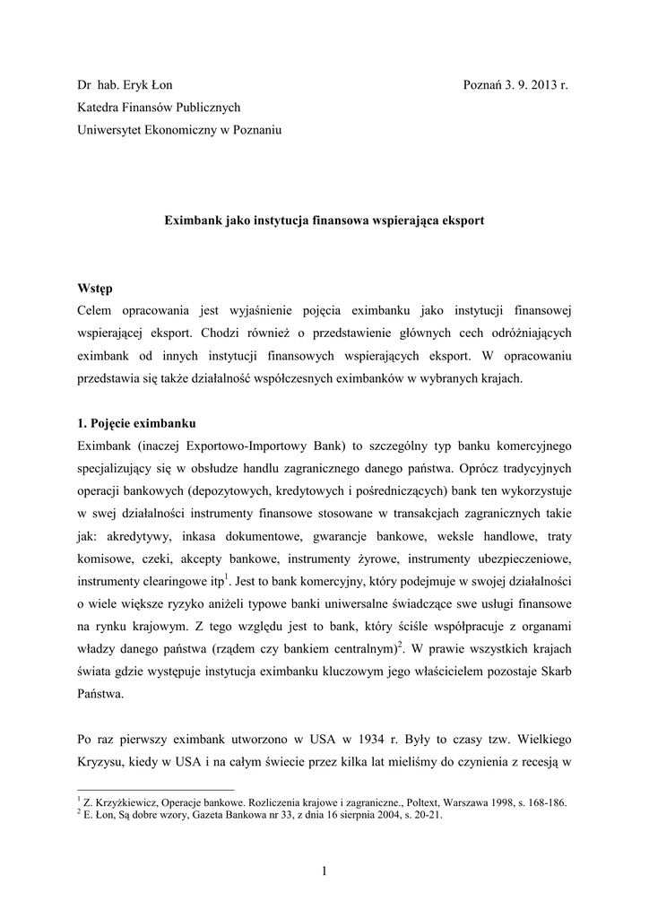 Dr hab. Eryk Łon Poznań 3. 9. 2013 r. Katedra Finansów Publicznych Uniwersytet Ekonomiczny w Poznaniu Eximbank jako instytucja finansowa wspierająca eksport Wstęp Celem opracowania jest wyjaśnienie pojęcia eximbanku jako instytucji finansowej wspierającej eksport. Chodzi również o przedstawienie głównych cech odróżniających eximbank od innych instytucji finansowych wspierających eksport. W opracowaniu przedstawia się także działalność współczesnych eximbanków w wybranych krajach. 1. Pojęcie eximbanku Eximbank (inaczej Exportowo-Importowy Bank) to szczególny typ banku komercyjnego specjalizujący się w obsłudze handlu zagranicznego danego państwa. Oprócz tradycyjnych operacji bankowych (depozytowych, kredytowych i pośredniczących) bank ten wykorzystuje w swej działalności instrumenty finansowe stosowane w transakcjach zagranicznych takie jak: akredytywy, inkasa dokumentowe, gwarancje bankowe, weksle handlowe, traty komisowe, czeki, akcepty bankowe, instrumenty żyrowe, instrumenty ubezpieczeniowe, instrumenty clearingowe itp1. Jest to bank komercyjny, który podejmuje w swojej działalności o wiele większe ryzyko aniżeli typowe banki uniwersalne świadczące swe usługi finansowe na rynku krajowym. Z tego względu jest to bank, który ściśle współpracuje z organami władzy danego państwa (rządem czy bankiem centralnym)2. W prawie wszystkich krajach świata gdzie występuje instytucja eximbanku kluczowym jego właścicielem pozostaje Skarb Państwa. Po raz pierwszy eximbank utworzono w USA w 1934 r. Były to czasy tzw. Wielkiego Kryzysu, kiedy w USA i na całym świecie przez kilka lat mieliśmy do czynienia z recesją w 1 2 Z. Krzyżkiewicz, Operacje bankowe. Rozliczenia krajowe i zagraniczne., Poltext, Warszawa 1998, s. 168-186. E. Łon, Są dobre wzory, Gazeta Bankowa nr 33, z dnia 16 sierpnia 2004, s. 20-21. 1 gospodarce, szybkim wzrostem bezrobocia i bankructwem wielu firm zwłaszcza w sektorze przemysłowym. Wówczas to rząd amerykański zdecydował się na utworzenie specjalnej instytucji finansowej przeciwdziałającej dalszemu upadkowi firm produkcyjnych zorientowanych na eksport. Od tego momentu datuje się początek instytucji eximbanku i dalszego jej rozwoju. We współczesnej literaturze bankowej eximbank traktowany jest jako jedna z wielu instytucji finansowych wspierających eksport3. Przed powstaniem pierwszych eximbanków na świecie ich funkcje pełniły zwykłe banki komercyjne, które udzielały kredytów eksportowych. Kredyt eksportowy zaś może mieć wiele znaczeń. Po pierwsze może być on rozumiany jako kredyt ciągniony przez eksportera na importera (tzw. kredyt dostawcy). Jest on udzielany na okres krótkoterminowy. Po drugie może to być kredyt przeznaczony na finansowanie projektów inwestycyjnych lub finansujący eksport dóbr kapitałowych. W tym drugim przypadku kredyt eksportowy odnosi się zarówno do kredytowania przedsięwzięć gospodarczych przed wysyłką (i w trakcie wysyłki) towarów oraz przed realizacją projektu inwestycyjnego, jak i do kredytowania przedsięwzięć gospodarczych po wysyłce i akceptacji dostaw oraz po zrealizowaniu projektu inwestycyjnego. W ostatnich latach kredyt eksportowy odnosi się też do kredytów krótkoterminowych (zabezpieczonych wekslami handlowymi). Dotyczy to zwłaszcza eksporterów z krajów, w których nie ma wyspecjalizowanych instytucji bankowych wspierających eksport (m. in. dotyczy to Polski). Zanim powstały pierwsze eximbanki instytucjami wspierającymi eksport obok zwykłych banków komercyjnych były Agencje Kredytów Eksportowych (Export Credit Agencies) zwane dalej agencjami eksportowymi. Instytucje tego typu powstały już w I połowie XX wieku4. Przykładowo w 1919 r. powstała pierwsza agencja eksportowa na świecie utworzona przez rząd brytyjski. W następnych dziesięcioleciach XX wieku tworzono agencje eksportowe w kolejnych krajach (tabela 1). Tabela 1: Grupa krajów oraz dekady lat, w których utworzono agencje eksportowe. Grupa krajów Dekady lat, w których utworzono agencje eksportowe lata 10-te XX wieku Wlk. Brytania, Niemcy 3 Concept paper on the creation of a region export credit and finance scheme, International Financial Consulting, 2004, s. 3. 4 Tamże, s. 4. 2 Holandia, Norwegia USA, Meksyk, Szwecja, Szwajcaria Austria, Kanada, Francja Włochy Japonia, Finlandia, Belgia, Indie, Izrael, RPA Hongkong Australia, Dania, Korea Południowa, Tajwan, Portugalia, Hiszpania, Sri Lanka Egipt, Jamajka, Turcja, Chiny, Indonezja Nigeria, Kolumbia, Rumunia, Tajlandia, Filipiny, Malezja, Węgry, Słowenia, Słowacja, Nowa Zelandia, Pakistan, Wietnam lata 20-te XX wieku lata 30-te XX wieku lata 40-te XX wieku lata 50-te XX wieku lata 60-te XX wieku lata 70-te X wieku lata 80-te XX wieku lata 90-te XX wieku I dekada XXI wieku Źródło: opracowanie własne na podstawie stron internetowych wybranych agencji eksportowych Istotną cechą agencji eksportowych jest zapewnianie ochrony eksporterom, bankom oraz inwestorom przed ryzykami polityczni i gospodarczymi powodującymi wystąpienie strat finansowych w krótkim, średnim i długim okresie5. Do ryzyk politycznych zalicza się: brak zapłaty za dostawy towarów w wyniku nieotrzymania gwarancji rządowych przez importerów. Może być to spowodowane m. in. nieuzyskaniem licencji przez importera, wprowadzeniem przez rząd kraju importera reglamentacji dewizowej, konfiskatą transferu zysków i dywidendy, wywłaszczeniem czy działaniami wojennymi. Do ryzyk gospodarczych zalicza się zaś: brak zapłaty za dostawę towarów po stronie nabywcy prywatnego, banku komercyjnego bądź nabywcy publicznego w wyniku zawinionej zwłoki, niewypłacalności, bankructwa oraz odrzucenia dostawy towarów przez importera. Wsparcie działalności eksporterów poprzez agencję eksportową dokonuje się głównie poprzez ubezpieczenia i gwarancje. Ubezpieczenia obejmują z reguły mniej niż 100% ryzyka kwoty transakcji, zaś g