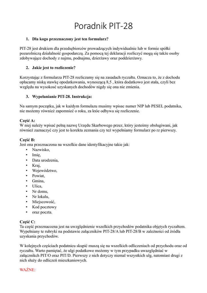 Poradnik PIT-28 1. Dla kogo przeznaczony jest ten formularz? PIT-28 jest drukiem dla przedsębiorców prowadzących indywidualnie lub w formie spółki pozarolniczą działalność gospodarczą. Za pomocą tej deklaracji rozliczyć mogą się także osoby zdobywające dochody z najmu, podnajmu, dzierżawy oraz poddzierżawy. 2. Jakie jest to rozliczenie? Korzystając z formularza PIT-28 rozliczamy się na zasadach ryczałtu. Oznacza to, że z dochodu opłacamy niską stawkę opodatkowania, wynoszącą 8,5 , która dodatkowo jest stała, czyli bez względu na wysokosć uzyskanych dochodów nigdy się ona nie zmienia. 3. Wypełanianie PIT-28. Instrukcja: Na samym początku, jak w każdym formulazu musimy wpisac numer NIP lub PESEL podatnika, nie możemy również zapomnieć o roku, za któe odbywa się rozliczenie. Część A: W niej należy wpisać pełną nazwę Urzędu Skarbowego przez, który jesteśmy obsługiwani, jak również zaznaczyć czy jest to korekta zeznania czy też wypełniamy formularz po rz pierwszy. Część B: Jest ona przeznaczona na wszelkie dane identyfikacyjne takie jak: • Nazwisko, • Imię, • Data urodzenia, • Kraj, • Województwo, • Powiat, • Gmina, • Ulica, • Nr domu, • Nr lokalu, • Miejscowość, • Kod pocztowy • oraz poczta. Część C: Ta część przeznacozna jest na uwzględnienie wszelkich przychodów podatnika objętych ryczałtem. Wypełniany te rubryki na podstawie załączników PIT-28/A lub PIT-28/B w zależności od źródła uzyskania przychodów. W kolejnych częściach podatnicu skupić muszą się na wszelkich odliczeniach od przychodu oraz od ryczałtu. Warto pamiętać, że ulgi podatkowe możemy w tym przypadku uwazględniać w załącznikch PIT/O oraz PIT/D. Pierwszy z nich dotyczy niemal wszystkich ulg, natomiast drugi z nich służy do odliczeń mieszkaniowych. WAŻNE: Każdy podatnik rozliczający się za pomocą PIT-28 musi pamiętać, że w tym przypadku nie obowiązuje ulga prorodzinna, więc nie mamy prawa do odliczania ulgi na dziecko od wysokości podatku, pomimo, że odliczeń dokonujemy w załacnziku PIT/O, w którym na ogół możemy z niej skorzystać. 4. Termin skłądania zeznania Ważne jest, aby zapamiętać ten temrin, ponieważ różni się on od wszystkich innych formularzy, gdyż nie możemy składać deklaracji do 30 kwietnia, a do 31 stycznia 2014 roku. 5. Co zrobić, aby skorzystać z ryczałtu? Każdy podatnik, który chce skorzystać z ryczałtu ewidencjonowanego i korzystać z formularza PIT28 musi wcześniej złożyć deklarację, w której wyrazi chęć rozliczania się za pomocą tej formy opodatkowania. Ważne jest także, aby dokonać tego z ponad rocznym wyprzedzeniem, niż będzie składane faktyczne zeznanie podatkowe. Deklaracja do Urzędu Skarbowego trafić więc musi do 20 stycznia 2013 roku, jeśli za ten rok chcemy dokonać rozliczenia w styczniu 2014 roku. 6. Dlaczego nie możemy skorzystać z ulgi prorodzinej. Ulga ta przezaczona jest dla wszystkich podatników rozliczających się na ogólnych zasadach podatkowych. Oznacza to więc, że ani podatnicy korzystający z ryczałtu, ni podatku liniowego, ani żadni inni nie mogą wykorzystać ulgi prorodzinnej, jako jednego z rozliczeń. 7. Program do PIT-28 Wypełnianie i składanie deklaracji podatkowej za pomocą programu lub przez Internet jest dużo łatwiejszą przyjemniejszą formą na wypełnianie obowiązku podatkowego. Dzęki niemu nie musisz wychodzić nawet z domu, wystko załatwiasz siedząc na wygodnym fotemu przed komuterem. Ominą Cię dzięki temu długie kolejki w Urzędzie Skarbowym i wiele innych trudności. Program dodatkowo pomaga w wypełnieniu deklaracji. Krok po kroku zostaniesz poinstruowany, dzięki czemu dokładnie będziesz wiedział co wpisać w danej rubryce. Program dokona za Ciebie wszelie obliczenia, a na sm koniec sprawdzi poprawność wypełninoego formularza, przez co na pewno nie będzie potrzeby wypełniania korekty. Tak wypełniony PIT-28 można w szybki i bezpieczny sposób wysłać prosto do Urzędu Skarbowego. Dotrze on na pewno w ciągu kilku chwil, a dodatkowo wszystkie Twoje dane zostaną zakodowane, gdyby niepowołana osoba zdobyła dostęp do deklaracji. PIT-28 na podatki-24.pl Pobierz program PIT-28 Formularz PIT-28 w pdf PIT-28 na podatki-24.pl