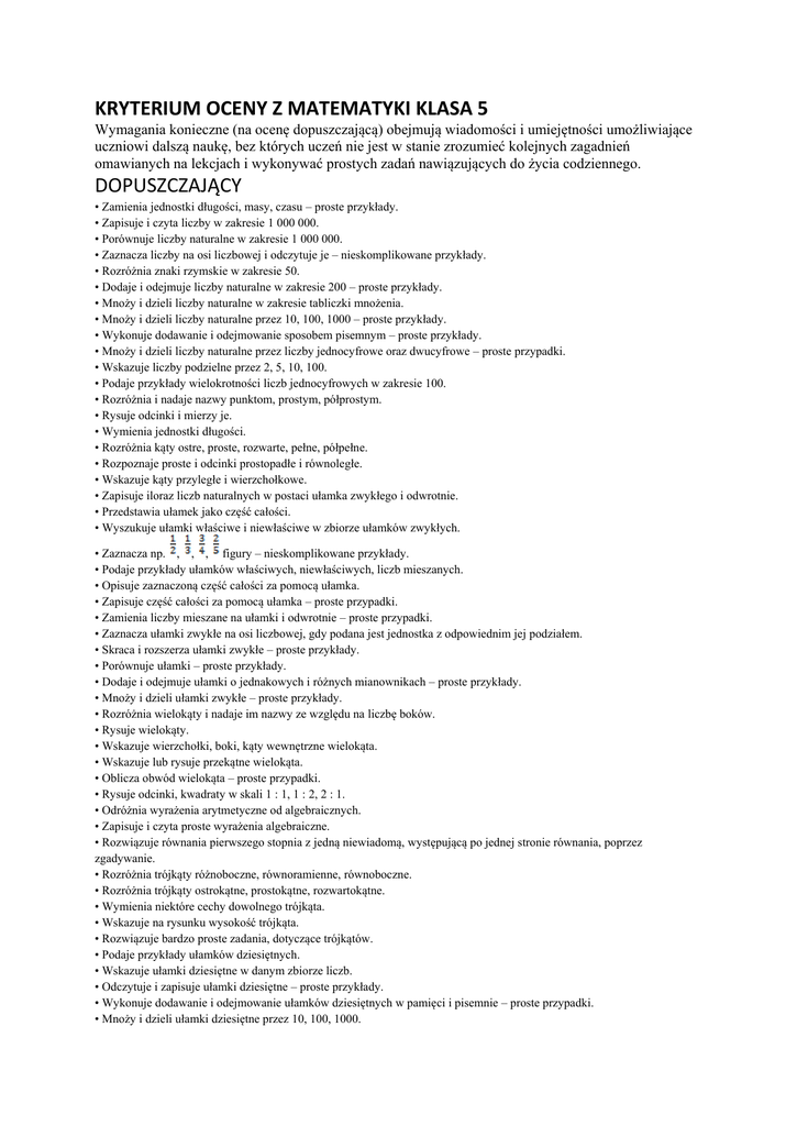 KRYTERIUM OCENY Z MATEMATYKI KLASA 5 DOPUSZCZAJĄCY