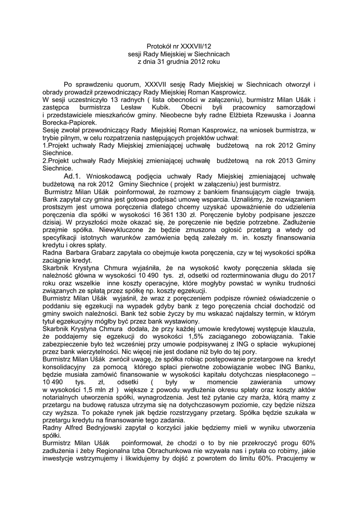 Protokół nr XXXVII/12 sesji Rady Miejskiej w Siechnicach z dnia 31 grudnia 2012 roku Po sprawdzeniu quorum, XXXVII sesję Rady Miejskiej w Siechnicach otworzył i obrady prowadził przewodniczący Rady Miejskiej Roman Kasprowicz. W sesji uczestniczyło 13 radnych ( lista obecności w załączeniu), burmistrz Milan Ušák i zastępca burmistrza Lesław Kubik. Obecni byli pracownicy samorządowi i przedstawiciele mieszkańców gminy. Nieobecne były radne ElŜbieta Rzewuska i Joanna Borecka-Papiorek. Sesję zwołał przewodniczący Rady Miejskiej Roman Kasprowicz, na wniosek burmistrza, w trybie pilnym, w celu rozpatrzenia następujących projektów uchwał: 1.Projekt uchwały Rady Miejskiej zmieniającej uchwałę budŜetową na rok 2012 Gminy Siechnice. 2.Projekt uchwały Rady Miejskiej zmieniającej uchwałę budŜetową na rok 2013 Gminy Siechnice. Ad.1. Wnioskodawcą podjęcia uchwały Rady Miejskiej zmieniającej uchwałę budŜetową na rok 2012 Gminy Siechnice ( projekt w załączeniu) jest burmistrz. Burmistrz Milan Ušák poinformował, Ŝe rozmowy z bankiem finansującym ciągle trwają. Bank zapytał czy gmina jest gotowa podpisać umowę wsparcia. Uznaliśmy, Ŝe rozwiązaniem prostszym jest umowa poręczenia dlatego chcemy uzyskać upowaŜnienie do udzielenia poręczenia dla spółki w wysokości 16 361 130 zł. Poręczenie byłoby podpisane jeszcze dzisiaj. W przyszłości moŜe okazać się, Ŝe poręczenie nie będzie potrzebne. ZadłuŜenie przejmie spółka. Niewykluczone Ŝe będzie zmuszona ogłosić przetarg a wtedy od specyfikacji istotnych warunków zamówienia będą zaleŜały m. in. koszty finansowania kredytu i okres spłaty. Radna Barbara Grabarz zapytała co obejmuje kwota poręczenia, czy w tej wysokości spółka zaciągnie kredyt. Skarbnik Krystyna Chmura wyjaśniła, Ŝe na wysokość kwoty poręczenia składa się naleŜność główna w wysokości 10 490 tys. zł, odsetki od rozterminowania długu do 2017 roku oraz wszelkie inne koszty operacyjne, które mogłyby powstać w wyniku trudności związanych ze spłatą przez spółkę np. koszty egzekucji. Burmistrz Milan Ušák wyjaśnił, Ŝe wraz z poręczeniem podpisze równieŜ oświadczenie o poddaniu się egzekucji na wypadek gdyby bank z tego poręczenia chciał dochodzić od gminy swoich naleŜności. Bank teŜ sobie Ŝyczy by mu wskazać najdalszy termin, w którym tytuł egzekucyjny mógłby być przez bank wystawiony. Skarbnik Krystyna Chmura dodała, Ŝe przy kaŜdej umowie kredytowej występuje klauzula, Ŝe poddajemy się egzekucji do wysokości 1,5% zaciąganego zobowiązania. Takie zabezpieczenie było teŜ wcześniej przy umowie podpisywanej z ING o spłacie wykupionej przez bank wierzytelności. Nic więcej nie jest dodane niŜ było do tej pory. Burmistrz Milan Ušák zwrócił uwagę, Ŝe spółka robiąc postępowanie przetargowe na kredyt konsolidacyjny za pomocą którego spłaci pierwotne zobowiązanie wobec ING Banku, będzie musiała zamówić finansowanie w wysokości kapitału dotychczas niespłaconego – 10 490 tys. zł, odsetki ( były w momencie zawierania umowy w wysokości 1,5 mln zł ) większe z powodu wydłuŜenia okresu spłaty oraz koszty aktów notarialnych utworzenia spółki, wynagrodzenia. Jest teŜ pytanie czy marŜa, którą mamy z przetargu na budowę ratusza utrzyma się na dotychczasowym poziomie, czy będzie niŜsza czy wyŜsza. To pokaŜe rynek jak będzie rozstrzygany przetarg. Spółka będzie szukała w przetargu kredytu na finansowanie tego zadania. Radny Alfred Bedryjowski zapytał o korzyści jakie będziemy mieli w wyniku utworzenia spółki. Burmistrz Milan Ušák poinformował, Ŝe chodzi o to by nie przekroczyć progu 60% zadłuŜenia i Ŝeby Regionalna Izba Obrachunkowa nie wzywała nas i pytała co robimy, jakie inwestycje wstrzymujemy i likwidujemy by dojść z powrotem do limitu 60%. Pracujemy w pośpiechu i dopiero czas pokaŜe czy ustrzegliśmy się błędów, które łatwo popełnić w tych warunkach. Robimy kolejne podejścia po to by zrobić to jak najbezpieczniej i zgodnie z prawem. Warto to robić bo spółka nie tylko zajmie się zarządzaniem obiektem ale teŜ zdejmie z nas zadłuŜenie, bezpiecznie będzie mogła je spłacać i poprawi nam limity. Będziemy mogli kontynuować to co sobie zaplanowaliśmy nie przekraczając obowiązującego limitu zadłuŜenia. Radny Alfred Bedryjowski zwrócił uwagę, Ŝe Rada głosując daje moŜliwość realizacji tego, co burmistrz wymyśli, zapytał jak rada będzie wyglądała gdy coś nie wyjdzie z uchwałami. Wskazał na odpowiedzialność rady. Radni nie mieli szkoleń i nie wiedzą jaką mają odpowiedzialność z tytułu głosowania. Często głosują bezmyślnie dąŜąc do inwestycji, które niekoniecznie są potrzebne i będą robione tam gdzie radny mieszka. Radny Alfred Bedryjowski zaproponował zorganizowanie szkolenia dla radnych. Jego zdaniem wskazane jest szkolenie 2-dniowe. Przewodniczący Rady Miejskiej Roman Kasprowicz przypomniał szkolenie dla radnych, które odbyło się na początku kadencji. Skarbnik Krystyna Chmura poinformowała, Ŝe chętnie zaangaŜuje się i udzieli wsparcia w przygotowaniu szkolenia bo szykowana znacząca nowelizacja ustawy o finansach publicznych oraz wskazała, Ŝe przyczyna dokonywanych w ostatnim czasie zmian uchwał wynika wyłącznie ze zmiany zapisu, który kazał nam doliczyć finansowanie inwestycji do zadłuŜenia. Zapis o wydatkach związanych ze spłatą finansowania ratusza mieliśmy w budŜecie. W tym przypadku prawo zmieniło się wstecz. Celem wykonywanych ruchów jest zdjęcie tej kwoty z zadłuŜenia po to by moŜna było sprawnie działać. Burmistrz Milan Ušák poparł pomysł dwudniowego szkolenia radnych. Radna Halina Cygan zapytała jaki procent zadłuŜenia zostanie dla gminy. Skarbnik Krystyna Chmura oszacowała na 49% lub 53% ale ustalenie będzie moŜliwe po zsumowaniu wszystkich wpływów do budŜetu .Będzie to dopiero w