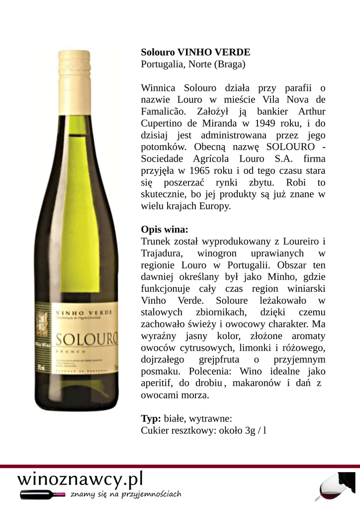 Solouro VINHO VERDE Portugalia, Norte (Braga) Winnica Solouro działa przy parafii o nazwie Louro w mieście Vila Nova de Famalicão. Założył ją bankier Arthur Cupertino de Miranda w 1949 roku, i do dzisiaj jest administrowana przez jego potomków. Obecną nazwę SOLOURO Sociedade Agrícola Louro S.A. firma przyjęła w 1965 roku i od tego czasu stara się poszerzać rynki zbytu. Robi to skutecznie, bo jej produkty są już znane w wielu krajach Europy. Opis wina: Trunek został wyprodukowany z Loureiro i Trajadura, winogron uprawianych w regionie Louro w Portugalii. Obszar ten dawniej określany był jako Minho, gdzie funkcjonuje cały czas region winiarski Vinho Verde. Soloure leżakowało w stalowych zbiornikach, dzięki czemu zachowało świeży i owocowy charakter. Ma wyraźny jasny kolor, złożone aromaty owoców cytrusowych, limonki i różowego, dojrzałego grejpfruta o przyjemnym posmaku. Polecenia: Wino idealne jako aperitif, do drobiu , makaronów i dań z owocami morza. Typ: białe, wytrawne: Cukier resztkowy: około 3g / l