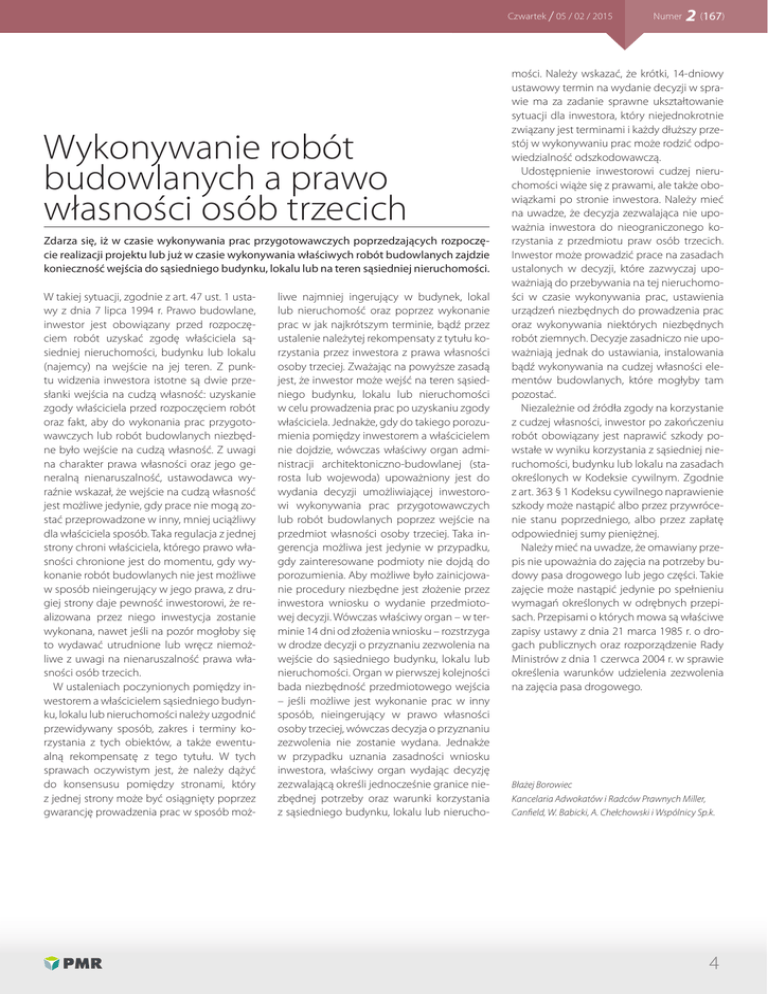 Czwartek / 05 / 02 / 2015 Wykonywanie robót budowlanych a prawo własności osób trzecich Zdarza się, iż w czasie wykonywania prac przygotowawczych poprzedzających rozpoczęcie realizacji projektu lub już w czasie wykonywania właściwych robót budowlanych zajdzie konieczność wejścia do sąsiedniego budynku, lokalu lub na teren sąsiedniej nieruchomości. W takiej sytuacji, zgodnie z art. 47 ust. 1 ustawy z dnia 7 lipca 1994 r. Prawo budowlane, inwestor jest obowiązany przed rozpoczęciem robót uzyskać zgodę właściciela sąsiedniej nieruchomości, budynku lub lokalu (najemcy) na wejście na jej teren. Z punktu widzenia inwestora istotne są dwie przesłanki wejścia na cudzą własność: uzyskanie zgody właściciela przed rozpoczęciem robót oraz fakt, aby do wykonania prac przygotowawczych lub robót budowlanych niezbędne było wejście na cudzą własność. Z uwagi na charakter prawa własności oraz jego generalną nienaruszalność, ustawodawca wyraźnie wskazał, że wejście na cudzą własność jest możliwe jedynie, gdy prace nie mogą zostać przeprowadzone w inny, mniej uciążliwy dla właściciela sposób. Taka regulacja z jednej strony chroni właściciela, którego prawo własności chronione jest do momentu, gdy wykonanie robót budowlanych nie jest możliwe w sposób nieingerujący w jego prawa, z drugiej strony daje pewność inwestorowi, że realizowana przez niego inwestycja zostanie wykonana, nawet jeśli na pozór mogłoby się to wydawać utrudnione lub wręcz niemożliwe z uwagi na nienaruszalność prawa własności osób trzecich. W ustaleniach poczynionych pomiędzy inwestorem a właścicielem sąsiedniego budynku, lokalu lub nieruchomości należy uzgodnić przewidywany sposób, zakres i terminy korzystania z tych obiektów, a także ewentualną rekompensatę z tego tytułu. W tych sprawach oczywistym jest, że należy dążyć do konsensusu pomiędzy stronami, który z jednej strony może być osiągnięty poprzez gwarancję prowadzenia prac w sposób moż- liwe najmniej ingerujący w budynek, lokal lub nieruchomość oraz poprzez wykonanie prac w jak najkrótszym terminie, bądź przez ustalenie należytej rekompensaty z tytułu korzystania przez inwestora z prawa własności osoby trzeciej. Zważając na powyższe zasadą jest, że inwestor może wejść na teren sąsiedniego budynku, lokalu lub nieruchomości w celu prowadzenia prac po uzyskaniu zgody właściciela. Jednakże, gdy do takiego porozumienia pomiędzy inwestorem a właścicielem nie dojdzie, wówczas właściwy organ administracji architektoniczno-budowlanej (starosta lub wojewoda) upoważniony jest do wydania decyzji umożliwiającej inwestorowi wykonywania prac przygotowawczych lub robót budowlanych poprzez wejście na przedmiot własności osoby trzeciej. Taka ingerencja możliwa jest jedynie w przypadku, gdy zainteresowane podmioty nie dojdą do porozumienia. Aby możliwe było zainicjowanie procedury niezbędne jest złożenie przez inwestora wniosku o wydanie przedmiotowej decyzji. Wówczas właściwy organ – w terminie 14 dni od złożenia wniosku – rozstrzyga w drodze decyzji o przyznaniu zezwolenia na wejście do sąsiedniego budynku, lokalu lub nieruchomości. Organ w pierwszej kolejności bada niezbędność przedmiotowego wejścia – jeśli możliwe jest wykonanie prac w inny sposób, nieingerujący w prawo własności osoby trzeciej, wówczas decyzja o przyznaniu zezwolenia nie zostanie wydana. Jednakże w przypadku uznania zasadności wniosku inwestora, właściwy organ wydając decyzję zezwalającą określi jednocześnie granice niezbędnej potrzeby oraz warunki korzystania z sąsiedniego budynku, lokalu lub nierucho- Numer 2 (167) mości. Należy wskazać, że krótki, 14-dniowy ustawowy termin na wydanie decyzji w sprawie ma za zadanie sprawne ukształtowanie sytuacji dla inwestora, który niejednokrotnie związany jest terminami i każdy dłuższy przestój w wykonywaniu prac może rodzić odpowiedzialność odszkodowawczą. Udostępnienie inwestorowi cudzej nieruchomości wiąże się z prawami, ale także obowiązkami po stronie inwestora. Należy mieć na uwadze, że decyzja zezwalająca nie upoważnia inwestora do nieograniczonego korzystania z przedmiotu praw osób trzecich. Inwestor może prowadzić prace na zasadach ustalonych w decyzji, które zazwyczaj upoważniają do przebywania na tej nieruchomości w czasie wykonywania prac, ustawienia urządzeń niezbędnych do prowadzenia prac oraz wykonywania niektórych niezbędnych robót ziemnych. Decyzje zasadniczo nie upoważniają jednak do ustawiania, instalowania bądź wykonywania na cudzej własności elementów budowlanych, które mogłyby tam pozostać. Niezależnie od źródła zgody na korzystanie z cudzej własności, inwestor po zakończeniu robót obowiązany jest naprawić szkody powstałe w wyniku korzystania z sąsiedniej nieruchomości, budynku lub lokalu na zasadach określonych w Kodeksie cywilnym. Zgodnie z art. 363 § 1 Kodeksu cywilnego naprawienie szkody może nastąpić albo przez przywrócenie stanu poprzedniego, albo przez zapłatę odpowiedniej sumy pieniężnej. Należy mieć na uwadze, że omawiany przepis nie upoważnia do zajęcia na potrzeby budowy pasa drogowego lub jego części. Takie zajęcie może nastąpić jedynie po spełnieniu wymagań określonych w odrębnych przepisach. Przepisami o których mowa są właściwe zapisy ustawy z dnia 21 marca 1985 r. o drogach publicznych oraz rozporządzenie Rady Ministrów z dnia 1 czerwca 2004 r. w sprawie określenia warunków udzielenia zezwolenia na zajęcia pasa drogowego. Błażej Borowiec Kancelaria Adwokatów i Radców Prawnych Miller, Canfield, W. Babicki, A. Chełchowski i Wspólnicy Sp.k. 4