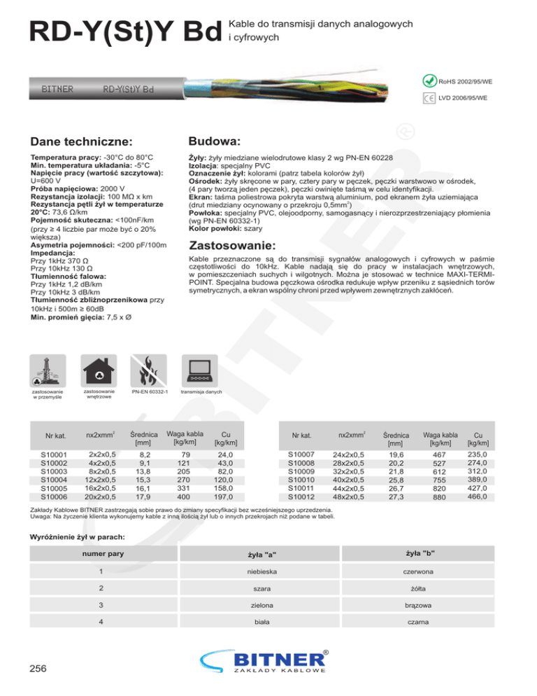 RD-Y(St)Y Bd Kable do transmisji danych analogowych i cyfrowych RoHS 2002/95/WE RoHS LVD 2006/95/WE Dane techniczne: Budowa: Temperatura pracy: -30°C do 80°C Min. temperatura układania: -5°C Napięcie pracy (wartość szczytowa): U=600 V Próba napięciowa: 2000 V Rezystancja izolacji: 100 MΩ x km Rezystancja pętli żył w temperaturze 20°C: 73,6 Ω/km Pojemność skuteczna: <100nF/km (przy ≥ 4 liczbie par może być o 20% większa) Asymetria pojemności: <200 pF/100m Impedancja: Przy 1kHz 370 Ω Przy 10kHz 130 Ω Tłumienność falowa: Przy 1kHz 1,2 dB/km Przy 10kHz 3 dB/km Tłumienność zbliżnoprzenikowa przy 10kHz i 500m ≥ 60dB Min. promień gięcia: 7,5 x Ø Żyły: żyły miedziane wielodrutowe klasy 2 wg PN-EN 60228 Izolacja: specjalny PVC Oznaczenie żył: kolorami (patrz tabela kolorów żył) Ośrodek: żyły skręcone w pary, cztery pary w pęczek, pęczki warstwowo w ośrodek, (4 pary tworzą jeden pęczek), pęczki owinięte taśmą w celu identyfikacji. Ekran: taśma poliestrowa pokryta warstwą aluminium, pod ekranem żyła uziemiająca 2 (drut miedziany ocynowany o przekroju 0,5mm ) Powłoka: specjalny PVC, olejoodporny, samogasnący i nierozprzestrzeniający płomienia (wg PN-EN 60332-1) Kolor powłoki: szary zastosowanie w przemyśle zastosowanie wnętrzowe Nr kat. nx2xmm S10001 S10002 S10003 S10004 S10005 S10006 2x2x0,5 4x2x0,5 8x2x0,5 12x2x0,5 16x2x0,5 20x2x0,5 2 Zastosowanie: Kable przeznaczone są do transmisji sygnałów analogowych i cyfrowych w paśmie częstotliwości do 10kHz. Kable nadają się do pracy w instalacjach wnętrzowych, w pomieszczeniach suchych i wilgotnych. Można je stosować w technice MAXI-TERMIPOINT. Specjalna budowa pęczkowa ośrodka redukuje wpływ przeniku z sąsiednich torów symetrycznych, a ekran wspólny chroni przed wpływem zewnętrznych zakłóceń. PN-EN 60332-1 transmisja danych Średnica [mm] Waga kabla [kg/km] 8,2 9,1 13,8 15,3 16,1 17,9 79 121 205 270 331 400 Cu [kg/km] nx2xmm Nr kat. S10007 S10008 S10009 S10010 S10011 S10012 24,0 43,0 82,0 120,0 158,0 197,0 2 24x2x0,5 28x2x0,5 32x2x0,5 40x2x0,5 44x2x0,5 48x2x0,5 Średnica [mm] Waga kabla [kg/km] Cu [kg/km] 19,6 20,2 21,8 25,8 26,7 27,3 467 527 612 755 820 880 235,0 274,0 312,0 389,0 427,0 466,0 Zakłady Kablowe BITNER zastrzegają sobie prawo do zmiany specyfikacji bez wcześniejszego uprzedzenia. Uwaga: Na życzenie klienta wykonujemy kable z inną ilością żył lub o innych przekrojach niż podane w tabeli. Wyróżnienie żył w parach: numer pary żyła "a" żyła "b" 1 niebieska czerwona 2 szara żółta 3 zielona brązowa 4 biała czarna ® 256