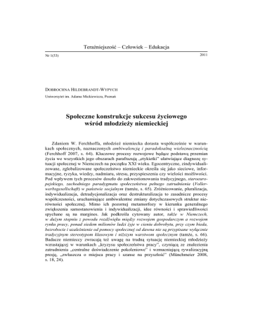 Teraźniejszość – Człowiek – Edukacja 2011 Nr 1(53) DOBROCHNA HILDEBRANDT-WYPYCH Uniwersytet im. Adama Mickiewicza, Poznań Społeczne konstrukcje sukcesu życiowego wśród młodzieży niemieckiej Zdaniem W. Ferchhoffa, młodzież niemiecka dorasta współcześnie w warunkach społecznych, naznaczonych ambiwalencją i paradoksalną wieloznacznością (Ferchhoff 2007, s. 64). Kluczowe procesy rozwojowe będące podstawą przemian życia we wszystkich jego obszarach parafrazują „etykietki” ułatwiające diagnozę sytuacji społecznej w Niemczech na początku XXI wieku. Egocentryczne, zindywidualizowane, zglobalizowane społeczeństwo niemieckie określa się jako sieciowe, informacyjne, ryzyka, wiedzy, nadmiaru, stresu, przyspieszenia czy wielości możliwości. Pod wpływem tych procesów doszło do zakwestionowania tradycyjnego, staroeuropejskiego, zachodniego paradygmatu społeczeństwa pełnego zatrudnienia (Vollerwerbsgesellschaft) w państwie socjalnym (tamże, s. 65). Zróżnicowanie, pluralizacja, indywidualizacja, detradycjonalizacja oraz destrukturalizacja to zasadnicze procesy współczesności, uruchamiające ambiwalentne zmiany dotychczasowych struktur nierówności społecznej. Mimo ich pozornej metamorfozy w kierunku generalnego zwiększenia samostanowienia i indywidualizacji, idee równości i sprawiedliwości spychane są na margines. Jak podkreśla cytowany autor, także w Niemczech, w dużym stopniu z powodu rozdźwięku między rozwojem gospodarczym a rozwojem rynku pracy, ponad siedem milionów ludzi żyje w cieniu dobrobytu, przy czym bieda, bezrobocie i uzależnienie od pomocy społecznej od dawna nie są przypisane wyłącznie tradycyjnym stereotypom klasowym i niższym warstwom społecznym (tamże, s. 66). Badacze niemieccy zwracają też uwagę na trudną sytuację niemieckiej młodzieży wzrastającej w warunkach „kryzysu społeczeństwa pracy”, czyniącą ze znalezienia zatrudnienia „centralne doświadczenie pokoleniowe” i wzmacniającą rywalizacyjną presję, „zwłaszcza o miejsca pracy i szanse na przyszłość” (Münchmeier 2008, s. 18, 24). 82 Dobrochna HILDEBRANDT-WYPYCH Młodzież niemiecka, a zwłaszcza jej społecznie uprzywilejowana część (studenci wyższych uczelni), doświadcza także życia w społeczeństwie merytokratycznym, w którym znaczenie wiedzy i kształcenia, zwłaszcza wyższego, systematycznie wzrasta. Z perspektywy zjednoczeniowej zwraca uwagę „nadrabiająca braki ekspansja edukacji w Niemczech Wschodnich”: wzrost liczby osób ze świadectwem, uprawniającym do kontynuacji nauki na uniwersytecie czy w wyższej szkole zawodowej (Geißler 2004, s. 375)1. W latach 90. systematycznie wzrastała też liczba studentów uniwersytetów i wyższych szkół zawodowych2. Wzrost znaczenia formalnego kształcenia w postindustrialnych społeczeństwach, nazywany w Niemczech ekspansją edukacji (Bildungsexpansion), oddają dane liczbowe, np. wzrost liczby gimnazjalistów, czyli osób uczęszczających do najwyższej w hierarchii instytucji edukacyjnych modelu trójdrożnego szkoły obowiązkowej: z 14% w roku 1960 do 33% w roku 2003. Beneficjentkami ekspansji edukacji w Niemczech są także kobiety, których odsetek wśród osób rozpoczynających studia wzrósł w tym samym okresie z 27% do 48,8% (Scherr 2009, s. 142). Poniższe rozważania poświęcone są społecznie konstruowanej „morfologii sukcesu” studentów niemieckich3, w szczególności sposobom, w jakie łączą oni subiektywne znaczenie sukcesu życiowego z obiektywną strukturą społeczną, w której on zachodzi. Mimo że ich głosów nie można traktować jako reprezentatywnych dla młodzieży niemieckiej, dają one wgląd w jednostkowe doświadczenia. Polifoniczność i wielowątkowość refleksji niemieckich studentów na temat sukcesu życiowego przywodzi na myśl – wzmiankowaną przez E.G. Gubę i Y.S. Lincoln – „krystaliczność” tekstów postmodernistycznych. Ich zasadniczym wyobrażeniem „trafności” jest kryształ, który łączy symetrię i treść z nieskończoną różnorodnością kształtów, substancji, transmutacji, wielowymiarowości oraz kątów widzenia. Kryształy rosną, zmieniają się, modyfikują, ale nie są amorficzne. Kryształy są pryzmatami, które odbijają zewnętrzność oraz załamują w sobie, tworząc rozmaite kolory, wzory, matryce, promieniując w różnych kierunkach. To, co widzimy, zależy od punktu, w którym spoczy1 W latach 1992–2003 odsetek osób w wieku 16–29 lat, posiadających/chcących posiadać świadectwo, umożliwiające kontynuację nauki w szkołach wyższych (Fachhochschulreife/Abitur) wzrósł w Niemczech Wschodnich z 37 do 43% (Sardei-Biermann, Kanalas, 2006, s. 36). 2 W latach 1997–2007 odsetek absolwentów pierwszego kierunku studiów (Erstabsolventenquote), w stosunku do całej populacji osób w danej grupie wiekowej wzrósł z 16,4 do 24,1% (Brugger, Stroh, Schmidt 2009, s. 15). 3 Tekst ten stanowi wyimek z badań nad sukcesem życiowym, prowadzonych w ramach projektu badawczego, finansowanego ze środków Ministerstwa Nauki, zatytułowanego: Społeczno-edukacyjne konstrukcje sukcesu życiowego. Studium z pedagogiki porównawczej na przykładzie młodzieży polskiej, czeskiej, niemieckiej i holenderskiej. Zasadniczym celem projektu była wieloaspektowa analiza kategorii „sukces życiowy”, zarówno na poziomie debat teoretycznych i ideologicznych, jak i świadomości oraz praktyki społecznej w badanych krajach. W badaniu nad postrzeganiem koncepcji sukcesu życiowego wśród studentek i studentów Uniwersytetu w Heidelbergu w Niemczech udział wzięło 25 osób (19 kobiet i 6 mężczyzn) w wieku 20–26 lat (urodzonych w latach 1982–1988). Społeczne konstrukcje sukcesu życiowego wśród młodzieży niemieckiej 83 wam (Guba, Lincoln 2009, s. 303–304). Dążenie do tak rozumianej „poststrukturalnej transgresji” przyświecało również podjętej próbie rekonstr