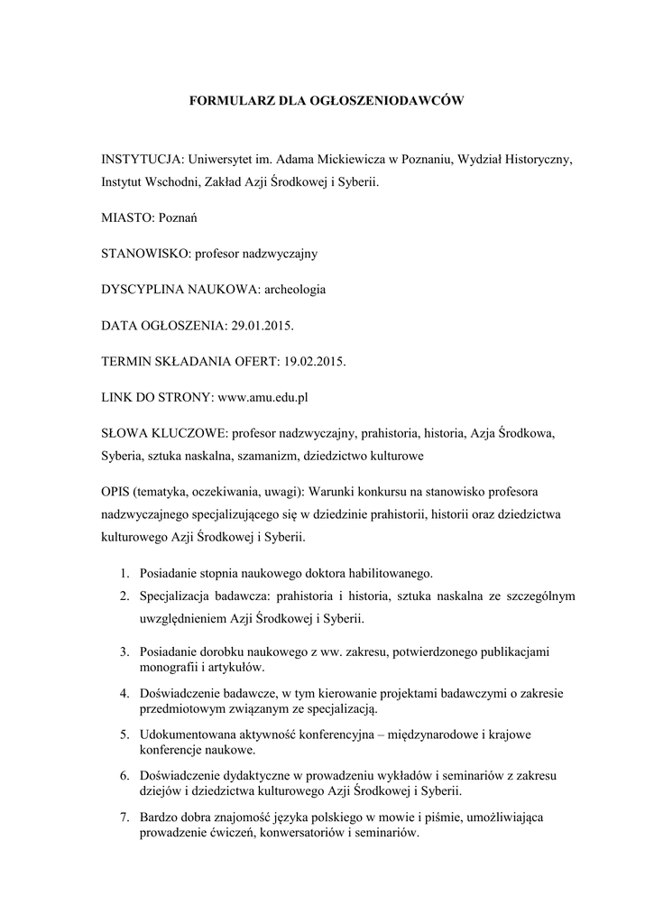 FORMULARZ DLA OGŁOSZENIODAWCÓW INSTYTUCJA: Uniwersytet im. Adama Mickiewicza w Poznaniu, Wydział Historyczny, Instytut Wschodni, Zakład Azji Środkowej i Syberii. MIASTO: Poznań STANOWISKO: profesor nadzwyczajny DYSCYPLINA NAUKOWA: archeologia DATA OGŁOSZENIA: 29.01.2015. TERMIN SKŁADANIA OFERT: 19.02.2015. LINK DO STRONY: www.amu.edu.pl SŁOWA KLUCZOWE: profesor nadzwyczajny, prahistoria, historia, Azja Środkowa, Syberia, sztuka naskalna, szamanizm, dziedzictwo kulturowe OPIS (tematyka, oczekiwania, uwagi): Warunki konkursu na stanowisko profesora nadzwyczajnego specjalizującego się w dziedzinie prahistorii, historii oraz dziedzictwa kulturowego Azji Środkowej i Syberii. 1. Posiadanie stopnia naukowego doktora habilitowanego. 2. Specjalizacja badawcza: prahistoria i historia, sztuka naskalna ze szczególnym uwzględnieniem Azji Środkowej i Syberii. 3. Posiadanie dorobku naukowego z ww. zakresu, potwierdzonego publikacjami monografii i artykułów. 4. Doświadczenie badawcze, w tym kierowanie projektami badawczymi o zakresie przedmiotowym związanym ze specjalizacją. 5. Udokumentowana aktywność konferencyjna – międzynarodowe i krajowe konferencje naukowe. 6. Doświadczenie dydaktyczne w prowadzeniu wykładów i seminariów z zakresu dziejów i dziedzictwa kulturowego Azji Środkowej i Syberii. 7. Bardzo dobra znajomość języka polskiego w mowie i piśmie, umożliwiająca prowadzenie ćwiczeń, konwersatoriów i seminariów. 8. Dobra znajomość dwóch języków kongresowych. 9. Uniwersytet im. Adama Mickiewicza w Poznaniu winien stanowić podstawowe miejsce pracy. Dokumenty wymagane od kandydata: 1. Podanie do JM Rektora UAM. 2. Kwestionariusz osobowy. plik do pobrania 3. Życiorys. 4. Dokument potwierdzający posiadanie stopnia naukowego doktora habilitowanego nauk humanistycznych. 5. Informacja o dorobku naukowym, dydaktycznym i organizacyjnym. 6. Wykaz publikacji. Zgłoszenia należy nadsyłać na adres: Wydział Historyczny Uniwersytetu im. Adama Mickiewicza ul. Św. Marcin 78 61-809 Poznań
