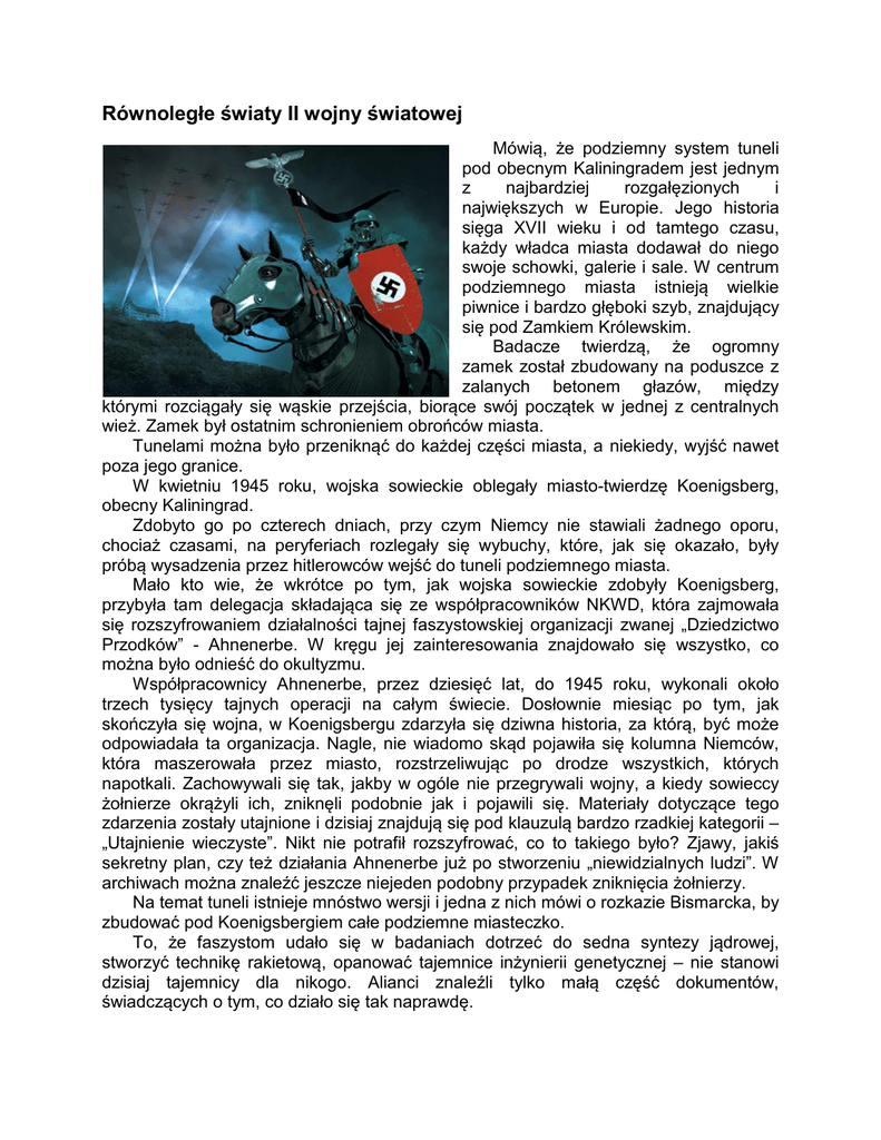 Równoległe światy II wojny światowej Mówią, że podziemny system tuneli pod obecnym Kaliningradem jest jednym z najbardziej rozgałęzionych i największych w Europie. Jego historia sięga XVII wieku i od tamtego czasu, każdy władca miasta dodawał do niego swoje schowki, galerie i sale. W centrum podziemnego miasta istnieją wielkie piwnice i bardzo głęboki szyb, znajdujący się pod Zamkiem Królewskim. Badacze twierdzą, że ogromny zamek został zbudowany na poduszce z zalanych betonem głazów, między którymi rozciągały się wąskie przejścia, biorące swój początek w jednej z centralnych wież. Zamek był ostatnim schronieniem obrońców miasta. Tunelami można było przeniknąć do każdej części miasta, a niekiedy, wyjść nawet poza jego granice. W kwietniu 1945 roku, wojska sowieckie oblegały miasto-twierdzę Koenigsberg, obecny Kaliningrad. Zdobyto go po czterech dniach, przy czym Niemcy nie stawiali żadnego oporu, chociaż czasami, na peryferiach rozlegały się wybuchy, które, jak się okazało, były próbą wysadzenia przez hitlerowców wejść do tuneli podziemnego miasta. Mało kto wie, że wkrótce po tym, jak wojska sowieckie zdobyły Koenigsberg, przybyła tam delegacja składająca się ze współpracowników NKWD, która zajmowała się rozszyfrowaniem działalności tajnej faszystowskiej organizacji zwanej „Dziedzictwo Przodków” - Ahnenerbe. W kręgu jej zainteresowania znajdowało się wszystko, co można było odnieść do okultyzmu. Współpracownicy Ahnenerbe, przez dziesięć lat, do 1945 roku, wykonali około trzech tysięcy tajnych operacji na całym świecie. Dosłownie miesiąc po tym, jak skończyła się wojna, w Koenigsbergu zdarzyła się dziwna historia, za którą, być może odpowiadała ta organizacja. Nagle, nie wiadomo skąd pojawiła się kolumna Niemców, która maszerowała przez miasto, rozstrzeliwując po drodze wszystkich, których napotkali. Zachowywali się tak, jakby w ogóle nie przegrywali wojny, a kiedy sowieccy żołnierze okrążyli ich, zniknęli podobnie jak i pojawili się. Materiały dotyczące tego zdarzenia zostały utajnione i dzisiaj znajdują się pod klauzulą bardzo rzadkiej kategorii – „Utajnienie wieczyste”. Nikt nie potrafił rozszyfrować, co to takiego było? Zjawy, jakiś sekretny plan, czy też działania Ahnenerbe już po stworzeniu „niewidzialnych ludzi”. W archiwach można znaleźć jeszcze niejeden podobny przypadek zniknięcia żołnierzy. Na temat tuneli istnieje mnóstwo wersji i jedna z nich mówi o rozkazie Bismarcka, by zbudować pod Koenigsbergiem całe podziemne miasteczko. To, że faszystom udało się w badaniach dotrzeć do sedna syntezy jądrowej, stworzyć technikę rakietową, opanować tajemnice inżynierii genetycznej – nie stanowi dzisiaj tajemnicy dla nikogo. Alianci znaleźli tylko małą część dokumentów, świadczących o tym, co działo się tak naprawdę. W 1943 roku, w dzisiejszym obwodzie kaliningradzkim działał utajniony obiekt, oznakowany jako „Paradies”. Laboratoriami kierował sam Zelcer - twórca Ahnenerbe i to już mówi samo za siebie, jak ważne badania były tam prowadzone. A były one rzeczywiście bardzo ważne - naziści poszukiwali metod umożliwiających przemieszczanie się w czasie i przestrzeni. Pomimo tego, że przesłanki do prowadzenia tego rodzaju badań, do niedawna, zgodnie z teorią względności wielkiego Einsteina uważano za absurdalne, Niemcy mimo wszystko je prowadzili. Jest mnóstwo powodów by sądzić, że w katakumbach pod miastem naziści zainstalowali jakieś urządzenie, które mogło zmieniać czas i przestrzeń. Jedynym problemem, stojącym na drodze badaczy okazało się to, że nie posiadali wystarczająco dużego źródła energii. Chociaż, takim mógł być reaktor jądrowy, jednak jego opracowanie było już znacznie opóźnione, a i wojna też była już ostatecznie przegrana. Tym nie mniej, ta piekielna „machina czasu”, została wypróbowana i to nie jeden raz! Trudno w to uwierzyć, ale jeszcze w styczniu 1942 roku, w czasie blokady Leningradu, sowieccy żołnierze spotkali grupę żołnierzy francuskich z czasów Napoleona, a potem, już w 1944 roku, na terenie dzisiejszej Białorusi, mieszkańców panicznie nastraszył niewielki oddział niemieckich rycerzy. W tamtym czasie, na zeznania naocznych świadków była nałożona klauzula „Ściśle tajne”, a tych, którzy mieli za długi język, wysyłano na Kołymę. Legendy o „podziemnym Koenigsbergu” są, chyba, najstarszymi i najtrwalszymi właściwościami specyficznego kolorytu miasta. Powstały praktycznie tuż po wojnie, kiedy zjawili się tu pierwsi sowieccy przesiedleńcy, przetrwały do dziś i od czasu do czasu zasilane są coraz nowszymi opowieściami „naocznych świadków”. Nawet dzisiaj, wielu wierzy w to, że gdzieś tam, pod zaśmieconymi i zaplutymi chodnikami błąka się siwobrody Niemiec z zardzewiałym automatem. Tyle lat minęło od czasu zakończenia wojny i wydawałoby się, że można już zapomnieć o dziwnej historii podziemnego miasta, sekretnych laboratoriach, ale… Ostatnio w Kaliningradzie znów zaczęły się dziać dziwne i niewytłumaczalne zdarzenia. Na przykład, w Dzień Zwycięstwa, grupa studentów sfotografowała się przy pomniku filozofa Emmanuela Kanta. Jakież było zdziwienie dzieci, kiedy na wywołanej fotografii, za nimi stała postać w mundurze esesmana. Żołnierz, jedną ręką przytrzymywał automat, a drugą pozdrawiał nazistowskim gestem. Przez pewien czas, koło Zamku Królewskiego pojawiała się jeszcze jedna zjawa - nazistowski doktorhistoryk sztuki Alfred Roj, który był stróżem Bursztynowej Komnaty, wywiezionej z Carskiego Sioła. Prawda, że dziwne? A jeśli jest tak, że właśnie tam, w katakumbach pod Kaliningradem została ukryta słynna komnata, której strzegą pewne ciemne moce zjawy z czasów wojny? Może to i brzmi jak majaczenie obłąkanego, ale to, że H
