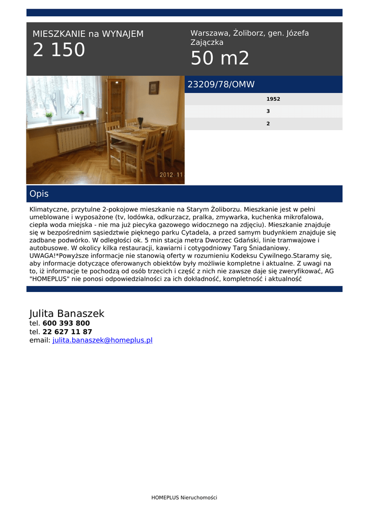 Warszawa, Żoliborz, gen. Józefa Zajączka MIESZKANIE na WYNAJEM 2 150 50 m2 23209/78/OMW 1952 3 2 Opis Klimatyczne, przytulne 2-pokojowe mieszkanie na Starym Żoliborzu. Mieszkanie jest w pełni umeblowane i wyposażone (tv, lodówka, odkurzacz, pralka, zmywarka, kuchenka mikrofalowa, ciepła woda miejska - nie ma już piecyka gazowego widocznego na zdjęciu). Mieszkanie znajduje się w bezpośrednim sąsiedztwie pięknego parku Cytadela, a przed samym budynkiem znajduje się zadbane podwórko. W odległości ok. 5 min stacja metra Dworzec Gdański, linie tramwajowe i autobusowe. W okolicy kilka restauracji, kawiarni i cotygodniowy Targ Śniadaniowy. UWAGA!*Powyższe informacje nie stanowią oferty w rozumieniu Kodeksu Cywilnego.Staramy się, aby informacje dotyczące oferowanych obiektów były możliwie kompletne i aktualne. Z uwagi na to, iż informacje te pochodzą od osób trzecich i część z nich nie zawsze daje się zweryfikować, AG "HOMEPLUS" nie ponosi odpowiedzialności za ich dokładność, kompletność i aktualność Julita Banaszek tel. 600 393 800 tel. 22 627 11 87 email: [email protected] HOMEPLUS Nieruchomości Powered by TCPDF (www.tcpdf.org)