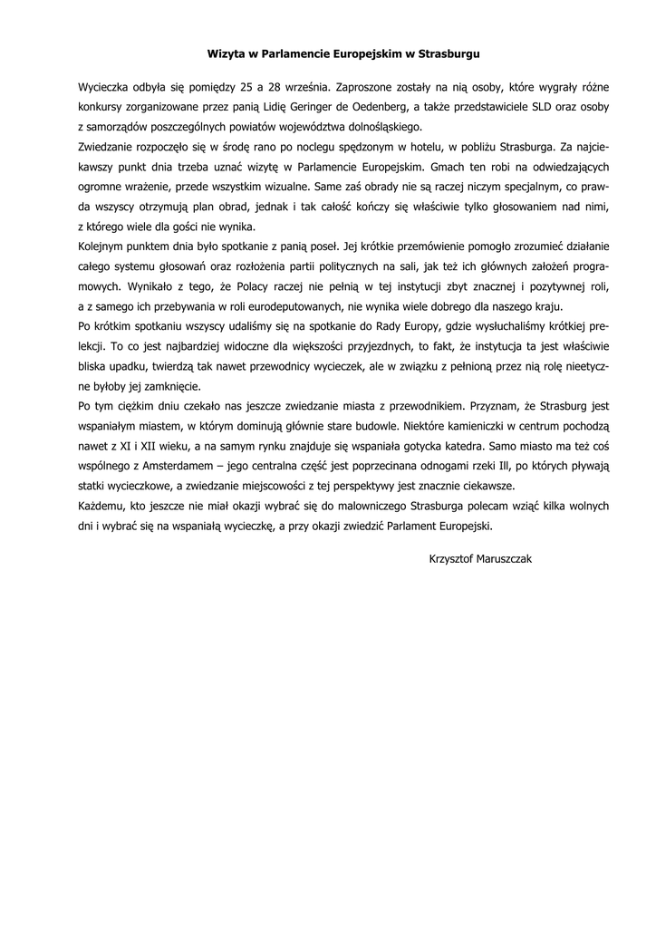 Wizyta w Parlamencie Europejskim w Strasburgu Wycieczka odbyła się pomiędzy 25 a 28 września. Zaproszone zostały na nią osoby, które wygrały róŜne konkursy zorganizowane przez panią Lidię Geringer de Oedenberg, a takŜe przedstawiciele SLD oraz osoby z samorządów poszczególnych powiatów województwa dolnośląskiego. Zwiedzanie rozpoczęło się w środę rano po noclegu spędzonym w hotelu, w pobliŜu Strasburga. Za najciekawszy punkt dnia trzeba uznać wizytę w Parlamencie Europejskim. Gmach ten robi na odwiedzających ogromne wraŜenie, przede wszystkim wizualne. Same zaś obrady nie są raczej niczym specjalnym, co prawda wszyscy otrzymują plan obrad, jednak i tak całość kończy się właściwie tylko głosowaniem nad nimi, z którego wiele dla gości nie wynika. Kolejnym punktem dnia było spotkanie z panią poseł. Jej krótkie przemówienie pomogło zrozumieć działanie całego systemu głosowań oraz rozłoŜenia partii politycznych na sali, jak teŜ ich głównych załoŜeń programowych. Wynikało z tego, Ŝe Polacy raczej nie pełnią w tej instytucji zbyt znacznej i pozytywnej roli, a z samego ich przebywania w roli eurodeputowanych, nie wynika wiele dobrego dla naszego kraju. Po krótkim spotkaniu wszyscy udaliśmy się na spotkanie do Rady Europy, gdzie wysłuchaliśmy krótkiej prelekcji. To co jest najbardziej widoczne dla większości przyjezdnych, to fakt, Ŝe instytucja ta jest właściwie bliska upadku, twierdzą tak nawet przewodnicy wycieczek, ale w związku z pełnioną przez nią rolę nieetyczne byłoby jej zamknięcie. Po tym cięŜkim dniu czekało nas jeszcze zwiedzanie miasta z przewodnikiem. Przyznam, Ŝe Strasburg jest wspaniałym miastem, w którym dominują głównie stare budowle. Niektóre kamieniczki w centrum pochodzą nawet z XI i XII wieku, a na samym rynku znajduje się wspaniała gotycka katedra. Samo miasto ma teŜ coś wspólnego z Amsterdamem – jego centralna część jest poprzecinana odnogami rzeki Ill, po których pływają statki wycieczkowe, a zwiedzanie miejscowości z tej perspektywy jest znacznie ciekawsze. KaŜdemu, kto jeszcze nie miał okazji wybrać się do malowniczego Strasburga polecam wziąć kilka wolnych dni i wybrać się na wspaniałą wycieczkę, a przy okazji zwiedzić Parlament Europejski. Krzysztof Maruszczak