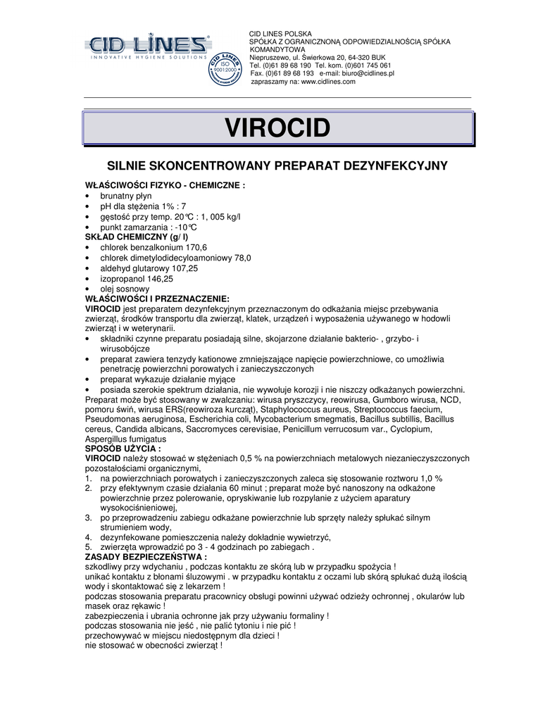 CID LINES POLSKA SPÓŁKA Z OGRANICZNONĄ ODPOWIEDZIALNOŚCIĄ SPÓŁKA KOMANDYTOWA Niepruszewo, ul. Świerkowa 20, 64-320 BUK Tel. (0)61 89 68 190 Tel. kom. (0)601 745 061 Fax. (0)61 89 68 193 e-mail: [email protected] zapraszamy na: www.cidlines.com VIROCID SILNIE SKONCENTROWANY PREPARAT DEZYNFEKCYJNY WŁAŚCIWOŚCI FIZYKO - CHEMICZNE : • brunatny płyn • pH dla stężenia 1% : 7 • gęstość przy temp. 20°C : 1, 005 kg/l • punkt zamarzania : -10°C SKŁAD CHEMICZNY (g/ l) • chlorek benzalkonium 170,6 • chlorek dimetylodidecyloamoniowy 78,0 • aldehyd glutarowy 107,25 • izopropanol 146,25 • olej sosnowy WŁAŚCIWOŚCI I PRZEZNACZENIE: VIROCID jest preparatem dezynfekcyjnym przeznaczonym do odkażania miejsc przebywania zwierząt, środków transportu dla zwierząt, klatek, urządzeń i wyposażenia używanego w hodowli zwierząt i w weterynarii. • składniki czynne preparatu posiadają silne, skojarzone działanie bakterio- , grzybo- i wirusobójcze • preparat zawiera tenzydy kationowe zmniejszające napięcie powierzchniowe, co umożliwia penetrację powierzchni porowatych i zanieczyszczonych • preparat wykazuje działanie myjące • posiada szerokie spektrum działania, nie wywołuje korozji i nie niszczy odkażanych powierzchni. Preparat może być stosowany w zwalczaniu: wirusa pryszczycy, reowirusa, Gumboro wirusa, NCD, pomoru świń, wirusa ERS(reowiroza kurcząt), Staphylococcus aureus, Streptococcus faecium, Pseudomonas aeruginosa, Escherichia coli, Mycobacterium smegmatis, Bacillus subtillis, Bacillus cereus, Candida albicans, Saccromyces cerevisiae, Penicillum verrucosum var., Cyclopium, Aspergillus fumigatus SPOSÓB UŻYCIA : VIROCID należy stosować w stężeniach 0,5 % na powierzchniach metalowych niezanieczyszczonych pozostałościami organicznymi, 1. na powierzchniach porowatych i zanieczyszczonych zaleca się stosowanie roztworu 1,0 % 2. przy efektywnym czasie działania 60 minut ; preparat może być nanoszony na odkażone powierzchnie przez polerowanie, opryskiwanie lub rozpylanie z użyciem aparatury wysokociśnieniowej, 3. po przeprowadzeniu zabiegu odkażane powierzchnie lub sprzęty należy spłukać silnym strumieniem wody, 4. dezynfekowane pomieszczenia należy dokładnie wywietrzyć, 5. zwierzęta wprowadzić po 3 - 4 godzinach po zabiegach . ZASADY BEZPIECZEŃSTWA : szkodliwy przy wdychaniu , podczas kontaktu ze skórą lub w przypadku spożycia ! unikać kontaktu z błonami śluzowymi . w przypadku kontaktu z oczami lub skórą spłukać dużą ilością wody i skontaktować się z lekarzem ! podczas stosowania preparatu pracownicy obsługi powinni używać odzieży ochronnej , okularów lub masek oraz rękawic ! zabezpieczenia i ubrania ochronne jak przy używaniu formaliny ! podczas stosowania nie jeść , nie palić tytoniu i nie pić ! przechowywać w miejscu niedostępnym dla dzieci ! nie stosować w obecności zwierząt !