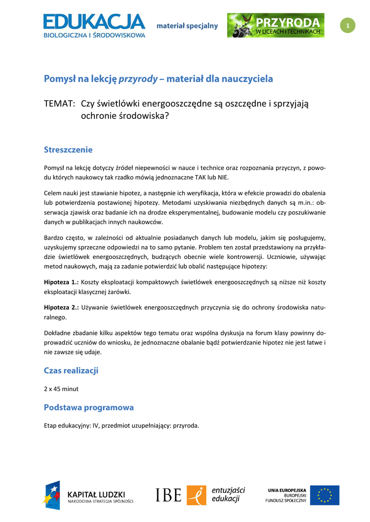 1 TEMAT: Czy świetlówki energooszczędne są oszczędne i sprzyjają ochronie środowiska? Pomysł na lekcję dotyczy źródeł niepewności w nauce i technice oraz rozpoznania przyczyn, z powodu których naukowcy tak rzadko mówią jednoznaczne TAK lub NIE. Celem nauki jest stawianie hipotez, a następnie ich weryfikacja, która w efekcie prowadzi do obalenia lub potwierdzenia postawionej hipotezy. Metodami uzyskiwania niezbędnych danych są m.in.: obserwacja zjawisk oraz badanie ich na drodze eksperymentalnej, budowanie modelu czy poszukiwanie danych w publikacjach innych naukowców. Bardzo często, w zależności od aktualnie posiadanych danych lub modelu, jakim się posługujemy, uzyskujemy sprzeczne odpowiedzi na to samo pytanie. Problem ten został przedstawiony na przykładzie świetlówek energooszczędnych, budzących obecnie wiele kontrowersji. Uczniowie, używając metod naukowych, mają za zadanie potwierdzić lub obalić następujące hipotezy: Hipoteza 1.: Koszty eksploatacji kompaktowych świetlówek energooszczędnych są niższe niż koszty eksploatacji klasycznej żarówki. Hipoteza 2.: Używanie świetlówek energooszczędnych przyczynia się do ochrony środowiska naturalnego. Dokładne zbadanie kilku aspektów tego tematu oraz wspólna dyskusja na forum klasy powinny doprowadzić uczniów do wniosku, że jednoznaczne obalanie bądź potwierdzanie hipotez nie jest łatwe i nie zawsze się udaje. 2 x 45 minut Etap edukacyjny: IV, przedmiot uzupełniający: przyroda. 2 Cele kształcenia – wymagania ogólne: Rozumienie metody naukowej, polegającej na stawianiu hipotez i ich weryfikowaniu za pomocą obserwacji i eksperymentów. Pomysł na lekcję jest jednym z czterech proponowanych tematów zajęć w ramach stworzonego nowego wątku tematycznego pt.: Źródła niepewności w nauce. Inspiracją do stworzenia nowego wątku były treści nauczania zawarte w podstawie programowej przedmiotu przyroda, rozproszone w kilku wątkach, jak: Metoda naukowa, Nauka i pseudonauka oraz Nauka w mediach. Wątek tematyczny: Źródła niepewności w nauce Temat omawiany na przykładzie zagadnień z fizyki i techniki. Treści nauczania – wymagania szczegółowe: Uczeń: (5.1) posługuje się naukowymi metodami weryfikowania informacji (np. źródło informacji, analiza danych, analiza wyników i wniosków pod kątem zgodności z aktualną wiedzą naukową); (5.2) ocenia informacje i argumenty pod kątem naukowym, odróżnia rzetelne informacje naukowe od pseudonaukowychł – uzasadnia konieczność segregowania odpadów w gospodarstwie domowym oraz konieczność specjalnego postępowania ze zużytymi świetlówkami; – proponuje działania ograniczające zużycie energii elektrycznej oraz wytwarzanie odpadów w gospodarstwach domowych; – ocenia złożoność problemu badawczego i możliwość sformułowania jednoznacznej odpowiedzi. Określenie źródeł niepewności w nauce i technice na przykładzie analizy wybranych aspektów użytkowych, ekonomicznych i środowiskowych eksploatacji świetlówek kompaktowych. Niepewność w nauce, prawdopodobieństwo, fizyka, energia, żarówki, kompaktowe świetlówki energooszczędne, prąd, napięcie, moc. Komputer z rzutnikiem 3 Filmy do wyświetlenia (potrzebny dostęp do internetu lub wcześniej zapisane filmy): http://www.trochetechniki.pl/Zarowki-kontra-swietlowki,c,1825.html http://wyborcza.biz/biznes/10,100970,12398745,UE_od_soboty_zakazuje_sprzedazy__klasy cznych__zarowek_.html?v=1&obxx=12398745 Prezentacja Przykładowa klasyczna żarówka i kompaktowa świetlówka energooszczędna (o tej samej mocy elektrycznej, np. 20 W), dwie oprawki w które można wkręcić źródła światła i podłączyć je do prądu (np. lampki na biurko) Puste opakowania po świetlówkach energooszczędnych o różnej mocy i od różnych producentów Dwa termometry o zakresie do 100oC, dwa statywy laboratoryjne do termometrów Siatka dyfrakcyjna 1. Wprowadzenie (5 minut) Nauczyciel przedstawia temat lekcji: ”Czy świetlówki energooszczędne są oszczędne i sprzyjają ochronie środowiska?” i informuje, że w trakcie zajęć uczniowie będą weryfikować hipotezy dotyczące kompaktowych świetlówek energooszczędnych, postawione na kartach pracy. W tym celu uczniowie przeanalizują oraz zinterpretują różne dane zaprezentowane na lekcji oraz dołączone do kart pracy. Nauczyciel dzieli uczniów na zespoły już na samym początku lekcji (po około 4-5 osób w zespole) i rozdaje im karty pracy. Uczniowie zapoznają się z zadaniami podanymi na kartach. Nauczyciel informuje uczniów, że są trzy rodzaje kart, aby zbadać trzy różne aspekty użytkowania świetlówek energooszczędnych. Wstępnym, wspólnym etapem pracy wszystkich zespołów jest zebranie podstawowych informacji na temat klasycznych żarówek i świetlówek energooszczędnych oraz zweryfikowanie dotychczasowej wiedzy uczniów na ten temat (Zadania 1. i 2. z kart pracy). Zadanie 3. jest inne w każdym z trzech rodzajów kart, dotyczy ono badania różnych aspektów użytkowania świetlówek energooszczędnych. Zadanie 4. natomiast jest wspólne dla wszystkich grup i stanowi podsumowanie pracy. 2. Pokaz (15 minut) Nauczyciel pokazuje uczniom żarówkę i energooszczędną świetlówkę kompaktową oraz informuje, że w trakcie pokazu należy rozwiązać Zadanie 1. z kart pracy. Następnie nauczyciel podłącza kolejno obie lampy do prądu, demonstruje, jak szybko się zapalają i jakim światłem świecą. Za pomocą siatki dyfrakcyjnej nauczyciel demonstruje widma obu lamp. 4 Jeśli uczniowie nie od razu zauważą różnice między lampami, nauczyciel wyłącza je na chwilę, pozwalając im nieco ostygnąć (ważne w przypadku świetlówki), i powtarza prezentację po raz drugi. Po pokazie nauczyciel prosi uczniów o odpowiedzi na pytania z Zadania 1.: Czy oba rodzaje lamp osiągają maksymalną jasność równie szybko? Jeśli nie, to która z lamp osiąga maksymalną jasność sz