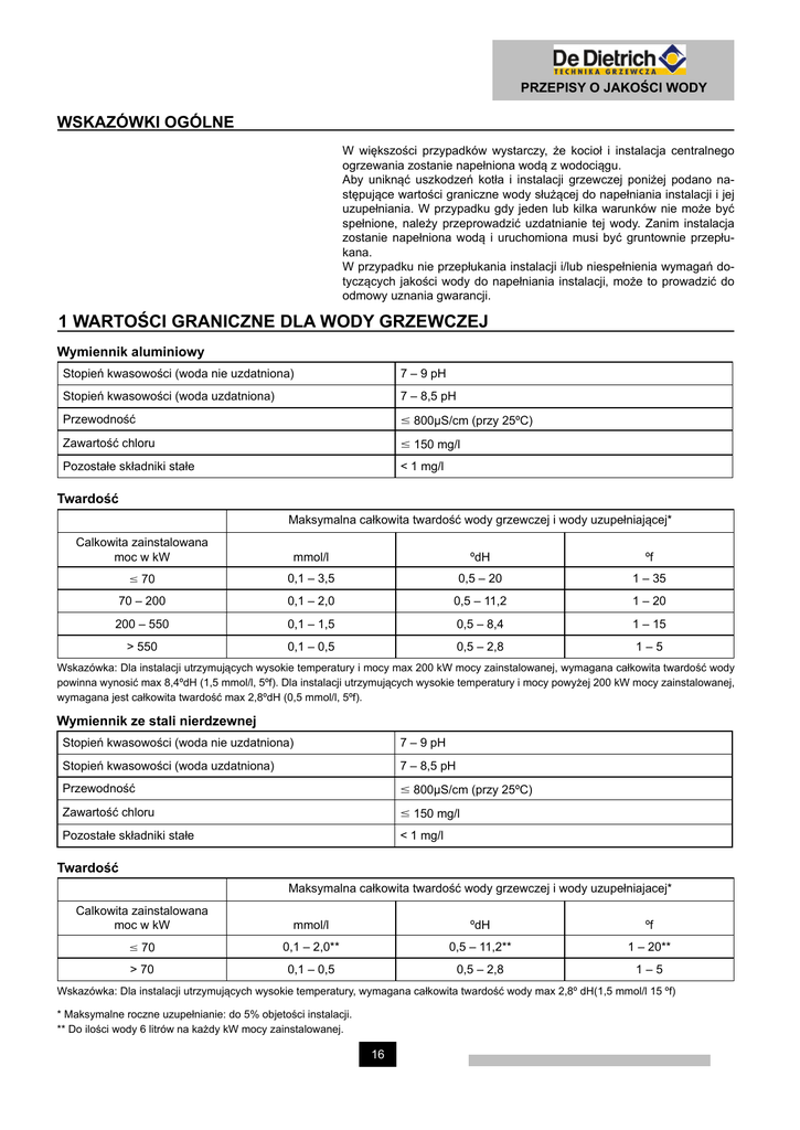 PRZEPISY O JAKOŚCI WODY WSKAZÓWKI OGÓLNE W większości przypadków wystarczy, że kocioł i instalacja centralnego ogrzewania zostanie napełniona wodą z wodociągu. Aby uniknąć uszkodzeń kotła i instalacji grzewczej poniżej podano następujące wartości graniczne wody służącej do napełniania instalacji i jej uzupełniania. W przypadku gdy jeden lub kilka warunków nie może być spełnione, należy przeprowadzić uzdatnianie tej wody. Zanim instalacja zostanie napełniona wodą i uruchomiona musi być gruntownie przepłukana. W przypadku nie przepłukania instalacji i/lub niespełnienia wymagań dotyczących jakości wody do napełniania instalacji, może to prowadzić do odmowy uznania gwarancji. 1 WARTOŚCI GRANICZNE DLA WODY GRZEWCZEJ Wymiennik aluminiowy Stopień kwasowości (woda nie uzdatniona) 7 – 9 pH Stopień kwasowości (woda uzdatniona) 7 – 8,5 pH Przewodność ≤ 800μS/cm (przy 25ºC) Zawartość chloru ≤ 150 mg/l Pozostałe składniki stałe < 1 mg/l Twardość Maksymalna całkowita twardość wody grzewczej i wody uzupełniającej* Calkowita zainstalowana moc w kW mmol/l ºdH ºf ≤ 70 0,1 – 3,5 0,5 – 20 1 – 35 70 – 200 0,1 – 2,0 0,5 – 11,2 1 – 20 200 – 550 0,1 – 1,5 0,5 – 8,4 1 – 15 > 550 0,1 – 0,5 0,5 – 2,8 1–5 Wskazówka: Dla instalacji utrzymujących wysokie temperatury i mocy max 200 kW mocy zainstalowanej, wymagana całkowita twardość wody powinna wynosić max 8,4ºdH (1,5 mmol/l, 5ºf). Dla instalacji utrzymujących wysokie temperatury i mocy powyżej 200 kW mocy zainstalowanej, wymagana jest całkowita twardość max 2,8ºdH (0,5 mmol/l, 5ºf). Wymiennik ze stali nierdzewnej Stopień kwasowości (woda nie uzdatniona) 7 – 9 pH Stopień kwasowości (woda uzdatniona) 7 – 8,5 pH Przewodność ≤ 800μS/cm (przy 25ºC) Zawartość chloru ≤ 150 mg/l Pozostałe składniki stałe < 1 mg/l Twardość Maksymalna całkowita twardość wody grzewczej i wody uzupełniajacej* Calkowita zainstalowana moc w kW mmol/l ºdH ºf ≤ 70 0,1 – 2,0** 0,5 – 11,2** 1 – 20** > 70 0,1 – 0,5 0,5 – 2,8 1–5 Wskazówka: Dla instalacji utrzymujących wysokie temperatury, wymagana całkowita twardość wody max 2,8º dH(1,5 mmol/l 15 ºf) * Maksymalne roczne uzupełnianie: do 5% objetości instalacji. ** Do ilości wody 6 litrów na każdy kW mocy zainstalowanej. 16 PRZEPISY O JAKOŚCI WODY 1.1 Wskazówki ogólne dotyczące jakości wody Kotły grzewcze De Dietrich najlepiej pracują z dobrej jakości wodą. Najcześciej branymi pod uwagę czynnikami, które mogą wpływać na jakość wody, są: tlen, wapń (kamień kotłowy), szlaka, stopień kwasności wody a take inne substancje ((m.in. chlorki, substancje stałe (minerały)). Jakość wody mierzona jest na podpodstawie stopnia jej kwasowości, twardości, przewodności, zawartości chlorków, żelaza i jego tlenków oraz zawartości innych substancji (jak np. resztki stosowanych w przeszłości środków uzdatniających wodę). Obok jakości wody grzewczej ważną rolę odgrywa tażke sama instalacja. Gdy zostaną użyte materiały, które będą miały wpływ na dyfuzję tlenu do wody grzewczej (np. niektóre rury stosowane do ogrzewania podłogowego, rury podłączeniowe i inne) mogą w czasie pracy instalacji wprowadzić do wody grzewczej znaczną ilość tlenu. Należy takie przypadki eliminować. Także gdy instalacja grzewcza regularnie dopełniana jest świeżą wodą, dostarczany jest każdorazowo tlen i inne związki stałe (m.in. wapń). Dlatego nie wolno dopuszczać do niekontrolowanego dopełniania instalacji świeżą wodą. W celu kontroli ilości dopuszczanej wody należy zainstalować licznik wody i zapisywać to w dokumentacji instalacji. W ciągu roku nie powinno być dopuszczone wiecej niż 5% ogólnej pojemności całej instalacji grzewczej. 1.2. Wskazówki dotyczące jakości wody nowych instalacji W przypadku nowych instalacji centralnego ogrzewania, cała instalacja (wyłączając kocioł grzewczy) przed uruchomieniem bezwzględnie powinna być dokładnie przepłukana. Przez płukanie zostaną usunięte zanieczyszczenia (resztki pospawalnicze, smary montażowe itp.) a także środki konserwujace (m.in. oleje mineralne). Płukanie można wzmocnić dodatkowo środkami czyszczącymi (ta czynność jednak musi być przeprowadzona wyłącznie przez doświadczonego technika, a najlepiej przez autoryzowany serwis). Woda nie powinna być bardziej zmiękczona niż do 0,5 ºdH (1 ºf), ponieważ zbyt miękka woda jest również szkodliwa dla instalacji. Do zmiękczania wody musi być stosowany inhibitor, który również bedzie chronił instalacje przed korozją. 1.3 Wskazówki dotyczące istniejących instalacji Jeśli stwierdzono, że jakość wody w istniejących instalacjach jest niezadawalająca, należy przedsięwziąć środki zaradcze. W strefach pełnego przepływu można stosować fitry siatkowe, filtroodmulniki oraz filtroodmulniki magnetyczne. Wymienione urzadzenia slużą do separacji zanieczyszczeń stałych. Przed zamontowaniem kotła w starej instalacji należy ją gruntownie przepłukać. 17 PRZEPISY O JAKOŚCI WODY Czynność ta musi być przeprowadzona niezwykle starannie przez autoryzowanego instalatora. Wymagane jest użycie agregatów pompowych zapewniających duży przepływ przez płukane odcinki. Szczególną uwagę należy zwrócić na tzw. miejsca ślepe gdzie gromadzi się najwięcej zanieczyszczeń. W przypadku płukania z użyciem środków chemicznych, po zakończeniu procesu oczyszczania nalezy zadbać o przpłukanie instalacji czystą wodą dla usunięcia resztek odczynników chemicznych. W przypadku odlożenia sie zanieczyszczeń stałych w kotle niezbędne jest jego czyszczenie. Szczególnie groźne jest odłożenie się kamienia kotłowego. Największe odkładanie się kamienia kotłowego następuje w wymienniku kotła w miejscach najbardziej nagrzanych. W takim przypadku kocioł musi być dokładnie wyczyszczony najlepie