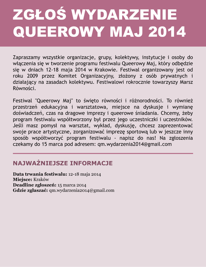 ZGŁOŚ WYDARZENIE QUEEROWY MAJ 2014 Zapraszamy wszystkie organizacje, grupy, kolektywy, instytucje i osoby do włączenia się w tworzenie programu festiwalu Queerowy Maj, który odbędzie się w dniach 12-18 maja 2014 w Krakowie. Festiwal organizowany jest od roku 2009 przez Komitet Organizacyjny, złożony z osób prywatnych i działający na zasadach kolektywu. Festiwalowi rokrocznie towarzyszy Marsz Równości. Festiwal "Queerowy Maj" to święto równości i różnorodności. To również przestrzeń edukacyjna i warsztatowa, miejsce na dyskusje i wymianę doświadczeń, czas na dragowe imprezy i queerowe śniadania. Chcemy, żeby program festiwalu współtworzony był przez jego uczestniczki i uczestników. Jeśli masz pomysł na warsztat, wykład, dyskusję, chcesz zaprezentować swoje prace artystyczne, zorganizować imprezę sportową lub w jeszcze inny sposób współtworzyć program festiwalu - napisz do nas! Na zgłoszenia czekamy do 15 marca pod adresem: [email protected] NAJWAŻNIEJSZE INFORMACJE Data trwania festiwalu: 12-18 maja 2014 Miejsce: Kraków Deadline zgłoszeń: 15 marca 2014 Gdzie zgłaszać: [email protected] BLOKI TEMATYCZNE W roku 2014 proponujemy następujące bloki tematyczne: QUEER: TEORIA I PRAKTYKA Queer na akademii. Jak opisywać i analizować to, co z zasady niedefiniowalne? Czy nikt nie rodzi się kobietą, ale się nią staje? Czy płeć to to, co robimy, czy to, z czym się rodzimy? Czy płynna tożsamość to jeszcze tożsamość? Czy orientacja seksualna w ogóle istnieje? Ile jest tożsamości płciowych, psychoseksualnych i czy to pytanie w ogóle ma sens? Queer na ulicy. Jaki potencjał polityczny ma ruch społeczny oparty na zasadzie całkowitego rozmycia granic? Jakie są doświadczenia queerowych ruchów społecznych na świecie? Czy ruch queerowy w Polsce w ogóle istnieje? Queer w domu. Jak kocha Odmieniec? Co to znaczy żyć poza marginesem? Czy można być Odmieńcem z wyboru? Dla kogo i dlaczego odrzucenie tożsamości oznacza wolność? PSYCHOSEKSUALNOŚĆ I EROTYKA Czy geje potrafią być wierni? Czy lesbijki uprawiają seks? Co to jest nieheteronormatywne pożądanie i jak się ono wyraża? Czy ciało to broń czy pole walki? Dlaczego seks jest polityczny? Czy nosić seksualność na sztandarach? Dlaczego fetyszyzm może być subwersywny? Czy pornografia może wyzwalać? A co z aseksualnością? Jakimi językami w sztuce, literaturze i mediach mówi się o nienormatywnej seksualności na świecie? Czy my, osoby LGBTQIA w Polsce, umiemy rozmawiać o erotyzmie i erotyce? Co nas łączy poza seksem? DYSKRYMINACJA I WYKLUCZENIE Czy wykluczenie jest wspólnym doświadczeniem osób nieheteroseksualnych? Dlaczego wykluczane/i wykluczają? Czy wszyscy geje boją się lesbijek i czy każda lesbijka nienawidzi gejów? Kto się boi transseksualistów? Co to jest bifobia i skąd się biorą homoseksualni bifobi? Authomofobia - to się leczy? Kto jest za biedny, żeby być gejem? Czy społeczność LGBTQIA w Polsce jest klasistowska? Jak bezpiecznie wychodzić z szafy? Które strategie antydyskryminacyjne ruchów LGBTQIA na świecie dają się wykorzystać w Polsce? Kiedy zacznie się tęczowa rewolucja? FORMULARZ Tytuł wydarzenia Blok tematyczny (jeśli dotyczy) Proponowane daty Proponowane godziny Opis (skrócony, 2-3 zdania) Opis (pełny) Organizator/ka formalny (opcjonalne) Osoba zgłaszająca wydarzenie/ osoba koordynująca wydarzenie e-mail numer telefonu ewentualne koszty, uwagi, wymogi co do miejsca