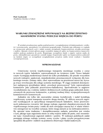 Piotr Gackowski Akademia Morska w Gdyni WARUNKI ZEWNĘTRZNE WPŁYWAJĄCE NA BEZPIECZEŃSTWO MANEWRÓW STATKU PODCZAS WEJŚCIA DO PORTU W artykule przedstawiono ogólny podział portów z uwzględnieniem ich funkcjonalności, wielkości i przeznaczenia, specjalności czy położenia geograficznego. Podziału tego dokonano ze względu na wyznaczenie głównych cech i zadań systemu zarządzania bezpieczeństwem ośrodka portowego i statków. Opisano również główne grupy czynników mających wpływ na bezpieczeństwo manewrów statków podczas podejścia do portu. Rozpatrując szczegółowo każdy z etapów wejścia statku do portu, zidentyfikowano specyficzne czynniki mające bezpośredni wpływ na bezpieczeństwo jednostek na każdym etapie, ze szczególnym uwzględnieniem przejścia statku torem wodnym i kanałem wewnątrzportowym. WPROWADZENIE Ustawiczny rozwój współczesnego transportu morskiego wynika z coraz to nowych typów ładunków wprowadzanych na światowe rynki. Nowe ładunki często wymagają modernizacji metod nie tylko przeładunku, ale przede wszystkim nowych rodzajów opakowań, niejednokrotnie przeznaczonych wyłącznie dla konkretnego towaru. Zmiany takie, choć wprowadzane na przestrzeni nawet lat, bywają wręcz rewolucyjne dla całego systemu morskiego. W ciągu ostatnich dziesięcioleci najlepszym przykładem takiej „rewolucji przewozowej” było wprowadzenie kontenerów jako jednostki przewozowo-ładunkowej. Spowodowało to najpierw wyodrębnienie się z rodziny statków drobnicowych osobnej grupy jednostek dostosowanych do przewozu kontenerów, a później osobnej klasy wyspecjalizowanych kontenerowców komorowych. Jednakże nie tylko tak zauważalne zmiany kształtowały i nadal kształtują współczesny system transportu towarów drogą morską. W obliczu nowych zagrożeń wynikających ze specyfikacji transportowanych ładunków, ilości przewożonych jednorazowo towarów lub innego rodzaju zagrożeń charakterystycznych dla współczesnego świata porty i statki do nich zawijające muszą być w stanie właściwie zareagować na wszelkie sytuacje, które mogą narazić je na niebezpieczeństwo. By sprostać temu trudnemu i skomplikowanemu zadaniu, potrzebna jest wiedza o tym, jakiego typu zagrożenia niesie ze sobą wejście statku do portu, oraz zrozumienie typu i konsekwencji zagrożeń statków i portów. W realizacji podobnych zadań pomagają różnego rodzaju systemy oceny ryzyka i plany ryzyka przygotowywane specjalnie dla portów i statków na podstawie obserwacji i badań naukowych. 26 ZESZYTY NAUKOWE AKADEMII MORSKIEJ W GDYNI, nr 69, czerwiec 2011 1. PODZIAŁ PORTÓW Przed zdefiniowaniem ryzyka czy zagrożenia dla portu i statku istotne jest zrozumienie tych pojęć oraz wprowadzenie ogólnego podziału portów. W literaturze fachowej port oznacza miejsce zawinięcia statków handlowych, gdzie dokonywany jest ich przeładunek i jednocześnie właściwa dystrybucja towarów w relacji nadawca–przewoźnik–odbiorca ładunku. Ściśle związana z takim określeniem portu jest definicja statku handlowego podana przez prof. Chuchlę – statek handlowy to statek czerpiący korzyści, np. majątkowe, ze swojej działalności [1]. Oznacza to, że zadaniem statków jest odpłatny transport ładunków przyjmowanych przez porty. Ważne dla dalszych rozważań jest wprowadzenie podziału portów. Jak już wspomniano, porty morskie zostały poddane daleko idącej specjalizacji w celu zmaksymalizowania obrotu towarami, a także – współcześnie – usługami. Dzięki takiemu rozwojowi handlu morskiego można dokonać wielu różnych podziałów portów, dla każdego przyjmując odmienne kryteria wyróżnienia. Dokonanie i wprowadzenie jak najbardziej szczegółowego podziału portów (rys. 1) ma na celu wskazanie różnych typów zagrożeń, często charakterystycznych wyłącznie dla jednego typu czy rodzaju portu, a w szczególnych przypadkach ładunku lub grupy ładunków obsługiwanych przez dany port, bazę czy terminal. Porty Podział geograficzny Naturalne Sztuczne Podział funkcyjny Mieszane P. handlowe Podział nawigacyjny P.pływowe Inne Rzeczne Na linii lądu Redowe P. feederowe P. rybackie P.bezpływowe Śródlądowe W głębi lądu Rzeczno-morskie P. bazowe P. wojenne P.płytkowodne Morskie Wysunięte w morze Redowo-zatokowe Terminale P. pasażerskie Głębokowodne Zatokowe Molowe Redowo-brzegowe Wyspowe Nasypowe Morsko-śródlądowe Atolowe Kontenerowe Masowe Turystyczne Mariny jachtowe Bazy Kontenerowe Osłonięte P. uniwersalne Odsłonięte P. eksportowe Promowe Masowe P. importowe P. specjalne Rys. 1. Ogólny podział portów [oprac. własne] P. Gackowski, Warunki zewnętrzne wpływające na bezpieczeństwo manewrów statku... 27 2. SYSTEM ZARZĄDZANIA BEZPIECZEŃSTWEM Po uwzględnieniu wszystkich różnic wpływających na powyższy podział portów, definiujący złożoność zagadnienia, można zdecydowanie stwierdzić, że nie ma dwóch identycznych portów. Co prawda można zaklasyfikować porty do poszczególnych rodzajów, jednakże zawsze pozostaną pewne elementy, wyróżniające dany ośrodek od pozostałych, nawet w obrębie jednego typu. Prowadzi to do logicznego wniosku, że plan zarządzania niebezpieczeństwem czy oceny ryzyka pewnych operacji jest najefektywniejszy, jeśli jest specjalnie zaprojektowany i stworzony dla jednego portu, jednego ośrodka. Wtedy jest najskuteczniejszy i najlepiej spełnia swoje zadanie. Obecnie przygotowuje się i tworzy kompletne plany oceny i zarządzania ryzykiem na wypadek wystąpienia jakiejkolwiek sytuacji kryzysowej. Porty i zarządy nimi kierujące chcą być jak najlepiej przygotowywane na każdą ewentualność (atak terrorystyczny, czy innego typu zagrożenie) niosącą ze sobą choćby najmniejsze ryzyko, czy sytuacje prowadzące do powstania owego ryzyka. Takie działania są nie tylko promowane przez organizacje morskie, jak np. IMO, ale i preferowane. Powodem takiego stanu