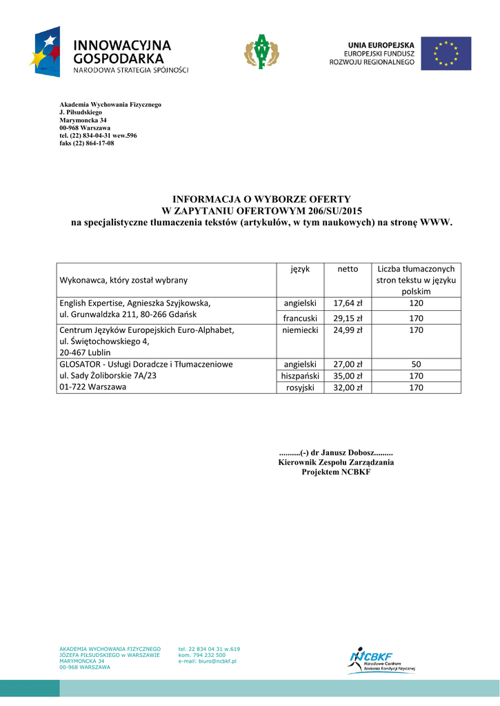 Akademia Wychowania Fizycznego J. Piłsudskiego Marymoncka 34 00-968 Warszawa tel. (22) 834-04-31 wew.596 faks (22) 864-17-08 INFORMACJA O WYBORZE OFERTY W ZAPYTANIU OFERTOWYM 206/SU/2015 na specjalistyczne tłumaczenia tekstów (artykułów, w tym naukowych) na stronę WWW. język netto angielski 17,64 zł Liczba tłumaczonych stron tekstu w języku polskim 120 francuski niemiecki 29,15 zł 24,99 zł 170 170 angielski hiszpański rosyjski 27,00 zł 35,00 zł 32,00 zł 50 170 170 Wykonawca, który został wybrany English Expertise, Agnieszka Szyjkowska, ul. Grunwaldzka 211, 80-266 Gdańsk Centrum Języków Europejskich Euro-Alphabet, ul. Świętochowskiego 4, 20-467 Lublin GLOSATOR - Usługi Doradcze i Tłumaczeniowe ul. Sady Żoliborskie 7A/23 01-722 Warszawa ..........(-) dr Janusz Dobosz......... Kierownik Zespołu Zarządzania Projektem NCBKF AKADEMIA WYCHOWANIA FIZYCZNEGO JÓZEFA PIŁSUDSKIEGO w WARSZAWIE MARYMONCKA 34 00-968 WARSZAWA tel. 22 834 04 31 w.619 kom. 794 232 500 e-mail: [email protected]