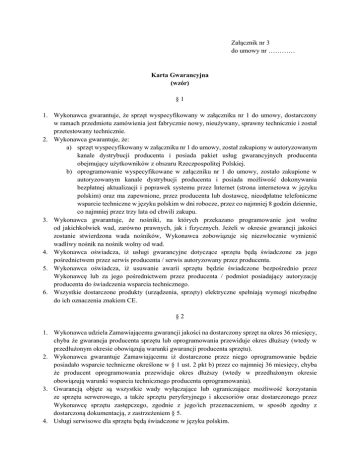 Załącznik nr 3 do umowy nr ………… Karta Gwarancyjna (wzór) §1 1. Wykonawca gwarantuje, że sprzęt wyspecyfikowany w załączniku nr 1 do umowy, dostarczony w ramach przedmiotu zamówienia jest fabrycznie nowy, nieużywany, sprawny technicznie i został przetestowany technicznie. 2. Wykonawca gwarantuje, że: a) sprzęt wyspecyfikowany w załączniku nr 1 do umowy, został zakupiony w autoryzowanym kanale dystrybucji producenta i posiada pakiet usług gwarancyjnych producenta obejmujący użytkowników z obszaru Rzeczpospolitej Polskiej. b) oprogramowanie wyspecyfikowane w załączniku nr 1 do umowy, zostało zakupione w autoryzowanym kanale dystrybucji producenta i posiada możliwość dokonywania bezpłatnej aktualizacji i poprawek systemu przez Internet (strona internetowa w języku polskim) oraz ma zapewnione, przez producenta lub dostawcę, nieodpłatne telefoniczne wsparcie techniczne w języku polskim w dni robocze, przez co najmniej 8 godzin dziennie, co najmniej przez trzy lata od chwili zakupu. 3. Wykonawca gwarantuje, że nośniki, na których przekazano programowanie jest wolne od jakichkolwiek wad, zarówno prawnych, jak i fizycznych. Jeżeli w okresie gwarancji jakości zostanie stwierdzona wada nośników, Wykonawca zobowiązuje się niezwłocznie wymienić wadliwy nośnik na nośnik wolny od wad. 4. Wykonawca oświadcza, iż usługi gwarancyjne dotyczące sprzętu będą świadczone za jego pośrednictwem przez serwis producenta / serwis autoryzowany przez producenta. 5. Wykonawca oświadcza, iż usuwanie awarii sprzętu będzie świadczone bezpośrednio przez Wykonawcę lub za jego pośrednictwem przez producenta / podmiot posiadający autoryzację producenta do świadczenia wsparcia technicznego. 6. Wszystkie dostarczone produkty (urządzenia, sprzęty) elektryczne spełniają wymogi niezbędne do ich oznaczenia znakiem CE. §2 1. Wykonawca udziela Zamawiającemu gwarancji jakości na dostarczony sprzęt na okres 36 miesięcy, chyba że gwarancja producenta sprzętu lub oprogramowania przewiduje okres dłuższy (wtedy w przedłużonym okresie obowiązują warunki gwarancji producenta sprzętu). 2. Wykonawca gwarantuje Zamawiającemu iż dostarczone przez niego oprogramowanie będzie posiadało wsparcie techniczne określone w § 1 ust. 2 pkt b) przez co najmniej 36 miesięcy, chyba że producent oprogramowania przewiduje okres dłuższy (wtedy w przedłużonym okresie obowiązują warunki wsparcia technicznego producenta oprogramowania). 3. Gwarancją objęte są wszystkie wady wyłączające lub ograniczające możliwość korzystania ze sprzętu serwerowego, a także sprzętu peryferyjnego i akcesoriów oraz dostarczonego przez Wykonawcę sprzętu zastępczego, zgodnie z jego/ich przeznaczeniem, w sposób zgodny z dostarczoną dokumentacją, z zastrzeżeniem § 5. 4. Usługi serwisowe dla sprzętu będą świadczone w języku polskim. 5. Okres gwarancji i pozostałe zobowiązania wynikające z Karty Gwarancyjnej rozpoczynają bieg od następnego dnia po dokonaniu odbioru końcowego, o którym mowa w § 5 ust. 5 umowy. Zamawiający może dochodzić roszczeń z tytułu gwarancji także po okresie jej obowiązywania jeżeli zgłosił wadę przed upływem tego okresu. 6. Wykonawca, w terminach określonych w umowie, przekaże Zamawiającemu ewentualne dokumenty zawierające szczegółowe warunki gwarancji udzielanej przez producenta dostarczonego sprzętu. 7. Wykonawca przejmuje na siebie wszelkie obowiązki związane z ewentualną koniecznością rejestracji sprzętu na stronach internetowych producentów w celu uzyskania gwarancji producenta. §3 1. Wykonawca przejmuje na siebie wszelkie obowiązki wynikające ze zgłoszenia awarii i jej przekazania podmiotom, o którym mowa w § 1 ust. 4 i 5. 2. Zamawiający może zgłaszać nieprawidłowe działanie sprzętu i oprogramowania (awarię) całodobowo – 24 godziny na dobę, 7 dni w tygodniu, 365 dni w roku. 3. Zamawiający dokonuje zgłoszenia awarii na numer faksu Wykonawcy: …………… lub na adres e-mail: ……………. W razie zmiany numeru faksu lub adresu e-mail Wykonawca zobowiązany jest do bezzwłocznego wskazania nowego (aktualnego) numeru. Korespondencja kierowana na ostatni aktualny numer faksu lub adres e-mail będzie uznana za doręczoną. 4. Po dokonaniu zgłoszenia awarii przez Zamawiającego, Wykonawca potwierdzi w terminie do następnego dnia roboczego od jej przyjęcie za pomocą poczty elektronicznej na adres [email protected]. 5. Wykonawca jest zobowiązany do przystąpienia do akcji serwisowej w terminie: a) na następny dzień roboczy od zgłoszenia awarii, jeśli zgłoszenie nastąpiło do godziny 15:00, b) w ciągu 2 dni roboczych od zgłoszenia awarii, jeśli zgłoszenie nastąpiło po godzinie 15:00. §4 1. W okresie gwarancji Wykonawca zobowiązany jest nieodpłatnie usuwać awarię lub w przypadku braku możliwości naprawy, wymieniać wadliwy sprzęt na nowy, wolny od wad o parametrach technicznych równoważnych lub lepszych niż wymieniany (spełniający wszystkie wymagania opisane przez Zamawiającego w SIWZ oraz umowie). 2. Naprawy będą dokonywane w miejscu eksploatacji sprzętu. W przypadku niemożności dokonania naprawy na miejscu i konieczności dostarczenia sprzętu do punktu serwisowego, koszty dostarczenia uszkodzonego sprzętu do punktu serwisowego oraz z punktu serwisowego do miejsca eksploatacji sprzętu oraz koszty jego ponownej instalacji i konfiguracji pokrywa Wykonawca. 3. Serwisant przybywa na miejsce i kontynuuje czynności serwisowe aż do momentu uzyskania pełnej funkcjonalności sprzętu lub do momentu osiągnięcia widocznej poprawy. Dopuszczalne jest zawieszenie czynności naprawczych, jeśli potrzebne są dodatkowe materiały lub informacje, ale praca zostaje wznowiona natychmiast po ich uzyskaniu. Podczas usuwania awarii lub stosowania rozwiązania zastępczego Zamawiający wymaga stosowania jedynie komponentów o parametrach równoważnych lub l