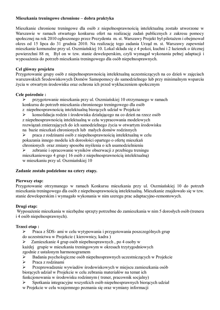 Mieszkania treningowe chronione – dobra praktyka Mieszkanie chronione treningowe dla osób z niepełnosprawnością intelektualną zostało utworzone w Warszawie w ramach otwartego konkursu ofert na realizację zadań publicznych z zakresu pomocy społecznej na rok 2010 ogłoszonego przez Prezydenta m. st. Warszawy Projekt był pilotażem i obejmował okres od 15 lipca do 31 grudnia 2010. Na realizację tego zadania Urząd m. st. Warszawy zapewniał mieszkanie komunalne przy ul. Oszmiańskiej 10. Lokal składa się z 4 pokoi, kuchni i 2 łazienek o ůŕcznej powierzchni 88 m˛ Był on w tzw. stanie deweloperskim, czyli wymagał wykonania pełnej adaptacji i wyposażenia do potrzeb mieszkania treningowego dla osób niepełnosprawnych. Cel główny projektu Przygotowanie grupy osób z niepełnosprawnością intelektualną uczestniczących na co dzień w zajęciach warszawskich Środowiskowych Domów Samopomocy do samodzielnego lub przy minimalnym wsparciu życia w otwartym środowisku oraz ochrona ich przed wykluczeniem społecznym Cele pośrednie : przygotowanie mieszkania przy ul. Oszmiańskiej 10 otrzymanego w ramach konkursu do potrzeb mieszkania chronionego treningowego dla osób z niepełnosprawnością intelektualną biorących udział w Projekcie konsolidacja rodzin i środowiska działającego na co dzień na rzecz osób z niepełnosprawnością intelektualną w celu wypracowania modelowych rozwiązań zmierzających do ich samodzielnego życia w otwartym środowisku na bazie mieszkań chronionych lub małych domów rodzinnych praca z rodzinami osób z niepełnosprawnością intelektualną w celu pokazania innego modelu ich dorosłości opartego o ofertę mieszkań chronionych oraz zmiany sposobu myślenia o ich usamodzielnieniu zebranie i opracowanie wyników obserwacji z przebiegu treningu mieszkaniowego 4 grup ( 16 osób z niepełnosprawnością intelektualną) w mieszkaniu przy ul. Oszmiańskiej 10 Zadanie zostało podzielone na cztery etapy. Pierwszy etap: Przygotowanie otrzymanego w ramach Konkursu mieszkania przy ul. Oszmiańskiej 10 do potrzeb mieszkania treningowego dla osób z niepełnosprawnością intelektualną. Mieszkanie znajdowało się w tzw. stanie deweloperskim i wymagało wykonania w nim szeregu prac adaptacyjno-remontowych. Drugi etap: Wyposażenie mieszkania w niezbędne sprzęty potrzebne do zamieszkania w nim 5 dorosłych osób (trenera i 4 osób niepełnosprawnych). Trzeci etap : Praca z ŚDS- ami w celu wytypowania i przygotowania poszczególnych grup do uczestnictwa w Projekcie ( kierownicy, kadra ) Zamieszkanie 4 grup osób niepełnosprawnych , po 4 osoby w każdej grupie w mieszkaniu treningowym w okresach trzytygodniowych zgodnie z ustalonym harmonogramem Badania psychologiczne osób niepełnosprawnych uczestniczących w Projekcie Praca z rodzinami Przeprowadzenie wywiadów środowiskowych w miejscu zamieszkania osób biorących udział w Projekcie w celu zebrania materiałów na temat ich funkcjonowania w środowisku rodzinnym ( trener, pracownik socjalny) Spotkania integracyjne wszystkich osób niepełnosprawnych biorących udział w Projekcie w celu wzajemnego poznania się oraz wymiany informacji i doświadczeń z przebiegu treningu mieszkaniowego Przygotowanie dokumentacji indywidualnej z przebiegu treningu dotyczącej każdego uczestnika projektu Czwarty etap: Podsumowanie wyników Projektu oraz ich omówienie z rodzinami i kierownikami ŚDS-ów Zaplanowanie dalszych działań w celu kontynuacji Projektu i rozszerzenia go na kolejne grupy osób z niepełnosprawnością intelektualna wymagające tego rodzaju wsparcia terapeutycznego. Opis szczegółowy przebiegu treningu mieszkaniowego : Każda 4 osobowa grupa przebywała na terenie mieszkania treningowego przez okres trzech tygodni. Grupą opiekowało się na zmianę dwóch trenerów. Trener główny i trener wspierający. Przez okres pobytu w mieszkaniu treningowym uczestnicy treningu nie kontaktowali się ze swoimi rodzinami. Wyjątkiem były rozmowy telefoniczne, ale też w ograniczonej ilości. Pobyt w mieszkaniu treningowym zaplanowany został tak by osoby w nim uczestniczące miały możliwość nabycia umiejętności z zakresu samodzielnego funkcjonowania. Trener na początku każdego kolejnego turnusu otrzymywał komplet informacji o każdej osobie uczestniczącej w danej grupie. Sam również miał możliwość zebrania informacji od rodziny i samej osoby niepełnosprawnej odwiedzając ją przed turnusem w jej środowisku rodzinnym. Te zebrane informacje były punktem wyjścia do zaplanowania indywidualnego toku treningu dla każdej z osób. Każda z nich miała bowiem inne umiejętności z zakresu samoobsługi. Należało więc pracować nad wzmocnieniem i utrwaleniem tych już posiadanych i nauką nowych ukierunkowanych głównie na samodzielne wykonywanie wszystkich czynności domowych. Trening obejmował : naukę samodzielnego mycia, golenia, dbania o higienę, stosowania środków higienicznych, kosmetykę, makijaż, dbanie o włosy, paznokcie ( dostosowany do płci uczestników grupy); naukę samodzielnego dbania o porządek w mieszkaniu, toalecie, w rzeczach osobistych; naukę przygotowywania posiłków ( śniadania, obiady, kolacje ) przygotowywanie kanapek, pieczenie, gotowanie, smażenie, itd. oraz ich estetycznego wspólnego spożywania; naukę sprzątania po posiłkach; naukę dbania o swoje ubranie : pranie, prasowanie, drobne naprawy; naukę zaplanowania zakupu potrzebnych do funkcjonowania grupy, produktów żywnościowych, środków czystości i higieny oraz zakup ich w sklepach osiedlowych, Marketach, na osiedlowym bazarze; naukę posługiwania się środkami płatniczymi; naukę poruszania się w otwartym środowisku : środki komunikacji miejskiej, spacery, zwiedzanie miasta, wystawy, galerie, kawiarnie, kina, teatr, wycieczki ; naukę załatwiania spraw w instytucjach : poczta, administracja, bank , ośrodki zdrowia; naukę poprawnego zachowania w miejscach publicz