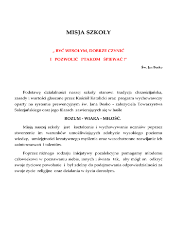MISJA SZKOŁY „ BYĆ WESOŁYM, DOBRZE CZYNIĆ I POZWOLIĆ PTAKOM ŚPIEWAĆ !” Św. Jan Bosko Podstawę działalności naszej szkoły stanowi tradycja chrześcijańska, zasady i wartości głoszone przez Kościół Katolicki oraz program wychowawczy oparty na systemie prewencyjnym św. Jana Bosko - założyciela Towarzystwa Salezjańskiego oraz jego filarach zawierających się w haśle ROZUM - WIARA - MIŁOŚĆ. Misją naszej szkoły jest kształcenie i wychowywanie uczniów poprzez stworzenie im warunków umożliwiających zdobycie wysokiego poziomu wiedzy, umiejętności kreatywnego myślenia oraz wszechstronne rozwijanie ich zainteresowań i talentów. Poprzez różnego rodzaju inicjatywy pozalekcyjne pomagamy młodemu człowiekowi w poznawaniu siebie, innych i świata tak, aby mógł on odkryć swoje życiowe powołanie i był zdolny do podejmowania odpowiedzialności za swoje życie religijne oraz działania w życiu dorosłym. WIZJA SZKOŁY Podstawą i odniesieniem w naszym systemie edukacyjnym są wartości chrześcijańskie Szkoła zapewnia swoim uczniom integralny rozwój intelektu, wiary i sfery emocjonalnej Szkoła wychowuje młodzież świadomą swojej tożsamości jako chrześcijanina, człowieka i Polaka Szkoła stwarza warunki sprzyjające wszechstronnemu rozwojowi ucznia, jego wiedzy i umiejętności Szkoła dba o wysoką jakość nauczania i wychowania Szkoła jest przyjazna i bezpieczna dla uczniów Szkoła angażuje młodzież w różnego rodzaju inicjatywy pozaszkolne i buduje w nich poczucie przynależności do wspólnoty szkolnej Szkoła promuje osiągnięcia i sukcesy swoich wychowanków Szkoła jest otwarta na dialog i potrzeby uczniów oraz ich Rodziców Szkoła współpracuje ze środowiskiem lokalnym, uczelniami wyższymi oraz innymi instytucjami mającymi wpływ na rozwój edukacyjny młodzieży. Pragniemy, by uczeń naszej szkoły: Był świadomy swoich talentów i własnej wartości Miał odwagę przyznawać się do wyznawanych wartości Potrafił krytycznie interpretować otaczającą go rzeczywistość Dążył do zdobywania wiedzy i doskonalenia własnych umiejętności Znał języki obce w stopniu umożliwiającym swobodne komunikowanie się Rozwijał swoje pasje i zainteresowania Był człowiekiem szczęśliwym i ciekawym świata Dbał o swoje zdrowie fizyczne poprzez różnego rodzaju formy aktywności sportowej i turystycznej Dbał o środowisko naturalne Podejmował odpowiedzialność za siebie i innych Charakteryzował się wysoką kulturą osobistą Szanował godność drugiego człowieka Dbał o swoje życie moralne i religijne