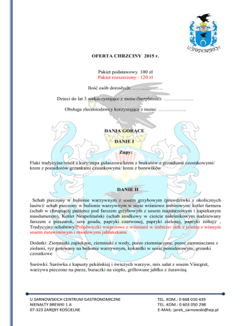 OFERTA CHRZCINY 2015 r. Pakiet podstawowy 100 zł Pakiet rozszerzony : 120 zł Ilość osób dorosłych: ……………… Dzieci do lat 3 niekorzystające z menu (bezpłatnie): ……………… Obsługa zleceniodawcy korzystająca z menu: …………….. DANIA GORĄCE DANIE I Zupy: Flaki tradycyjne/rosół z kury/zupa gulaszowa/krem z brokułów z grzankami czosnkowymi/ krem z pomidorów grzankami czosnkowymi/ krem z borowików DANIE II Schab pieczony w bulionie warzywnym z sosem grzybowym (prawdziwki z okolicznych lasów)/ schab pieczony w bulionie warzywnym w sosie wiśniowo imbirowym/ kotlet farmera (schab w chrupiącej panierce pod farszem grzybowym z sosem majonezowym i zapiekanym masdamerem), Kotlet Neapolitański (schab środkowy w cieście naleśnikowym nadziewany farszem z pieczarek, sera gouda, papryki czerwonej, papryki zielonej, papryki żółtej)/ , Tradycyjny schabowy/Polędwiczki wieprzowe z wiśniami w imbirze/ stek z jelenia z winnym sosem żurawinowym i miodowymi jabłuszkami Dodatki: Ziemniaki zapiekane, ziemniaki z wody, puree ziemniaczane, puree ziemniaczane z ziołami, ryż gotowany na bulionie warzywnym, kokardki w sosie pomidorowym, grzanki czosnkowe Surówki: Surówka z kapusty pekińskiej i świeżych warzyw, mix sałat z sosem Vinegret, warzywa pieczone na parze, buraczki na ciepło, grillowane jabłko z żurawiną U SARNOWSKICH CENTRUM GASTRONOMICZNE NIENAŁTY BREWKI 1 A 07-323 ZARĘBY KOŚCIELNE TEL. KOM.: 0 668 010 439 TEL. KOM.: 0 603 050 298 E-MAIL: [email protected] DANIE III „Róg obfitości” potrawy regionalne serwowane przez szefa kuchni na sali (możliwość wyboru 1 potrawy z każdej pozycji ) 1.pierogi z mięsem/ pierogi z kapustą i grzybami/ pierogi ruskie 2.kruche żeberka w sosie miodowo musztardowym/karkówka w sosie grzybowo paprykowo pomidorowym/gołąbki/ 3.baba ziemniaczana, kołduny, pyzy z mięsem, DANIE IV pierś kurczaka w chrupiącej miodowej panierce, pierś kurczaka pieczona na parze w bulinie warzywnym/ stół szwedzki pełen przysmaków drobiowych (skrzydełka kurczaka faszerowane bakaliami lub piersią kurczaka i koperkiem, pierś kurczaka w chrupiącej miodowej panierce lub pierś pieczona na parze w bulionie warzywnym, pieczone udko kurczaka w marynacie ziłowej Dodatki: Ziemniaki zapiekane, ziemniaki z wody, puree ziemniaczane, puree ziemniaczane z ziołami, ryż gotowany na bulionie warzywnym, kokardki w sosie pomidorowym Surówki: Surówka z kapusty pekińskiej i świeżych warzyw, mix sałat z sosem Vinegret, warzywa pieczone na parze, buraczki na ciepło, grillowane jabłko z żurawiną Zimne przekąski (8 do wyboru) 1. Półmisek wędlin przyrządzonych po staropolsku 2. Tatar staropolski/ tatar z łososia 3. Medaliony drobiowe nadziewane pieczarkami i włoszczyzną z sosem pomidorowo paprykowym/ galaretka wieprzowa z octem i sokiem cytrynowym 4. Pasztet domowy z pieczonym boczkiem/schab po warszawsku/ Tortilla 5. Jajka w majonezie z łososiem/Jajka faszerowane U SARNOWSKICH CENTRUM GASTRONOMICZNE NIENAŁTY BREWKI 1 A 07-323 ZARĘBY KOŚCIELNE TEL. KOM.: 0 668 010 439 TEL. KOM.: 0 603 050 298 E-MAIL: [email protected] 6. Carpaccio z polędwicy wołowej/Ryba po grecku/Pieczarki faszerowane z chrzanem i koperkiem/Śledź w trzech smakach (śledź miodowo rodzynkowy, śledź klasyczny w oleju z cebulą, śledź Oli (jogurt naturalny, jabłko, czerwona cebula, koperek) 7. Pomidory z mozarellą i pesto z bazylii 8. Sałatki Sałatka jarzynowa (klasyczna)/Sałatka pieczarkowa/Sałatka kebabowa/Sałatka Słodkie szaleństwo (kukurydza, ananas, seler, szynka)/ Sałatka z roszponki, kiełków lucerny i wędzonego bekonu w sosie miodowo musztardowym/ sałatka grecka/ Sałatka z roszponki z zapiekanym camembertem, grejpfrutem, kiełkami słonecznika i sosem miodowo musztardowym DODATKI: Ciasto (patery na stołach/Stół słodki) Kawa, herbata (no limit) Napoje, soki (pepsi, 7up,mirinda) (no limit) Owoce *Informujemy iż straty spowodowane przez dzieci pozostające bez opieki rodziców, pokrywane są przez zleceniodawcę przyjęcia. U SARNOWSKICH CENTRUM GASTRONOMICZNE NIENAŁTY BREWKI 1 A 07-323 ZARĘBY KOŚCIELNE TEL. KOM.: 0 668 010 439 TEL. KOM.: 0 603 050 298 E-MAIL: [email protected]